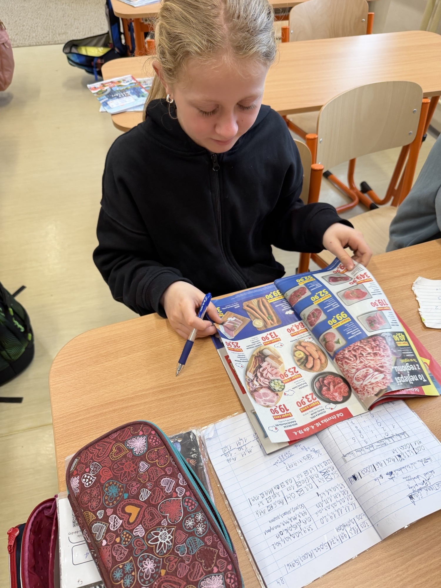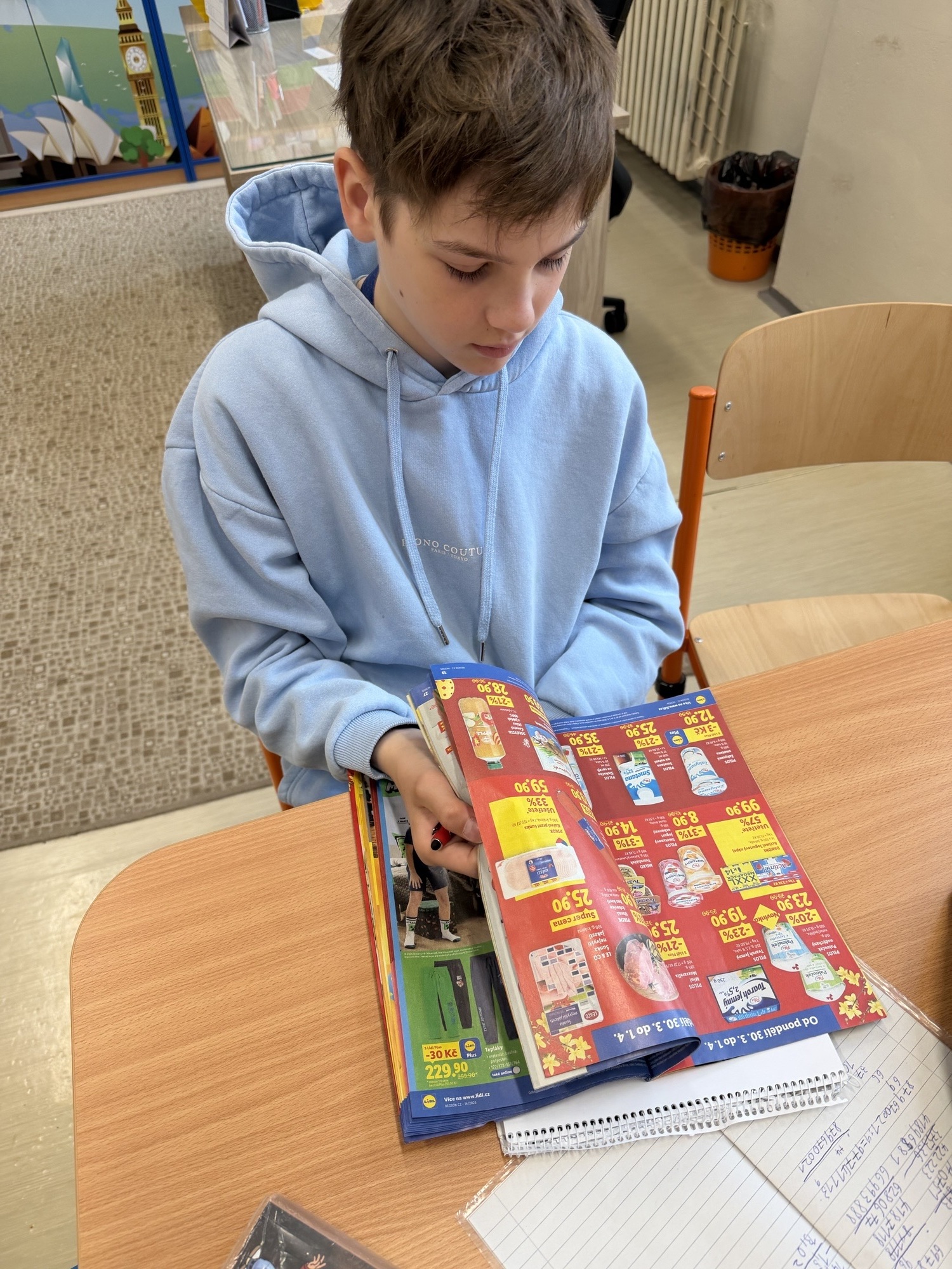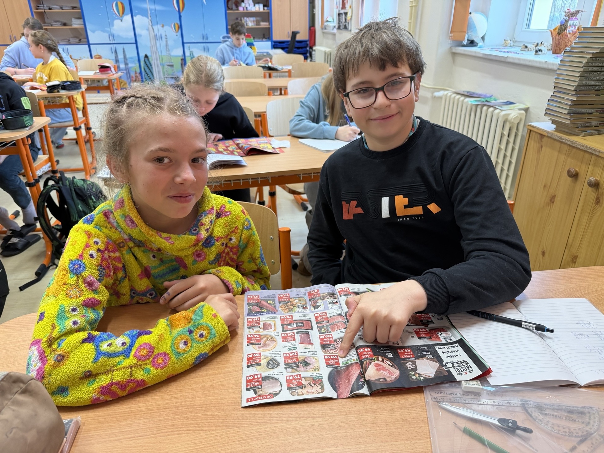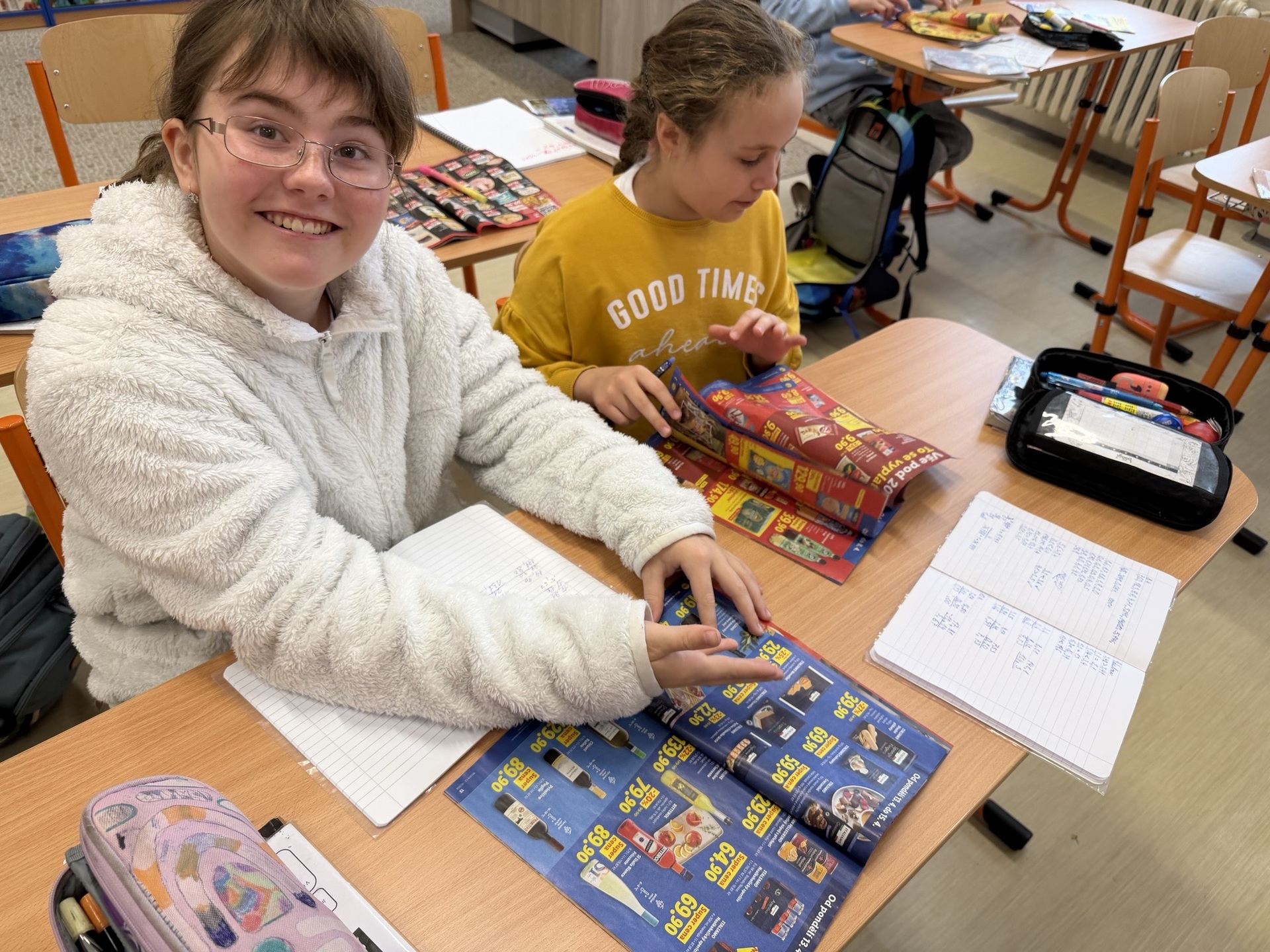 Aby si žáci učivo lépe osvojili, pracovali s letáky z obchodů, ve kterých „nakupovali“ různé zboží. Sčítali cenovky vybraných produktů a zkoušeli sestavit nákup tak, aby se vešli do předem dané částky.