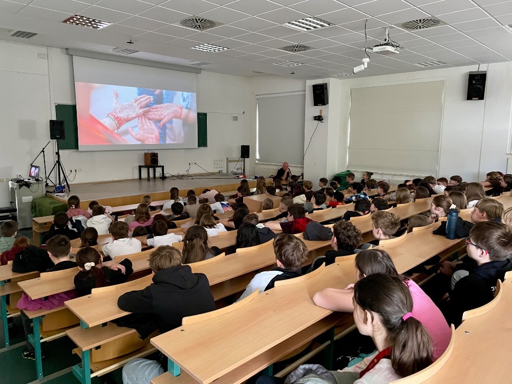 Projekce nás zavedla například do Váránasí, jednoho z nejposvátnějších měst Indie, kde se odehrávají tradiční rituály na březích Gangy. Průvodce nám přiblížil základy hinduismu, nejrozšířenějšího náboženství Indie, a ukázal, jak víra ovlivňuje každodenní život obyvatel. Stali jsme se svědky festivalu Holi – svátku barev, radosti a přátelství – a seznámili se s dopravou v Indii i mnoha dalšími zajímavostmi. Nechyběla ani dobrodružná část. Poznali jsme zapomenuté kmeny severovýchodní Indie, včetně legendárních lovců lebek.