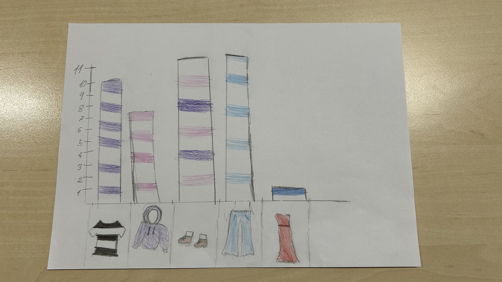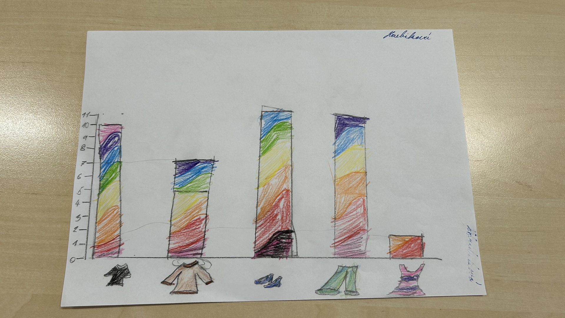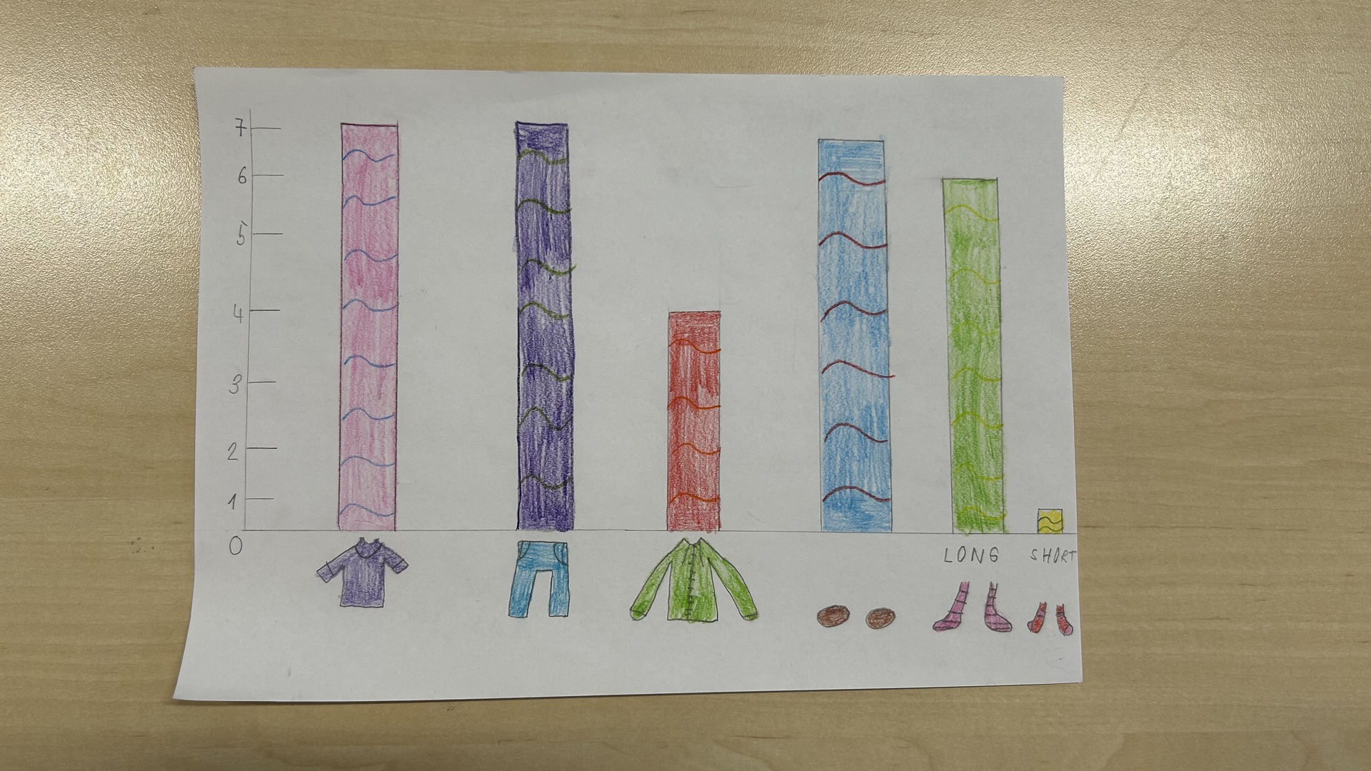 Po důkladném procvičení jsme na téma navázali netradiční aktivitou – prací se sloupcovými grafy. Žáci měli za úkol zaznamenat počet jednotlivých kusů oblečení do vlastního grafu. Každý si tak vytvořil přehled o tom, kolik máme ve třídě například triček, kalhot nebo mikin.
