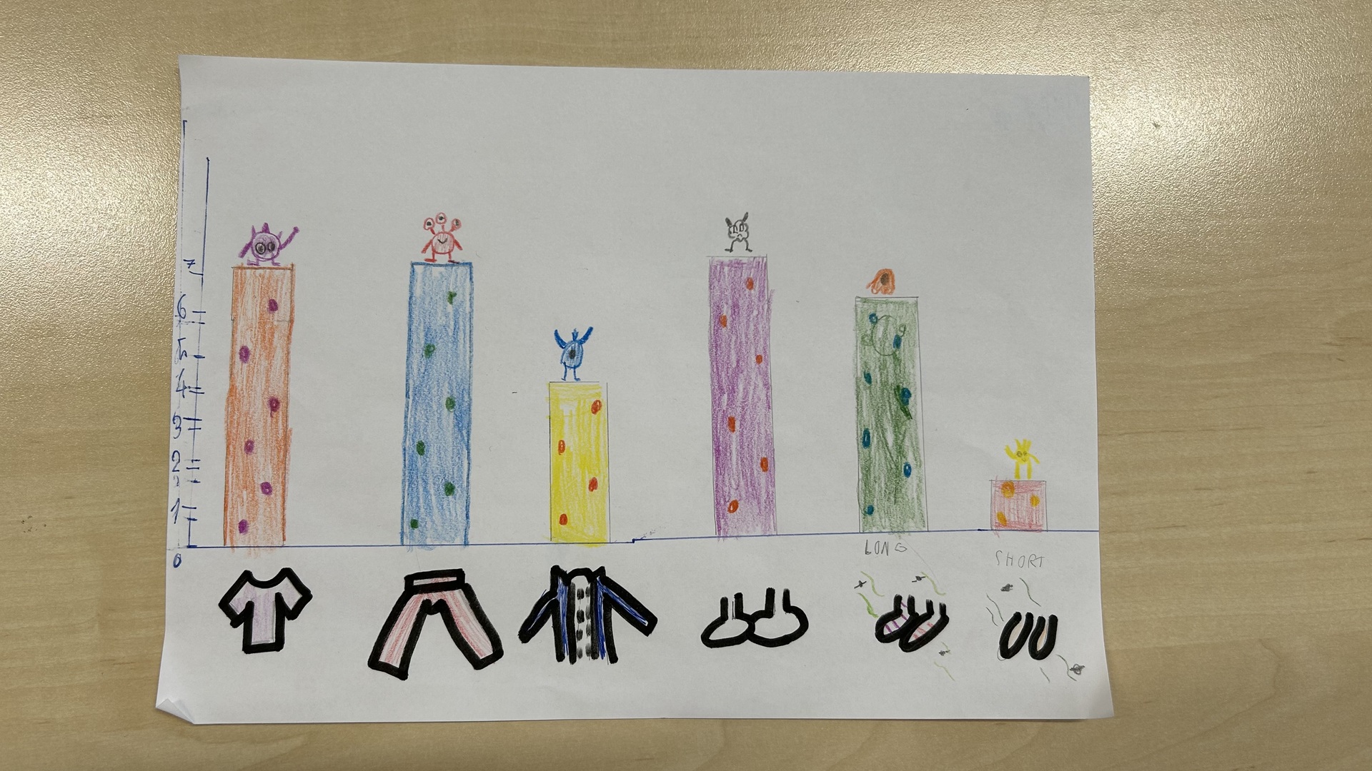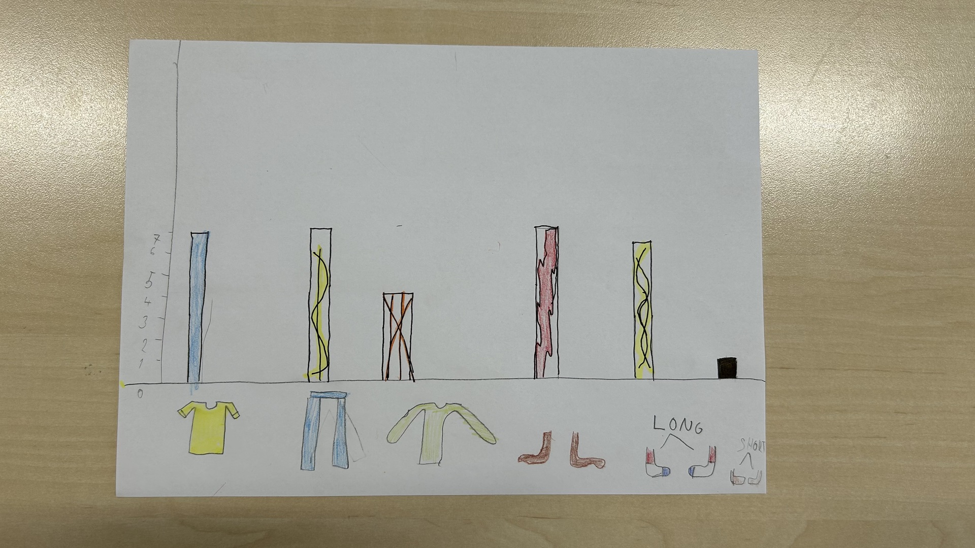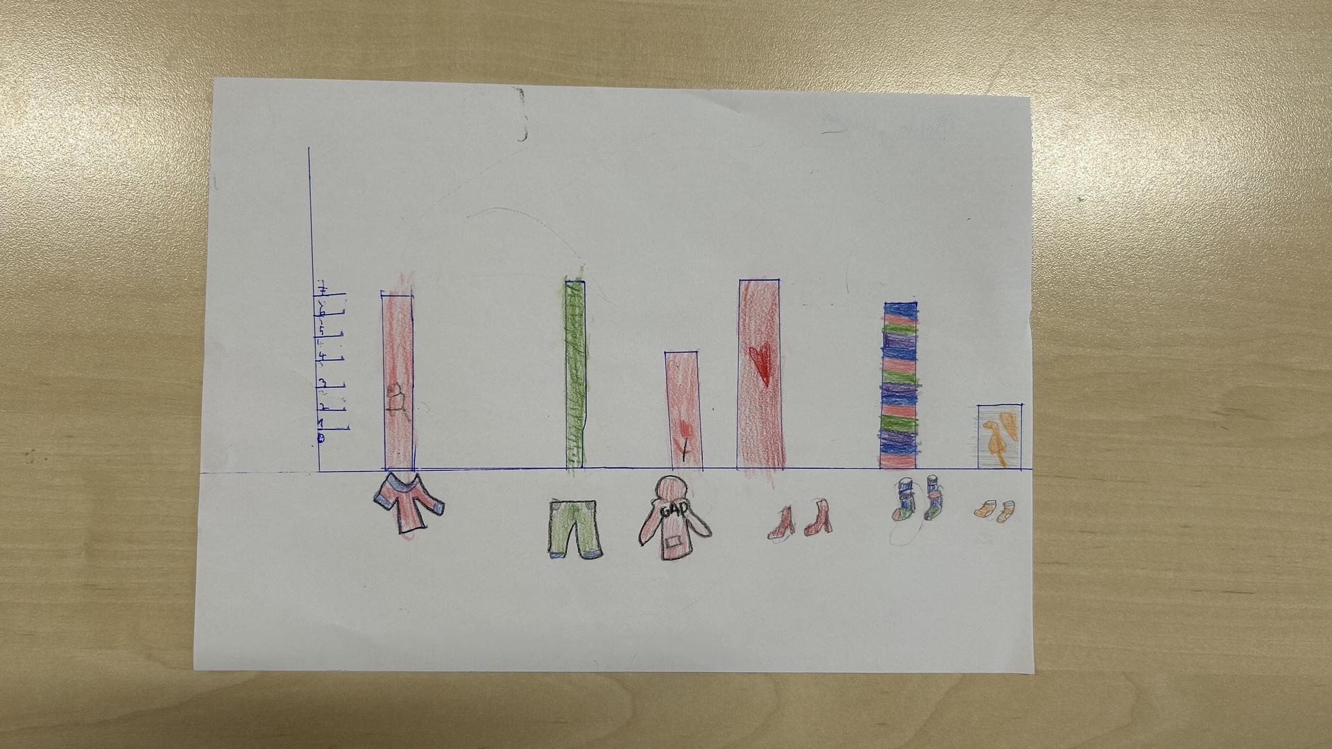 Po důkladném procvičení jsme na téma navázali netradiční aktivitou – prací se sloupcovými grafy. Žáci měli za úkol zaznamenat počet jednotlivých kusů oblečení do vlastního grafu. Každý si tak vytvořil přehled o tom, kolik máme ve třídě například triček, kalhot nebo mikin.