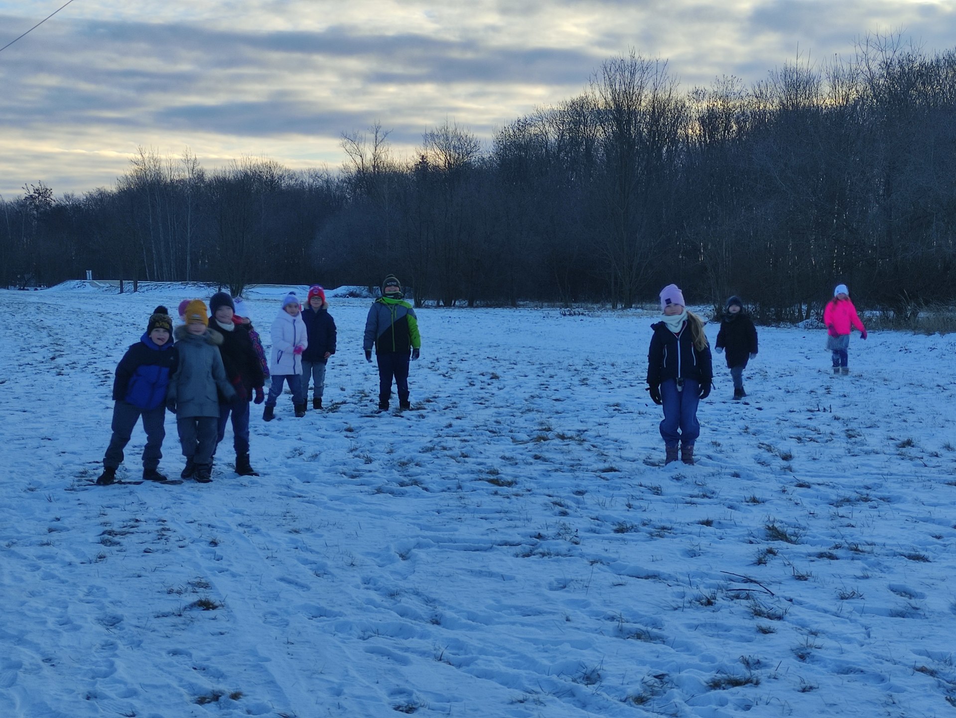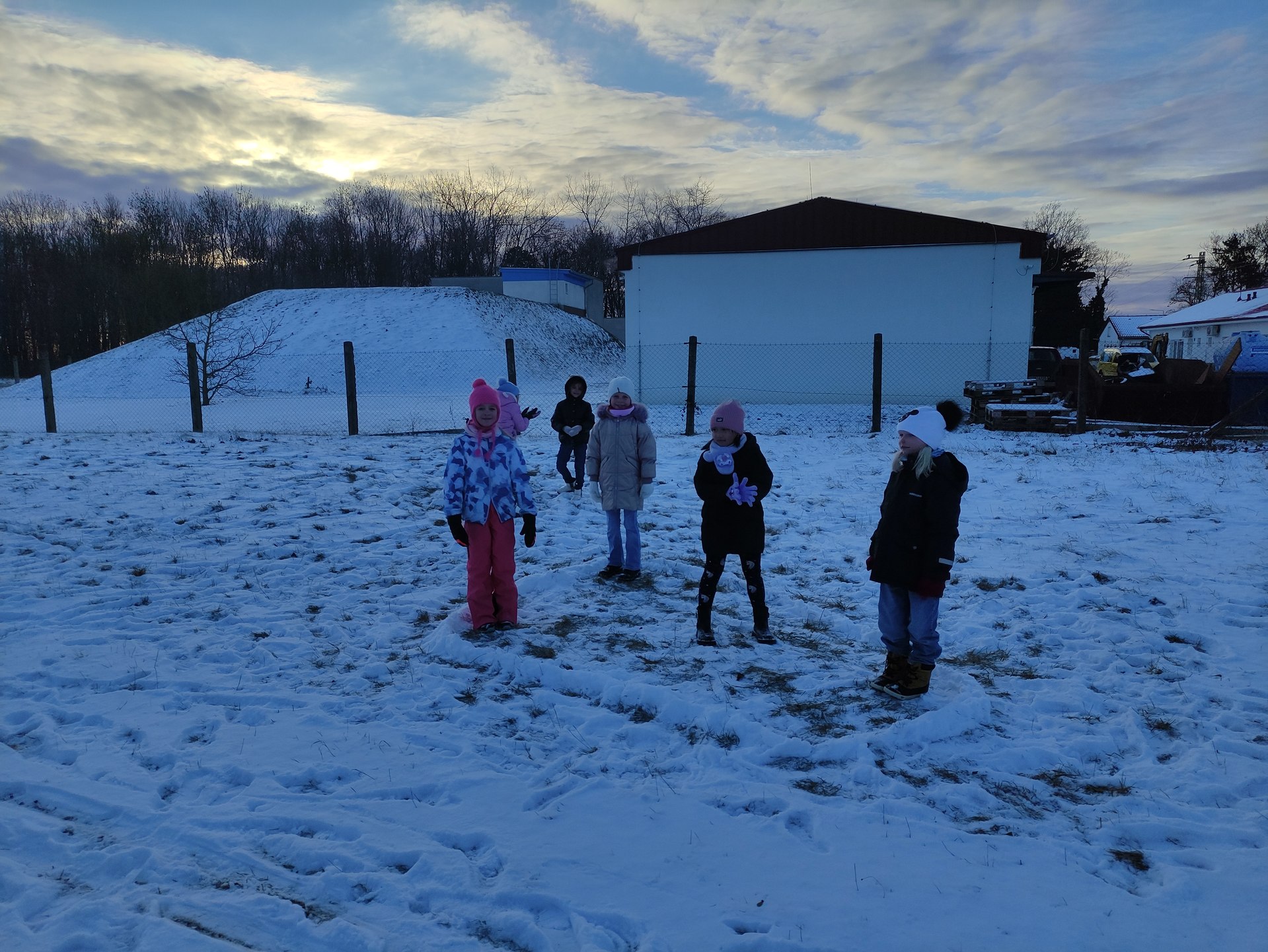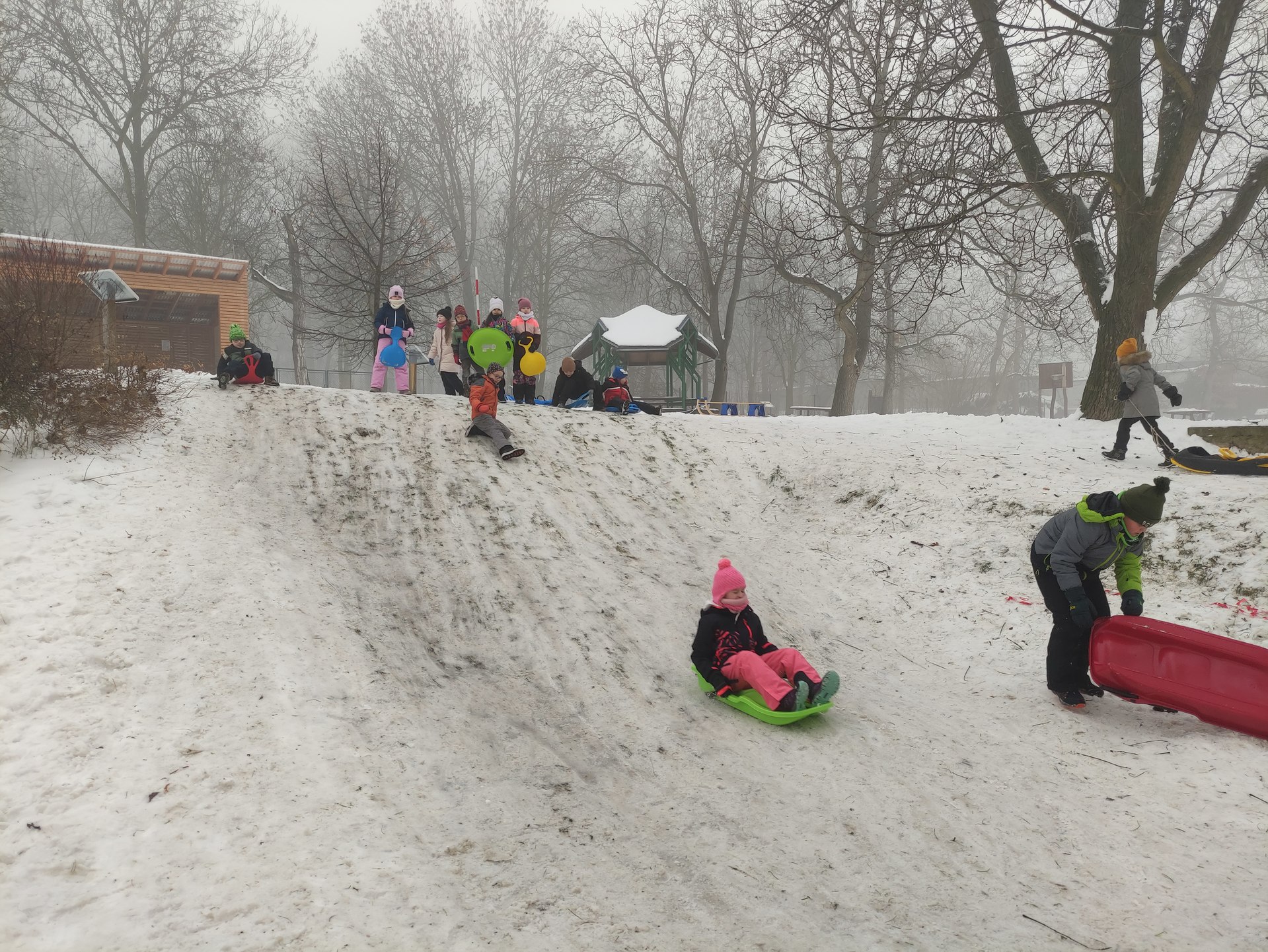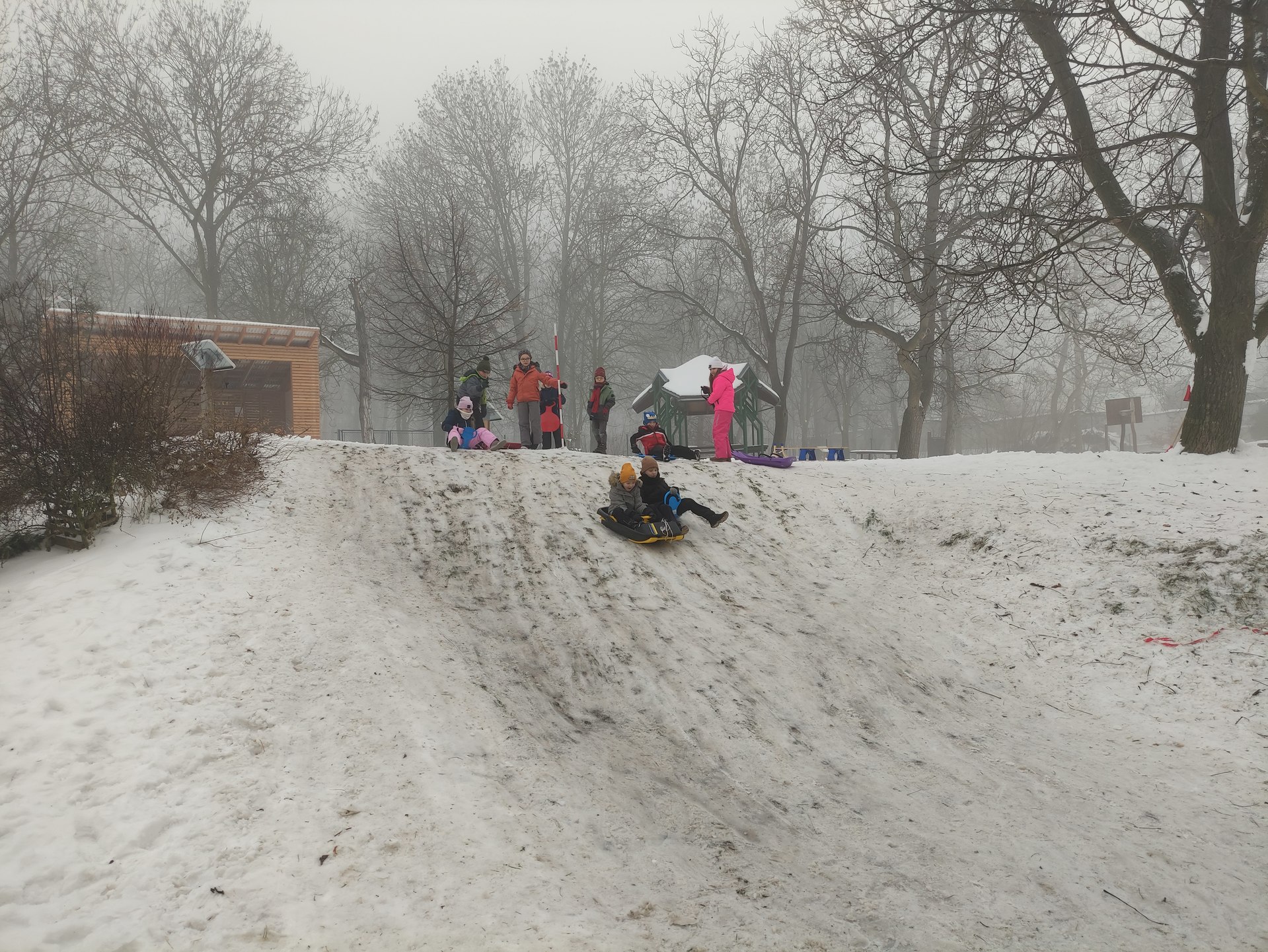 Zabavili jsme se nejen házením koulí do dálky, ale hlavně jsme využili boby, lopaty a sáně, které jsme si přinesli z domova.