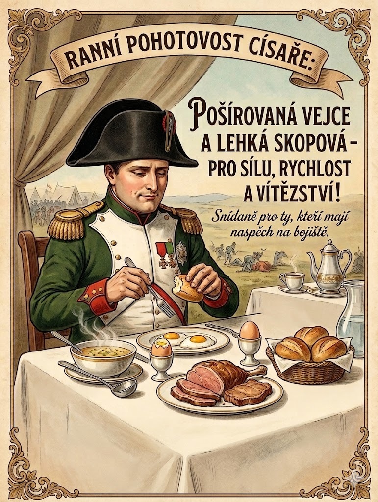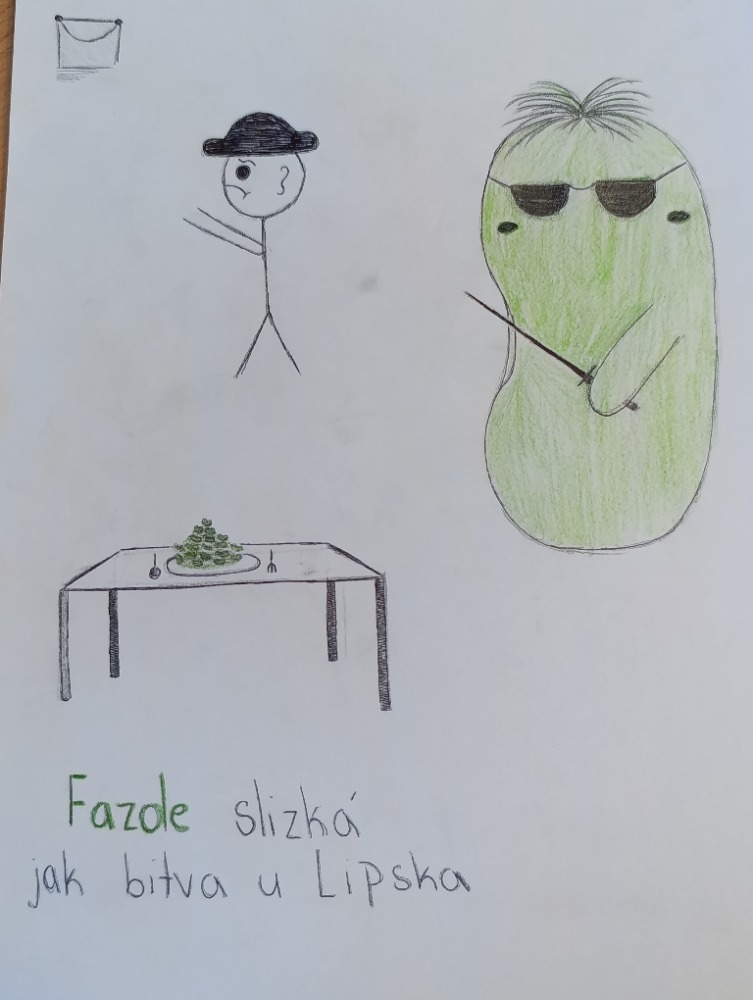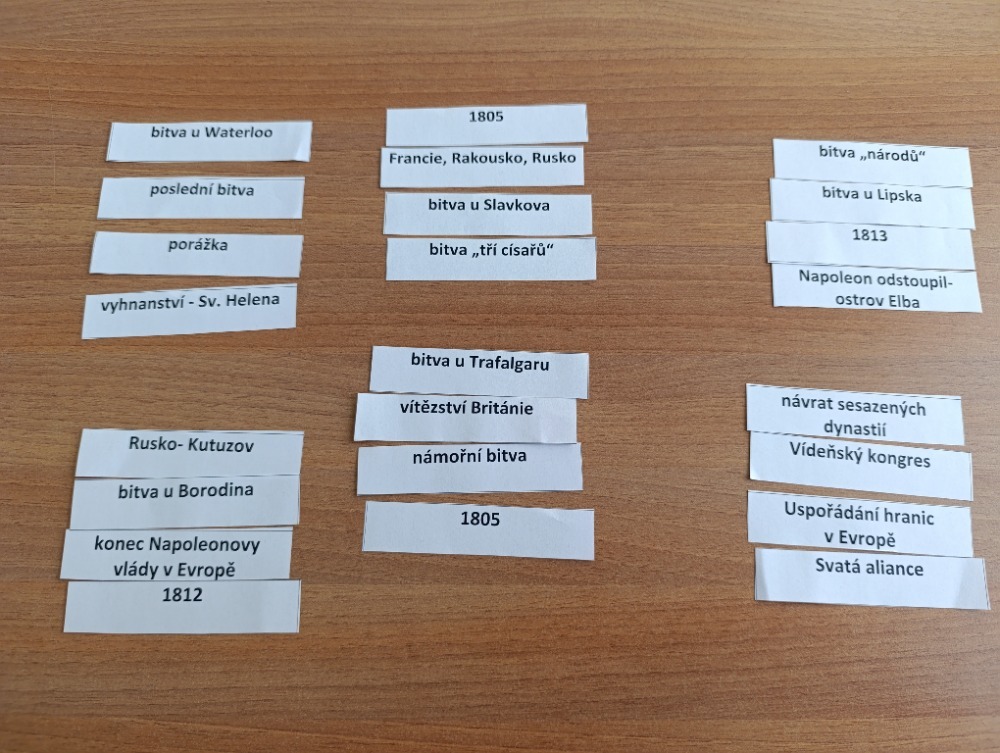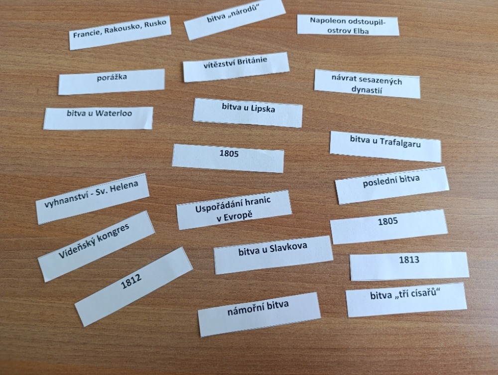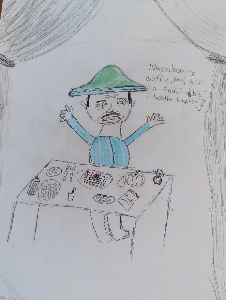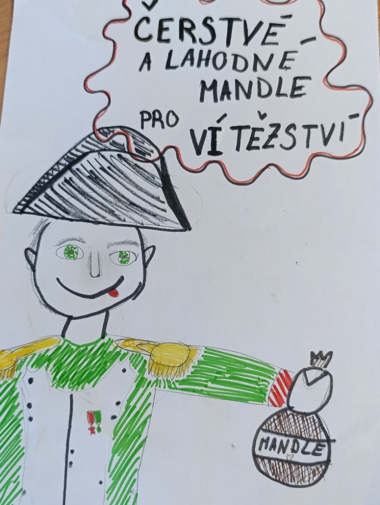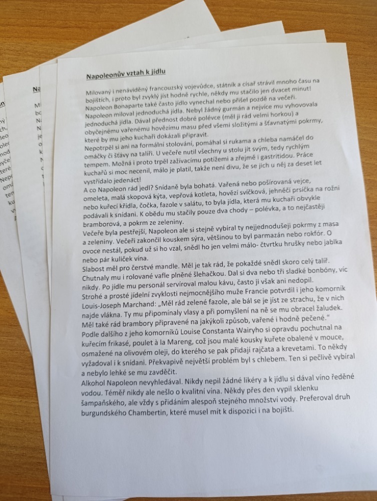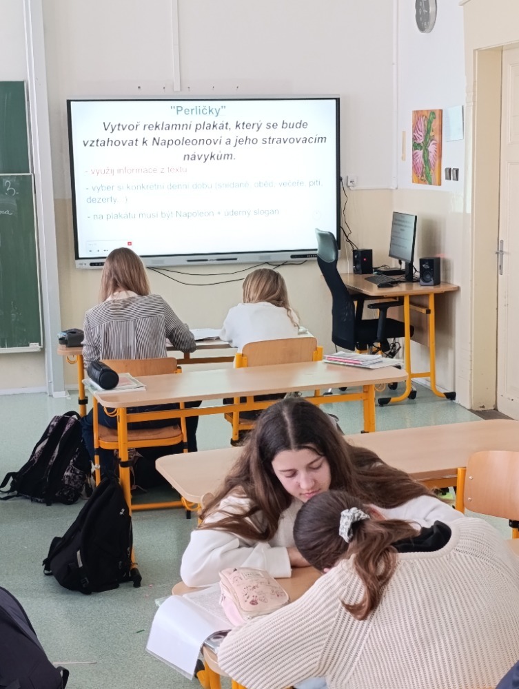Hodina byla zakončena zábavnou a tvořivou aktivitou. Žáci obdrželi text o Napoleonově jídelníčku, který jim přiblížil tuto historickou osobnost z netradičního úhlu pohledu. Každá skupina si poté vybrala jednu informaci a na jejím základě vytvořila reklamní plakát podle zadaných kritérií. Aktivita podpořila porozumění textu, rozvíjela kreativitu a zároveň žákům ukázala, že i slavní vojevůdci byli lidé s běžnými potřebami, jako je například jídlo. Věděli jste třeba, že Napoleon miloval mandle a potrpěl si na bohaté snídaně? Možná právě v těchto každodenních návycích se skrýval jeden z klíčů k jeho vítězstvím…kdo ví?