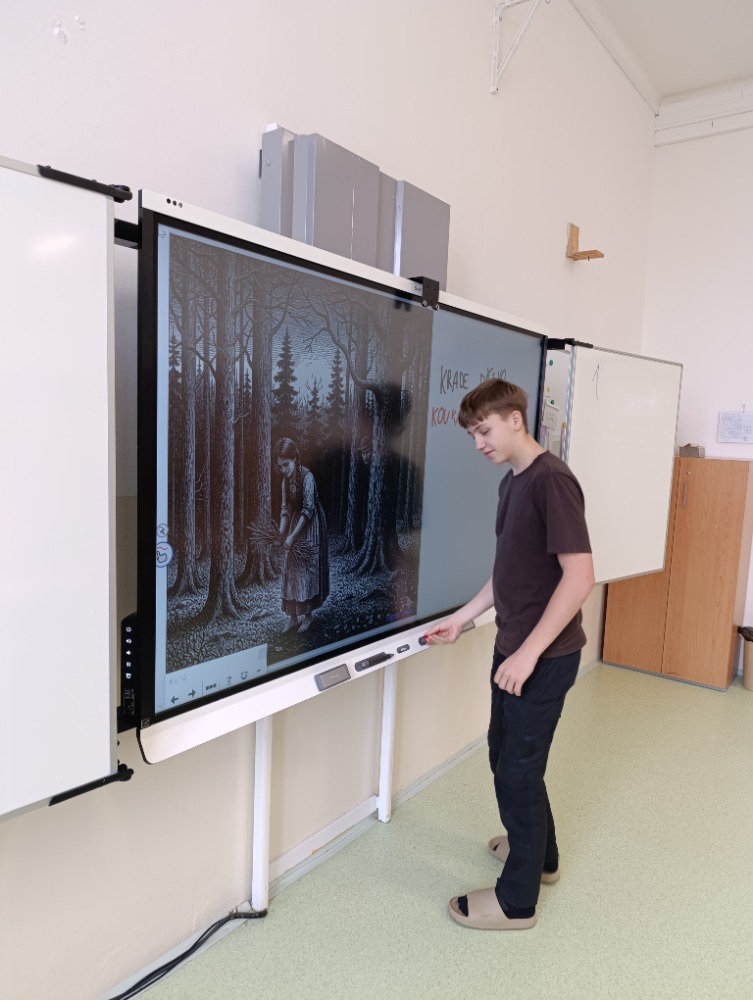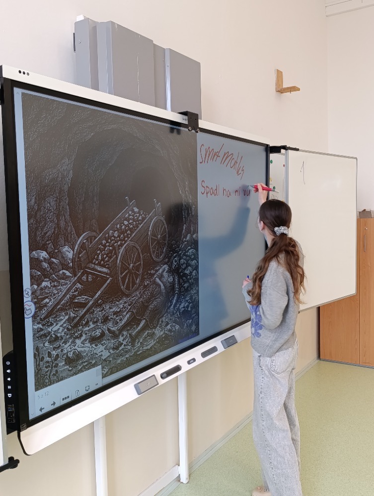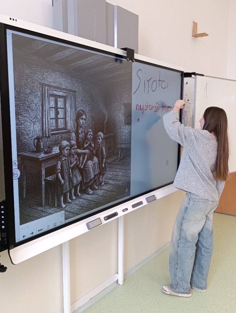 Následovala společná kontrola na interaktivní tabuli, kde žáci postupně zapisovali klíčová slova k jednotlivým scénám. V závěrečné reflexi si uvědomili, že problémy, které Maryčka řešila (chudoba, nespravedlnost či tlak společnosti), zůstávají v různých podobách aktuální i dnes.