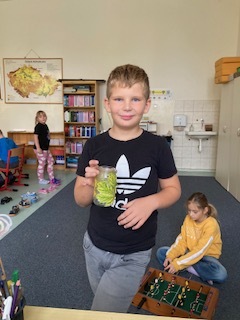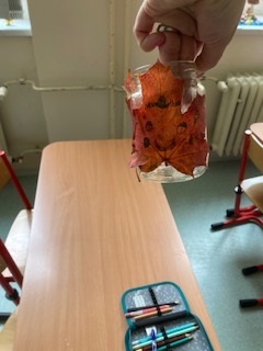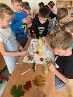 Využili jsme k tomu obyčejné sklenice a barevné listy, které jsme společně nasbírali při vycházce do přírody. Každý si mohl vybrat ty nejpestřejší listy, které pak opatrně lepil na sklenici. Nakonec jsme přidali barevné nitě, které sklenici krásně ozdobily.