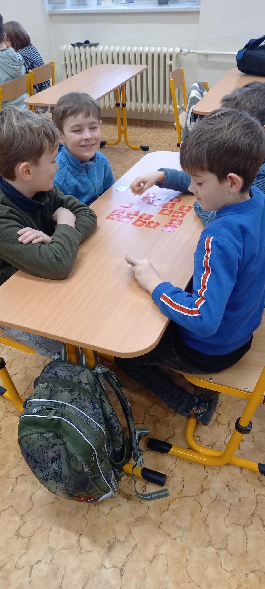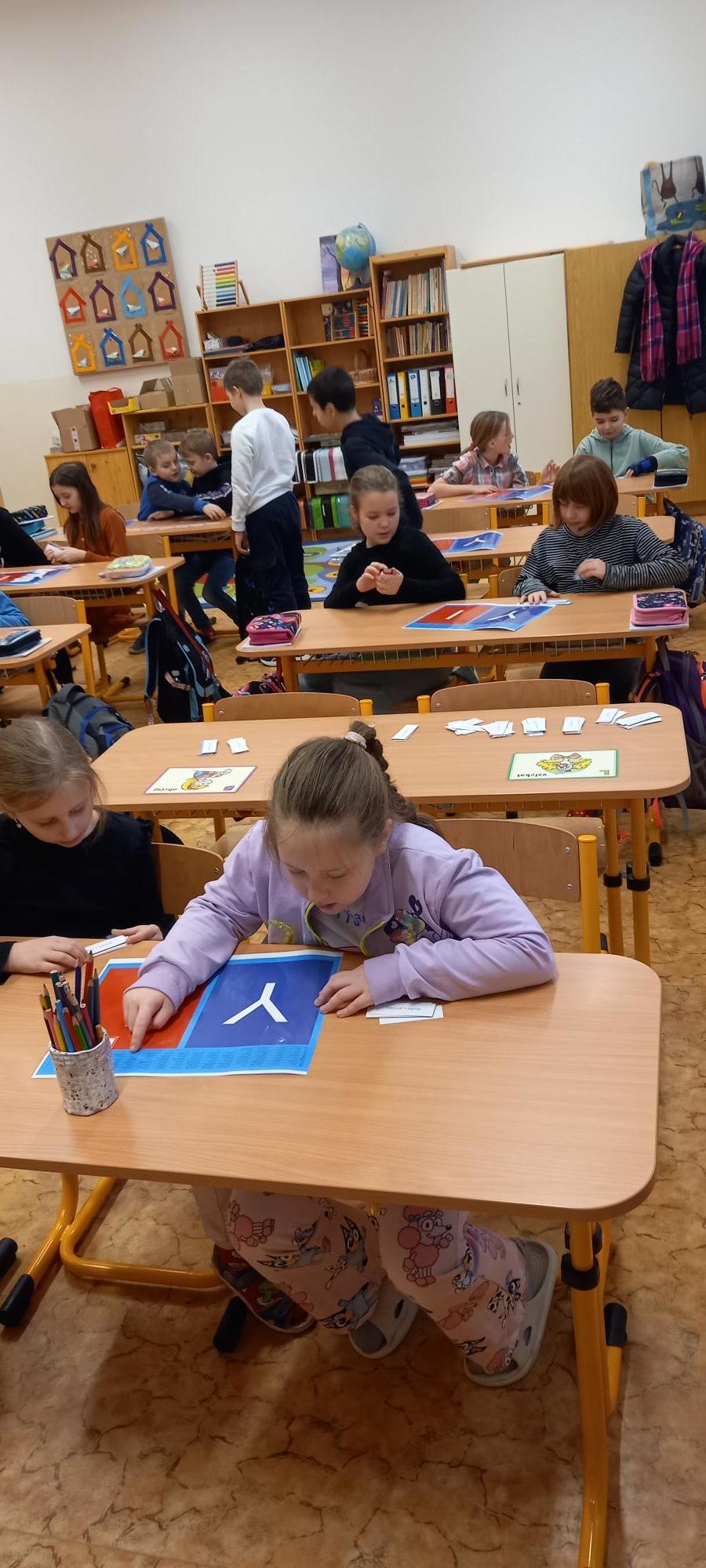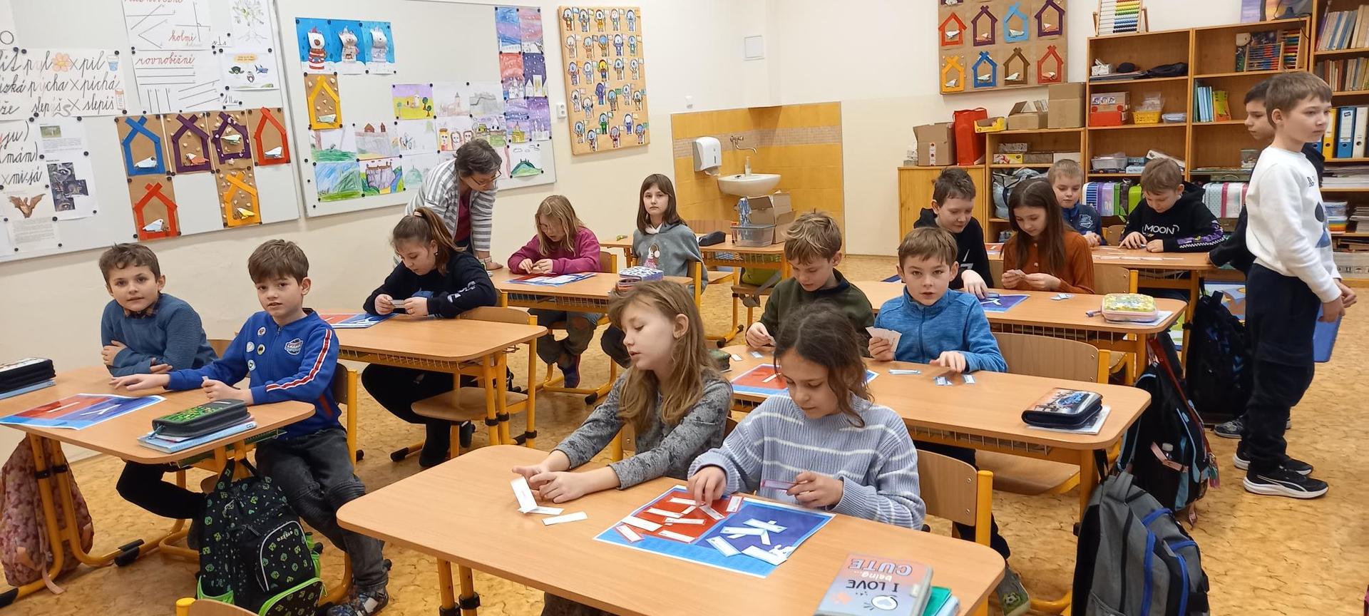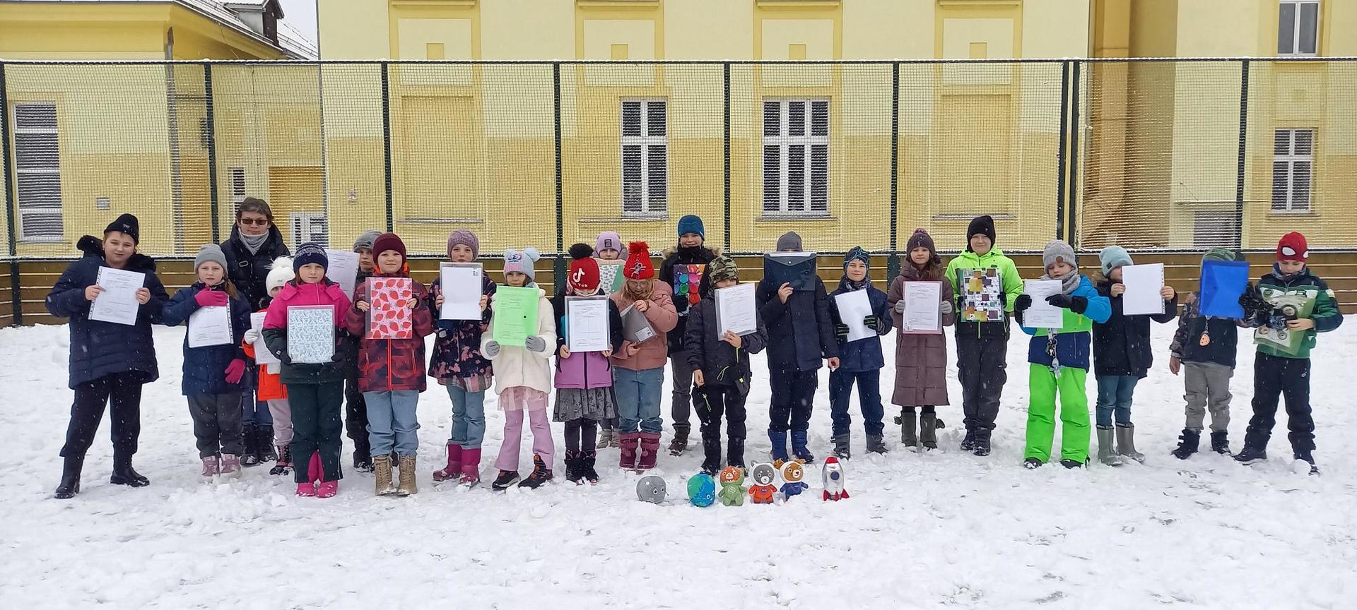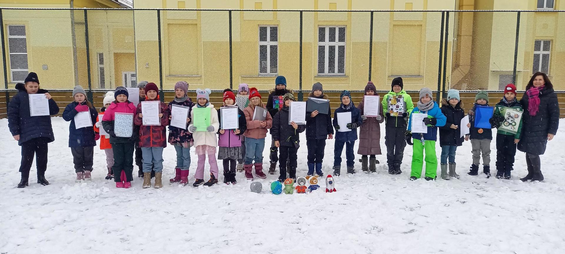 V předmětech českého jazyka, matematiky a prvouky procvičovali a opakovali učivo pomocí didaktických her, kvízů a manipulačních geometrických tabulek ve dvojicích nebo ve skupinách. O hodinu výtvarné výchovy si namalovali sněhuláky. Pak paní učitelka vybrala dětem fólie na vysvědčení, dala do tašky vesmírné maskoty třídy (planetu Zemi, Měsíc, raketu, kosmonauty), potají přibalila vysvědčení a řekla dětem, že před rozdáním pololetního vysvědčení půjdou na malou relaxační chvilku ven do čerstvě napadaného sněhu. Děti netušily, že po hrátkách s vločkami dostanou odměnu za své půlroční snažení a úspěšném objevování „nových vesmírných světů“ na sněhové pláni školního hřiště. Za vydařené pohodové dopoledne získali všichni ještě malou čoko odměnu.
