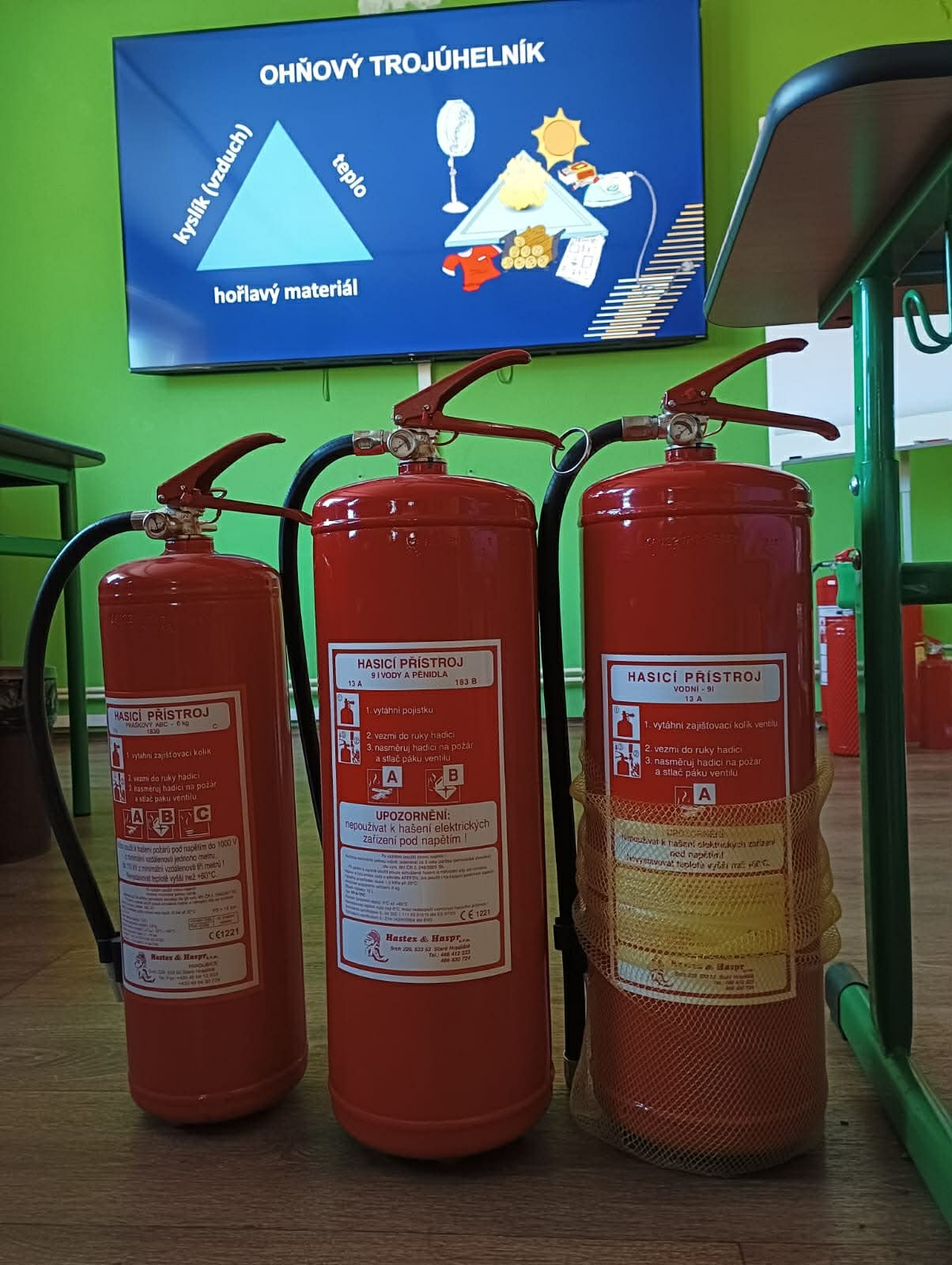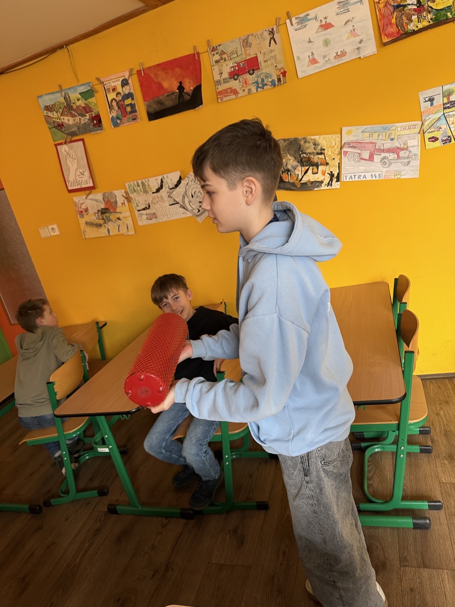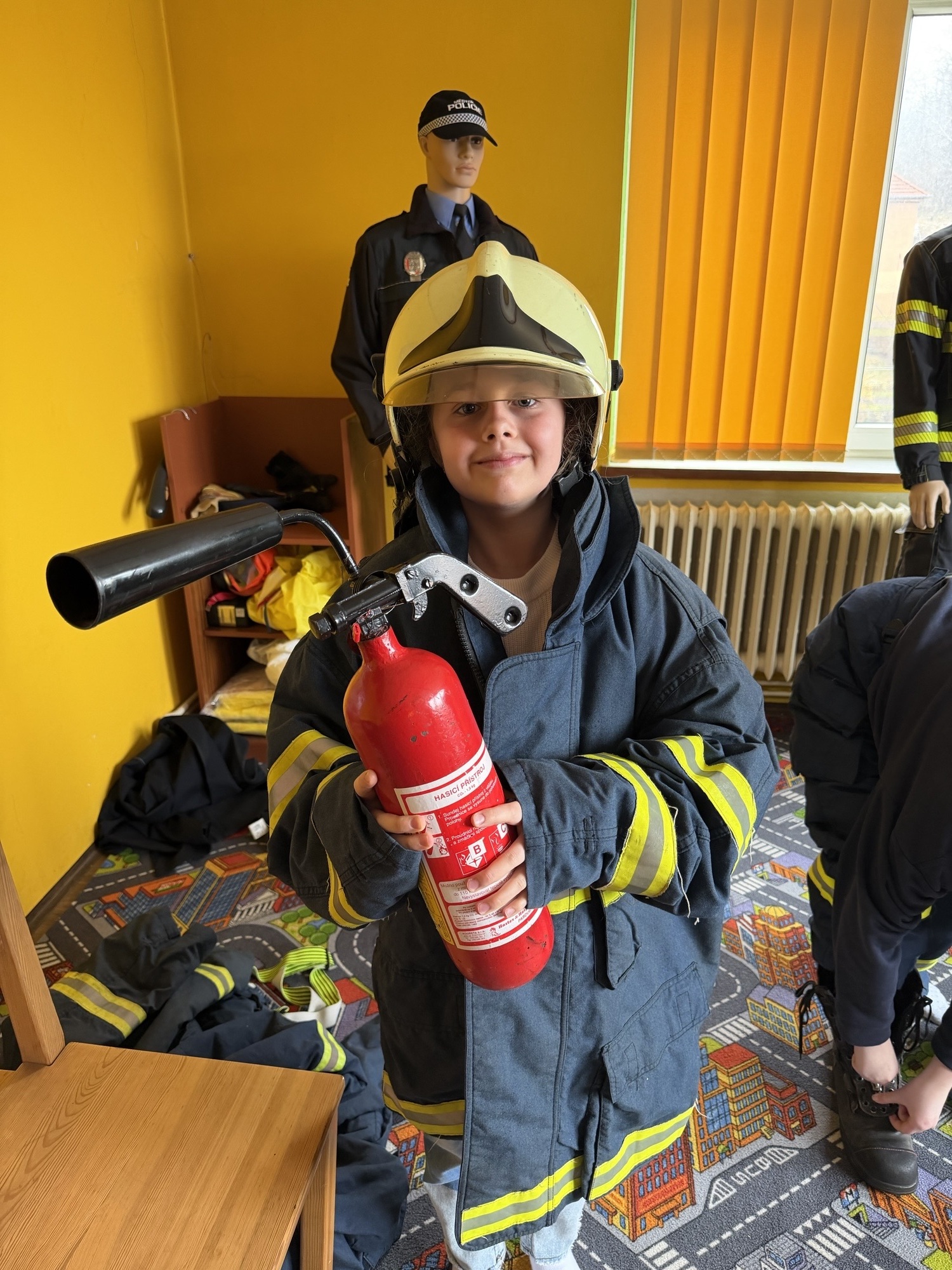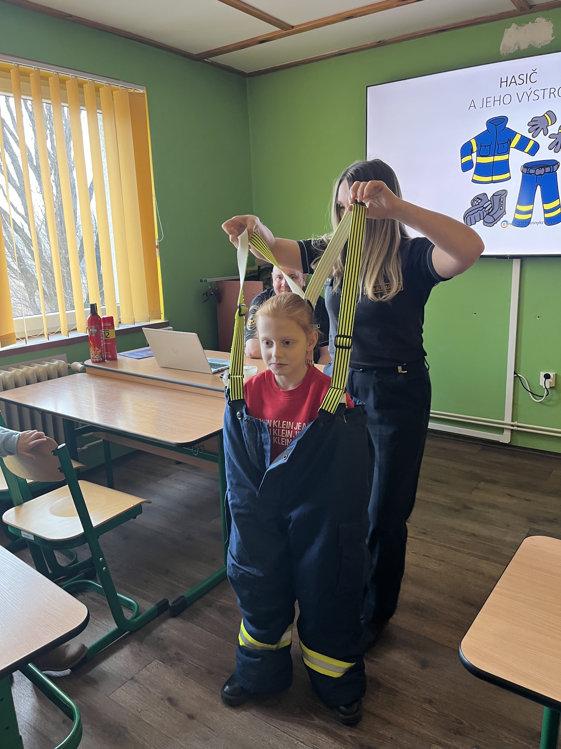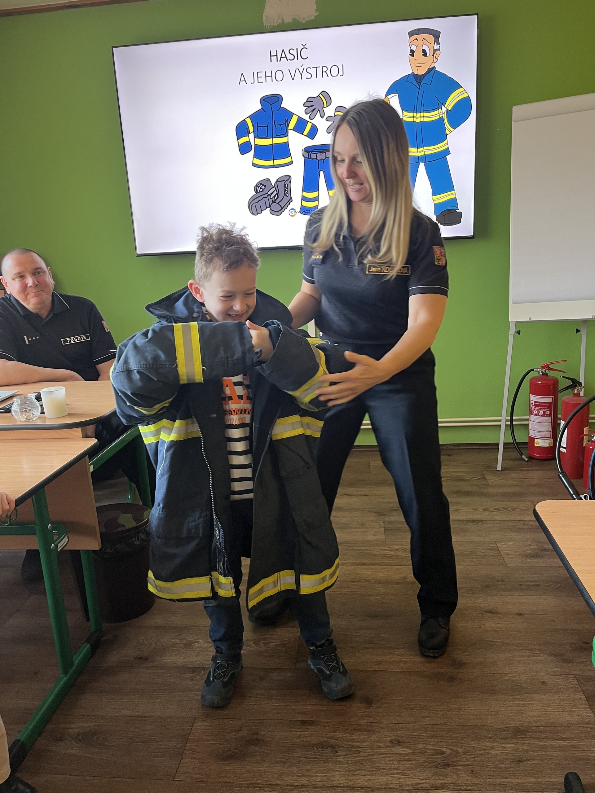 Velký úspěch měla praktická část programu. Žáci si mohli vyzkoušet hasičskou ochrannou helmu i část zásahového oděvu a na vlastní oči vidět, jaké vybavení hasiči při své práci používají.