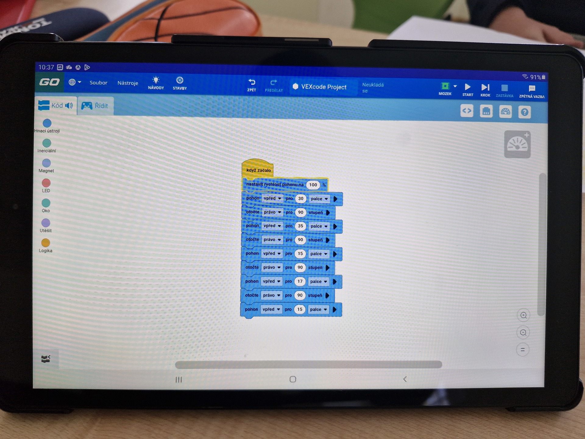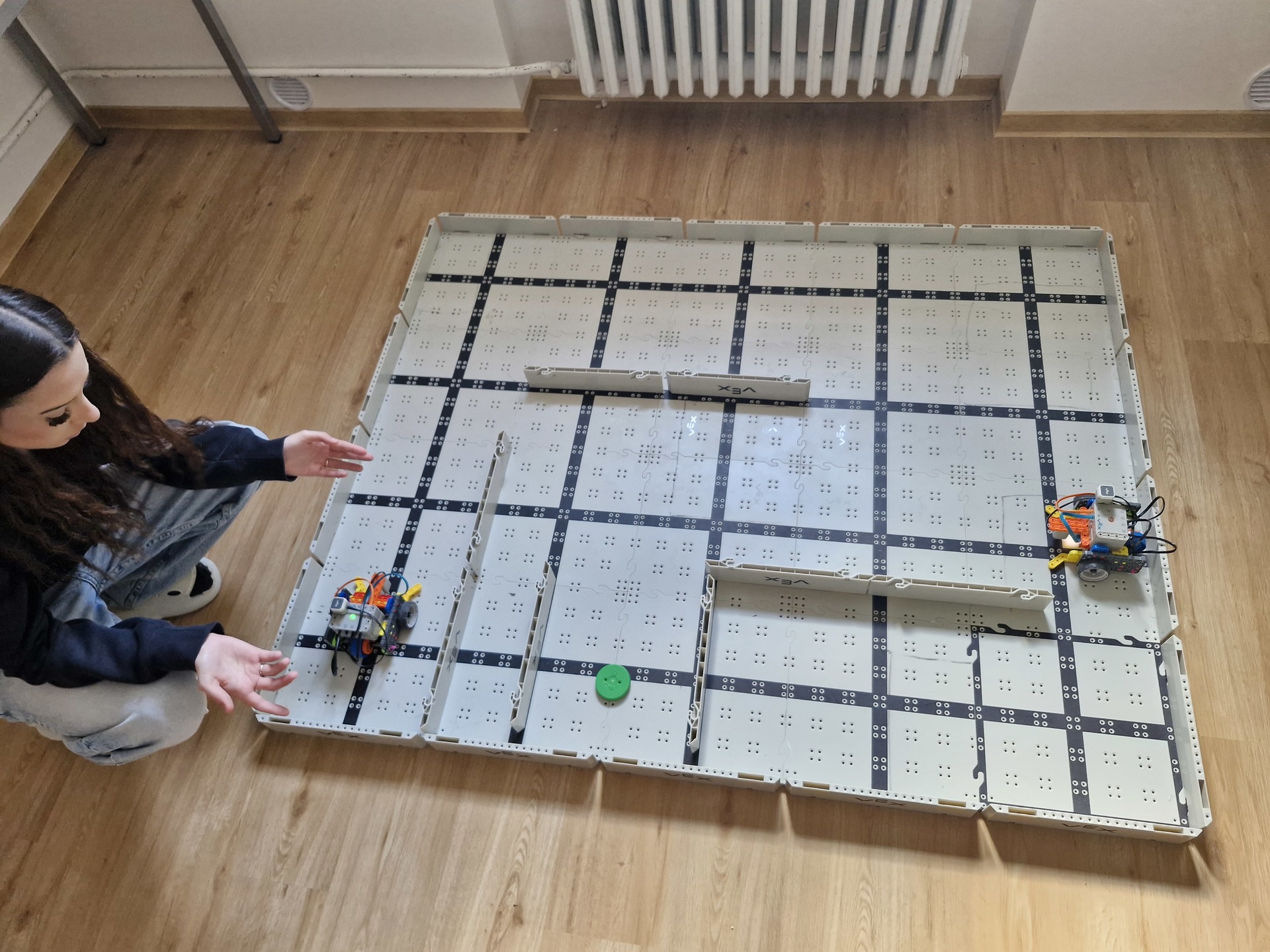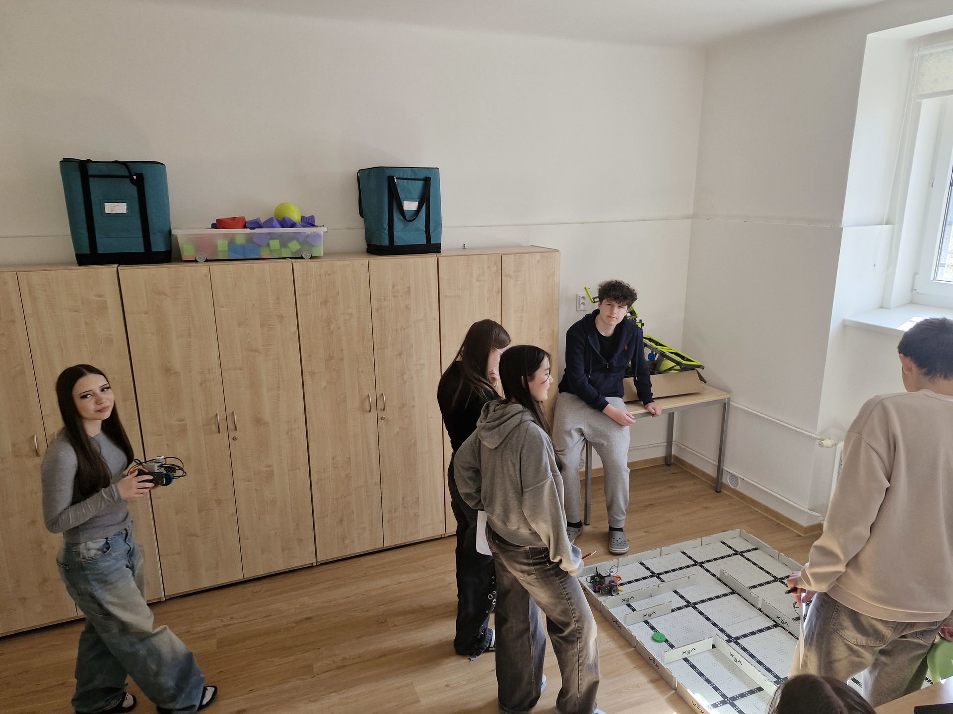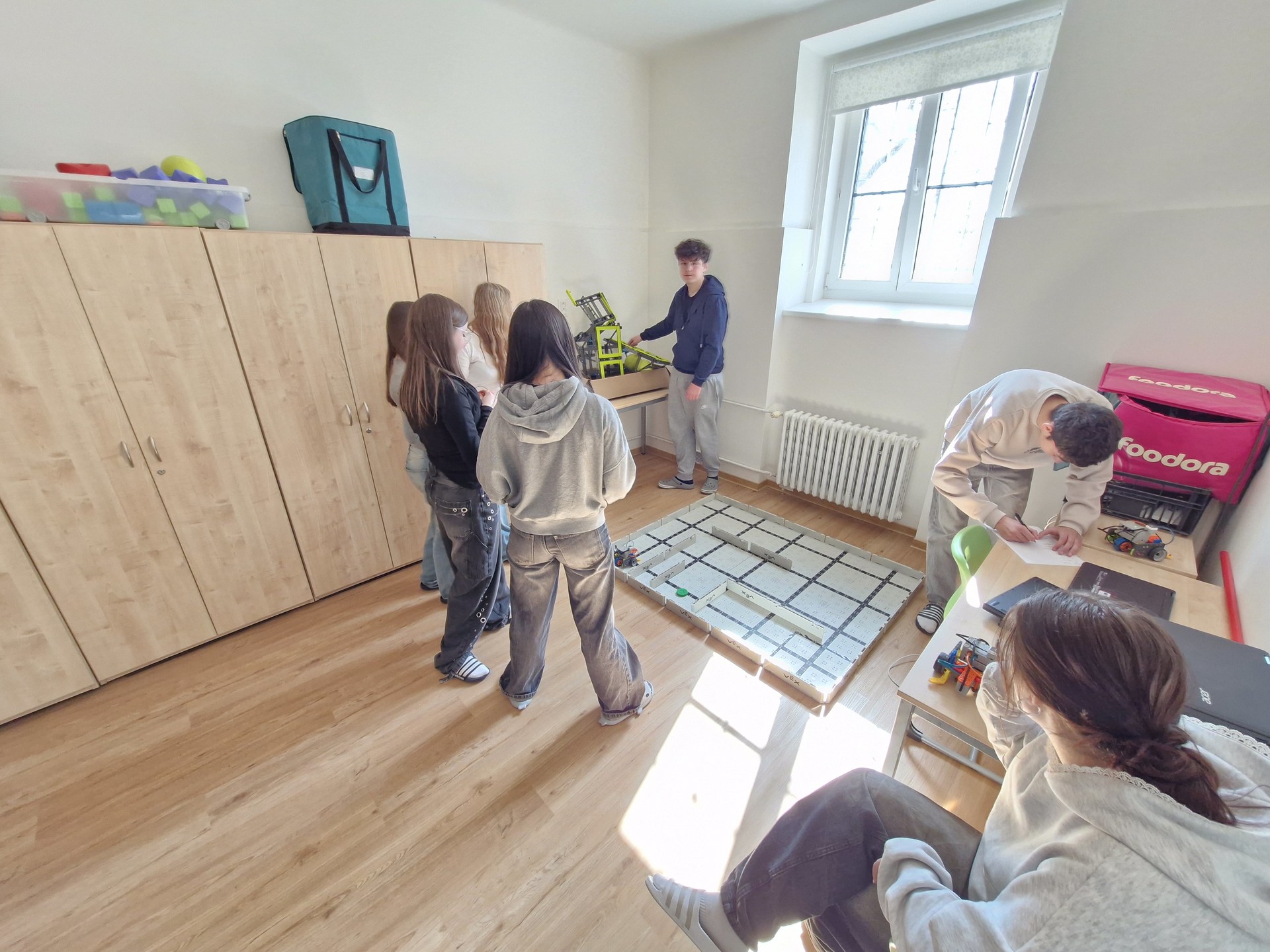 Na hodinách informatiky si žáci 8. třídy vyzkoušeli roli programátorů i techniků při práci s roboty VEX GO. Jejich úkolem bylo naprogramovat robota tak, aby dokázal samostatně dojet ke kotouči, sebrat ho pomocí magnetu a následně ho bezpečně dopravit na určené místo.