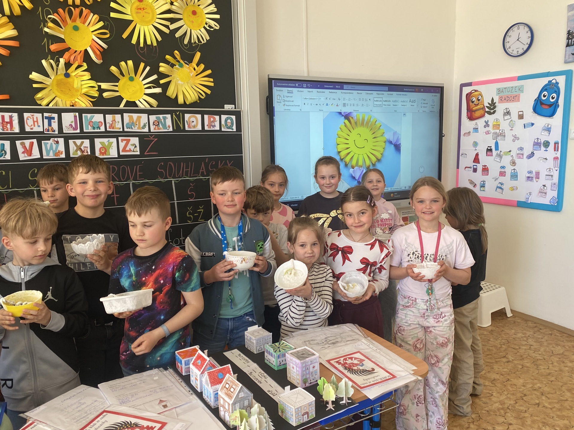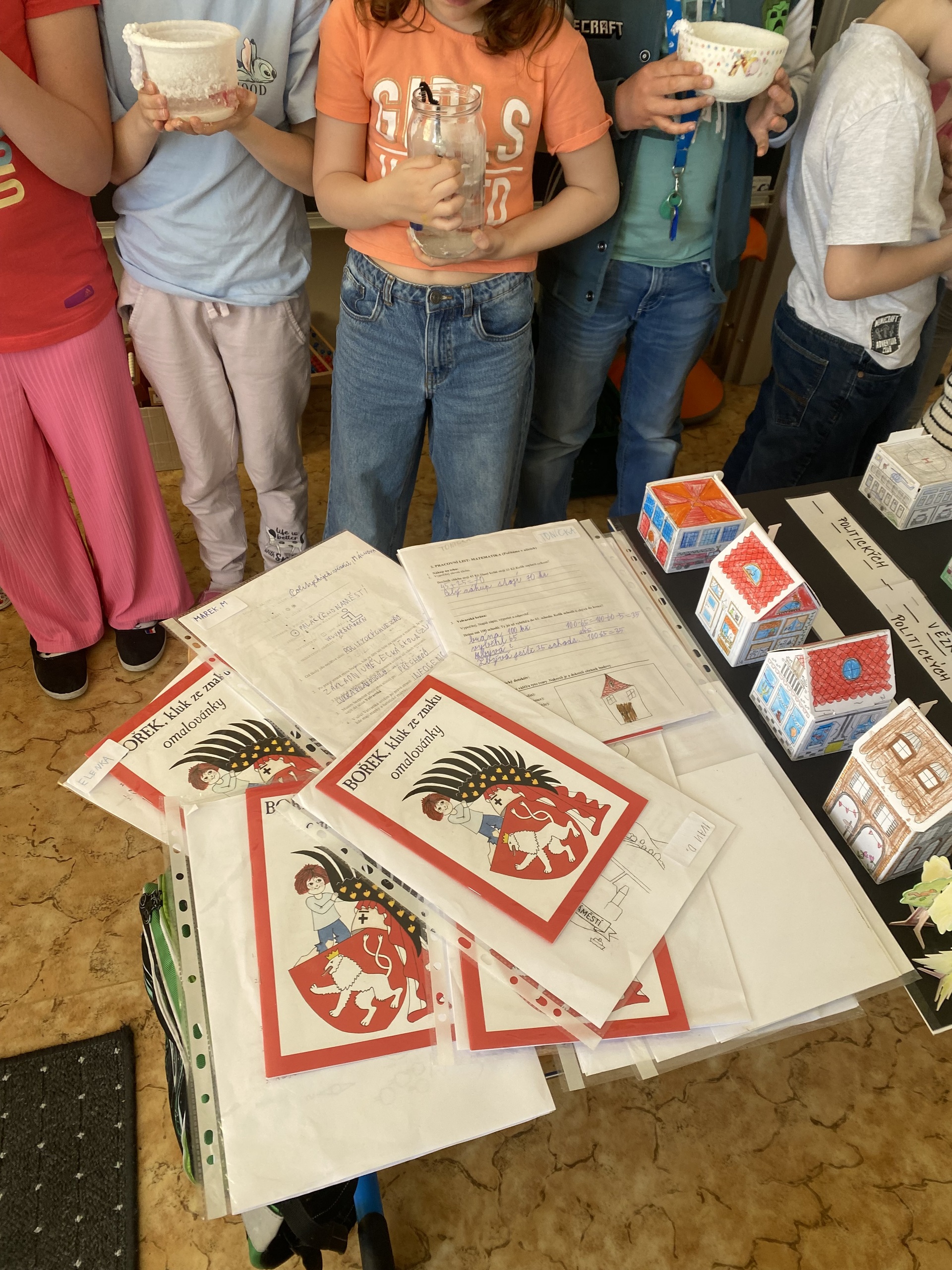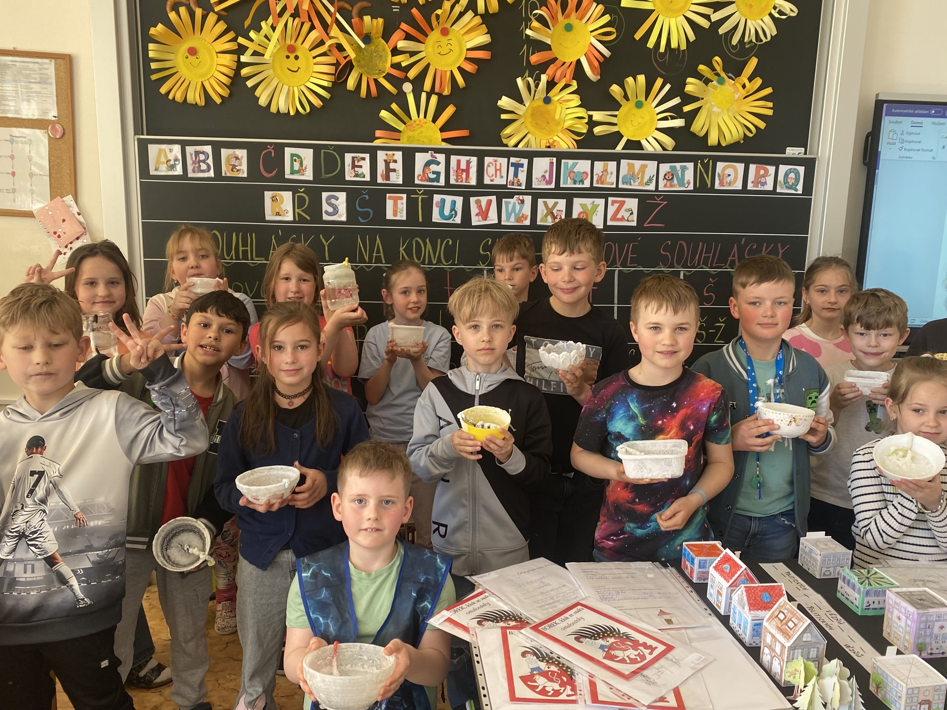 A co všechno jsme společně zažili? Naše putování začalo u čtenářské gramotnosti. Ponořili jsme se do starých pověstí o založení našeho města a zjistili jsme, jak důležité je porozumět psanému slovu. Abychom se cítili jako skuteční středověcí mistři, vyzkoušeli jsme si techniku iluminace. Každý si vytvořil své vlastní zdobené počáteční písmeno jména, které vypadá jako z královské listiny. Vypravili jsme se do ulic našeho města. Naše cesta do školy a po Slaném dostala nový rozměr – učili jsme se orientovat v mapě a poznávat významné památky. Teď už každý druhák ví, kde stojí Velvarská brána nebo k čemu sloužila radnice. Naše pozorování jsme pak přenesli na papír a vytvořili jsme si vlastní plány cest. Velkým zážitkem byly pokusy! Abychom pochopili, proč se naše město jmenuje Slaný, proměnili jsme se v chemiky. Sledovali jsme krystalizaci soli a proces odpařování. Vidět na vlastní oči, jak z „obyčejné“ vody vznikají bílé krystaly, bylo pro mnohé z nás kouzelné. Chemie nás zkrátka nadchla! V hodinách praktických činností jsme nezůstali jen u teorie. Stavěli jsme modely budov a plánovali celé ulice. Děti si vyzkoušely, jaké to je postavit model města. A co jsme se naučili? Projekt nám ukázal, že učení není jen o sešitech. Děti se do všech aktivit zapojovaly s obrovskou chutí a úsměvem na tváři. Nejenže si rozšířily obzory o nové poznatky z historie a přírodních věd, ale hlavně zjistily, že když spolupracují, dokážou opravdu všechno. Děkuji všem dětem za jejich nadšení a kreativitu. Všichni se už těšíme na další společné objevování!