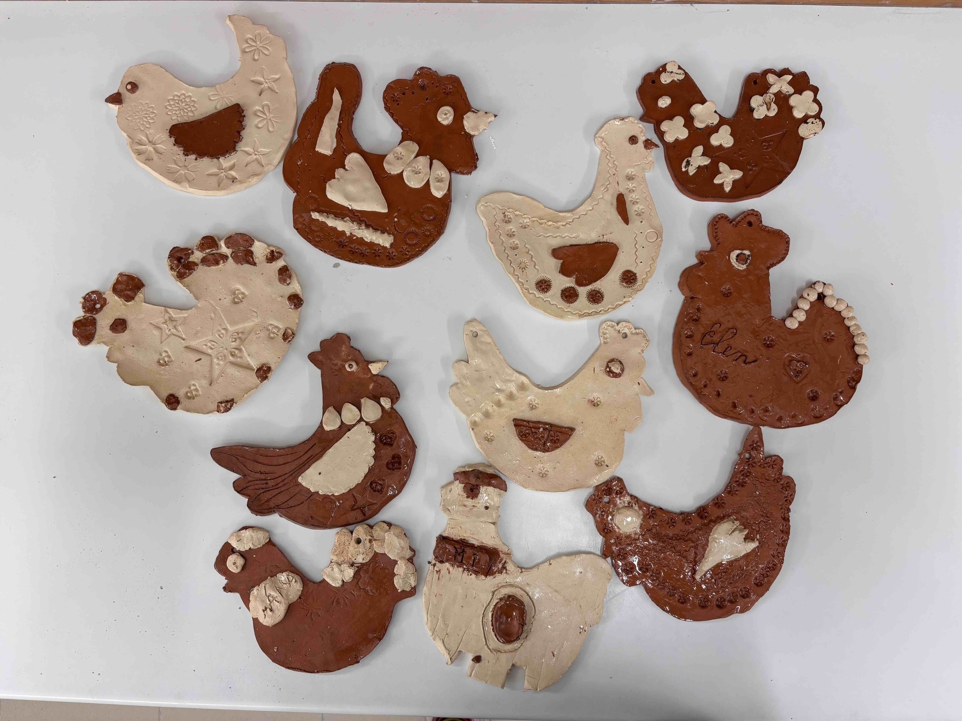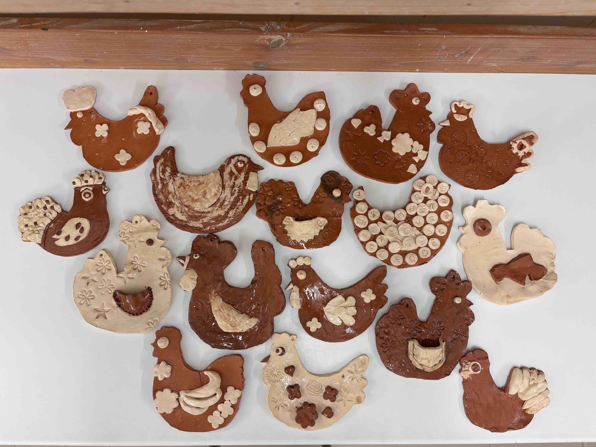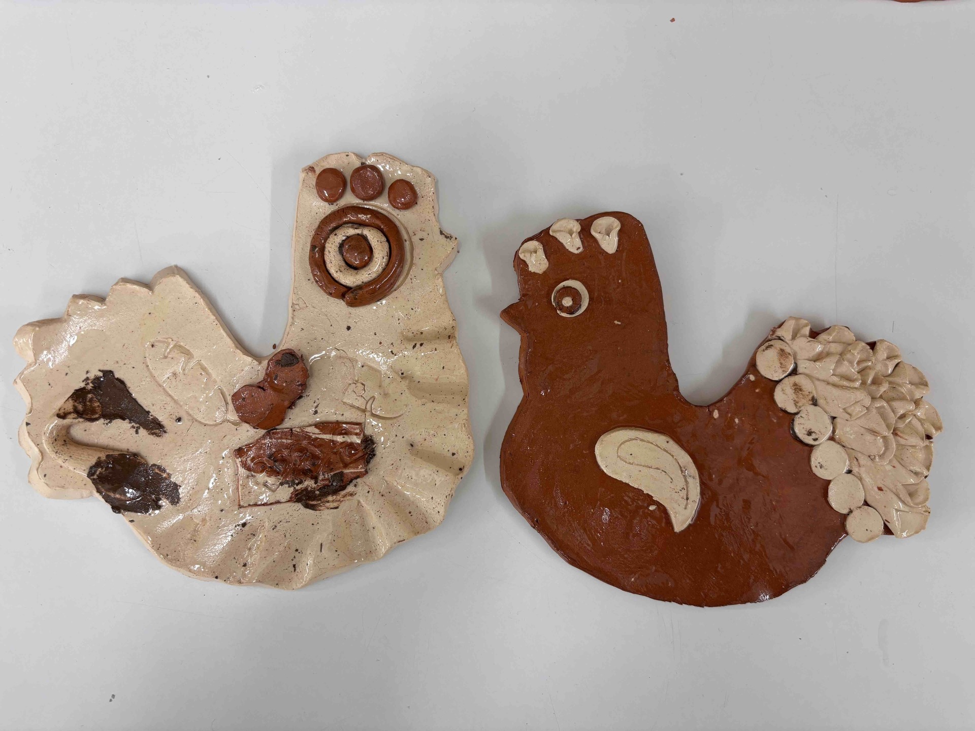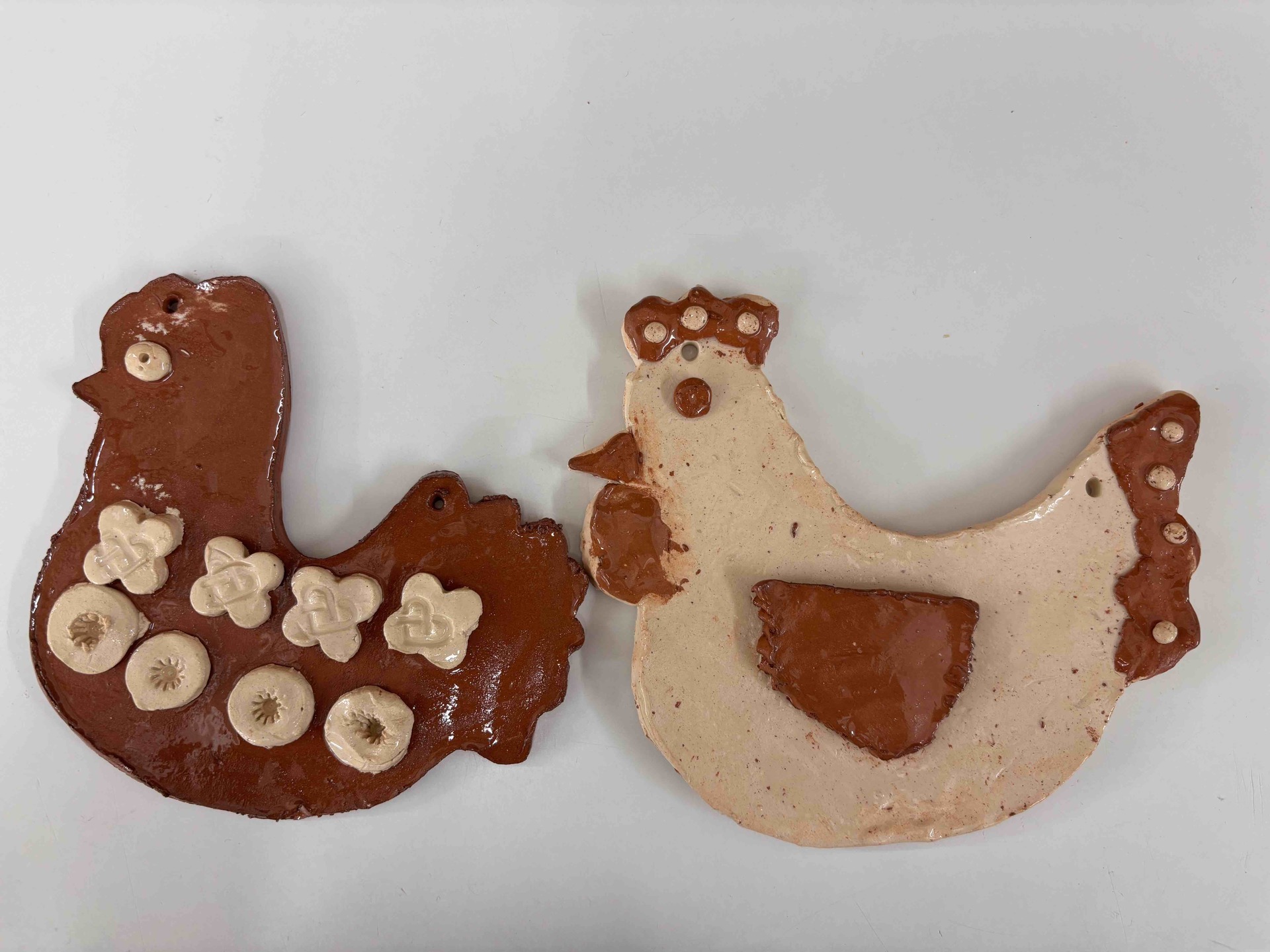 Vytvořili jsme slepičky i kohoutky ze světlé a tmavé hlíny, díky čemuž vznikly krásné kontrasty. Po vypálení jsme je pokryli bezbarvou glazurou, která jim dodala jemný lesk a zvýraznila jejich strukturu.