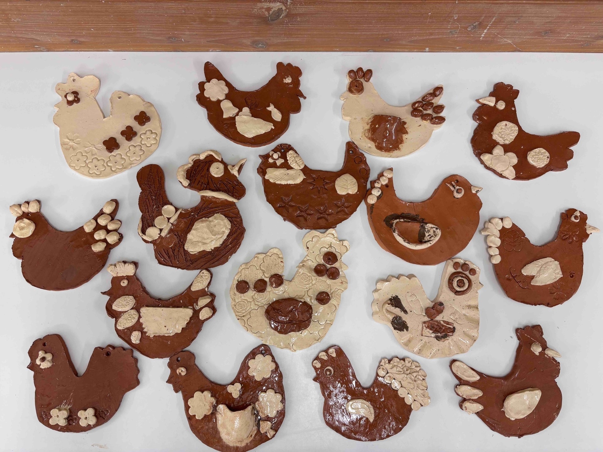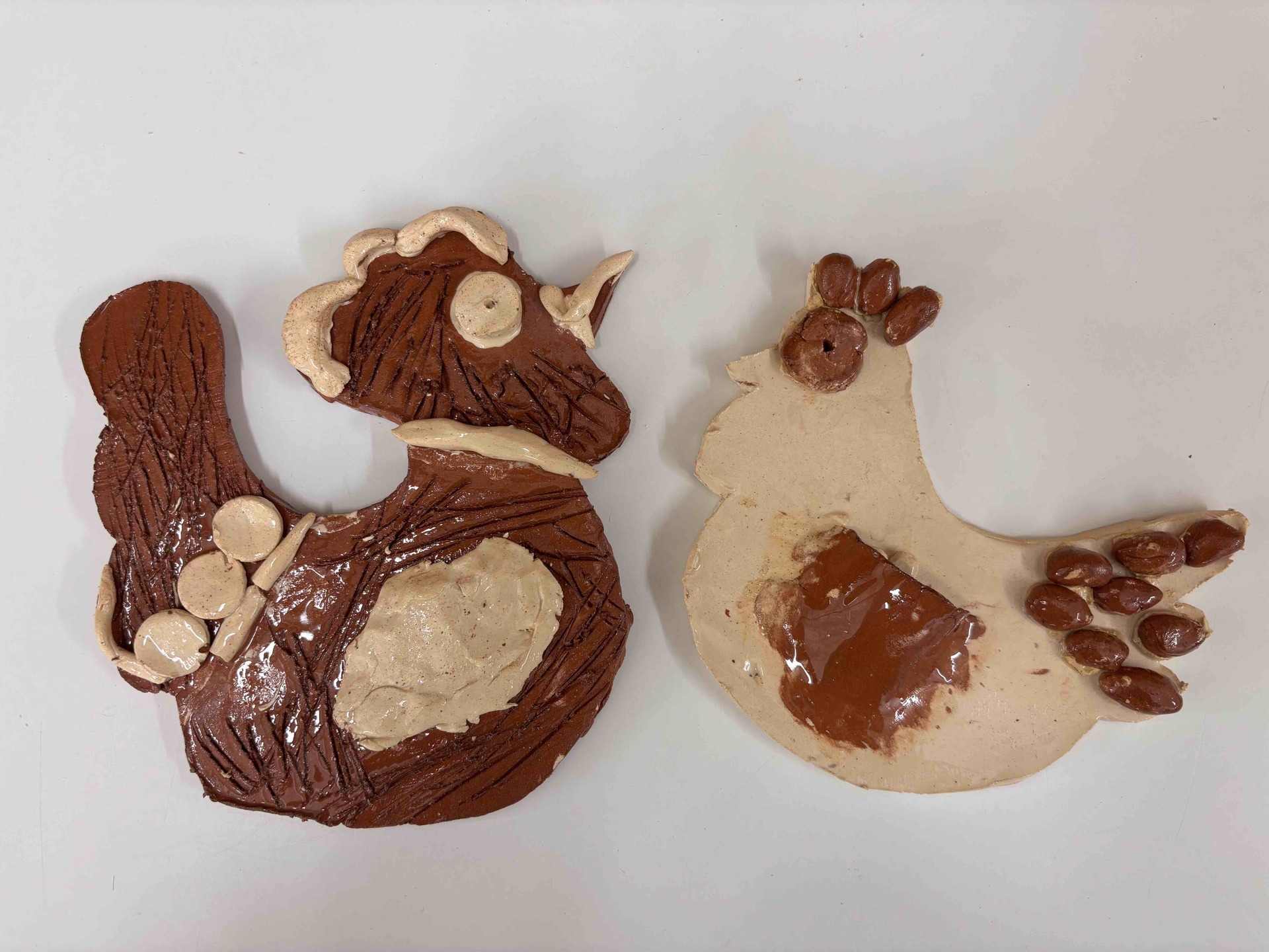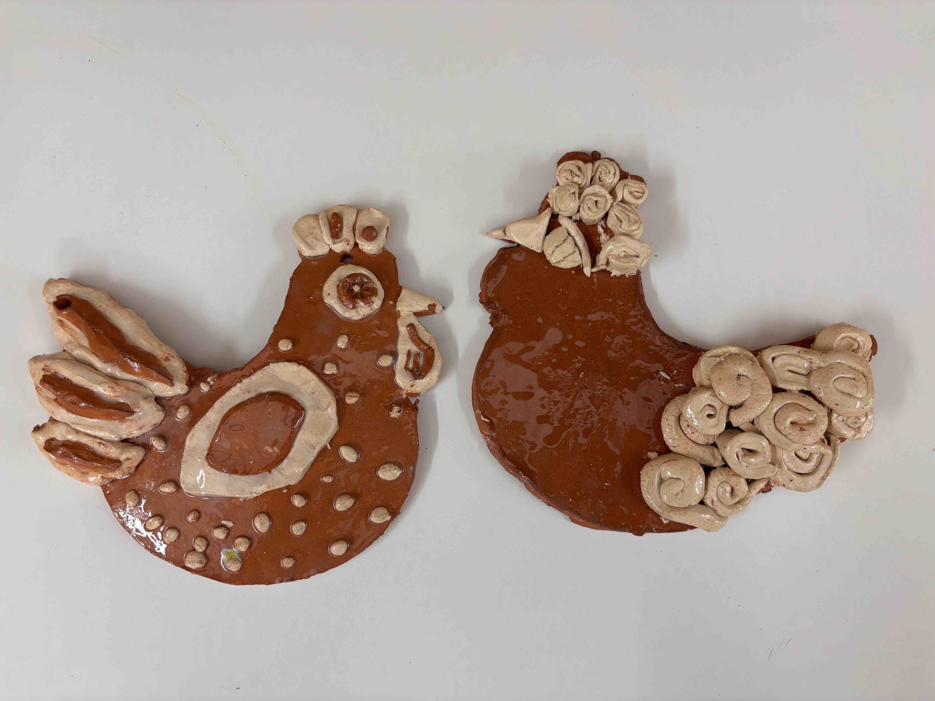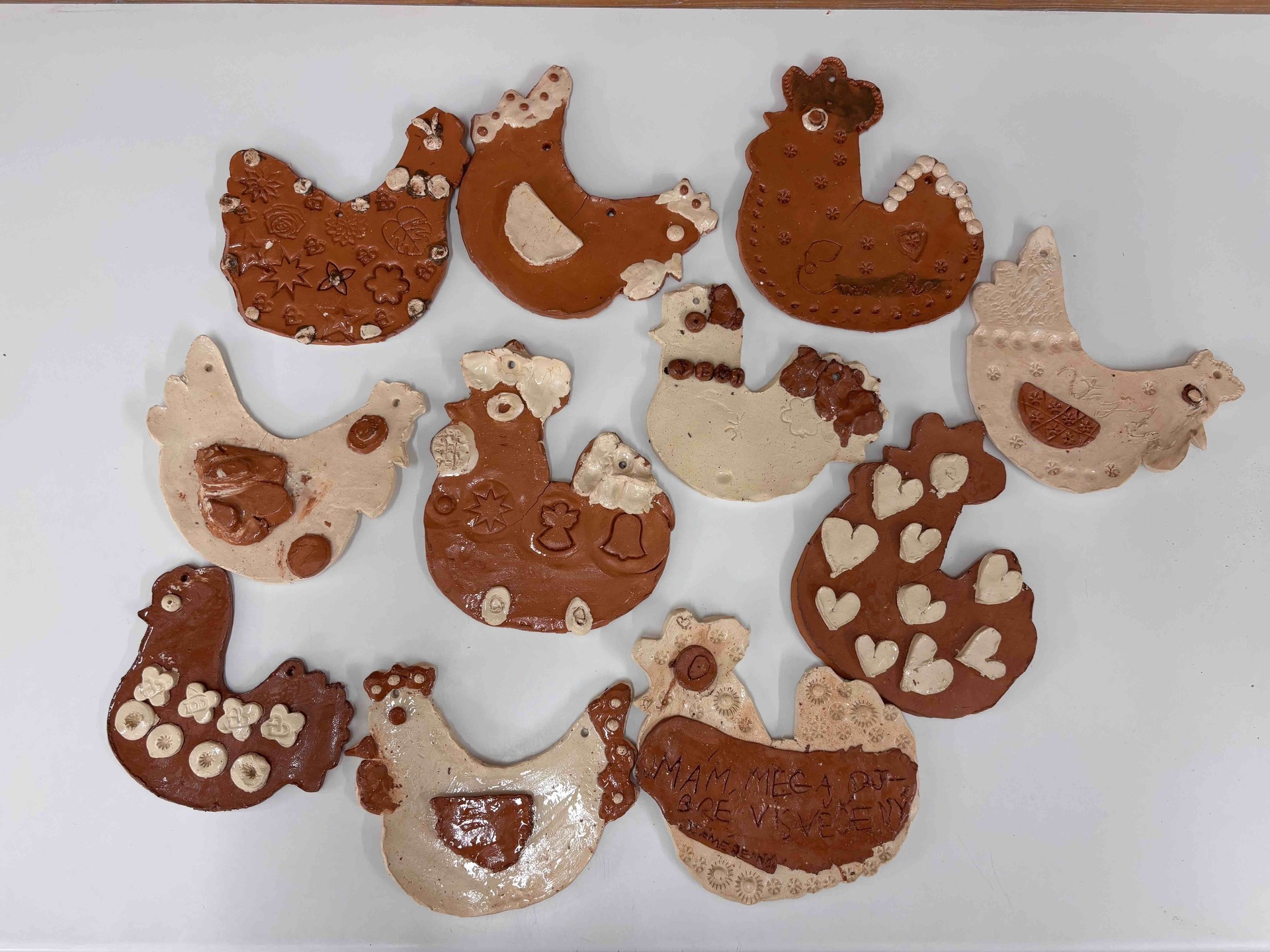 Vytvořili jsme slepičky i kohoutky ze světlé a tmavé hlíny, díky čemuž vznikly krásné kontrasty. Po vypálení jsme je pokryli bezbarvou glazurou, která jim dodala jemný lesk a zvýraznila jejich strukturu.