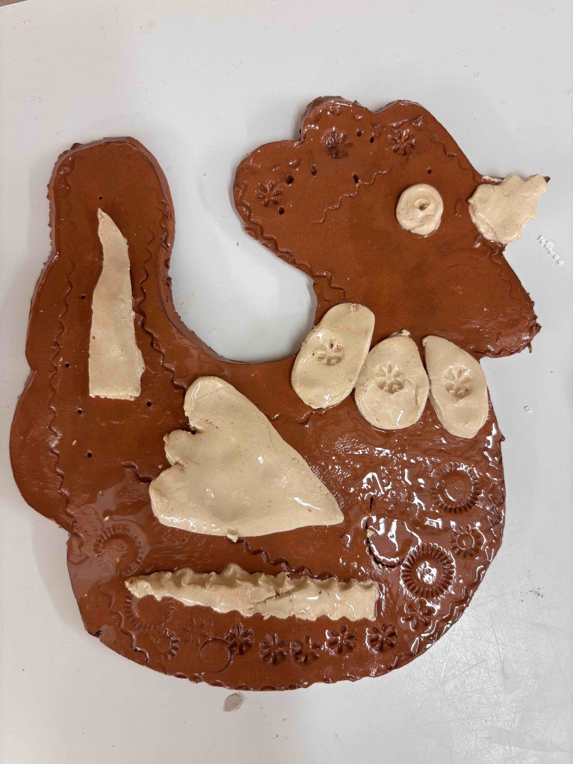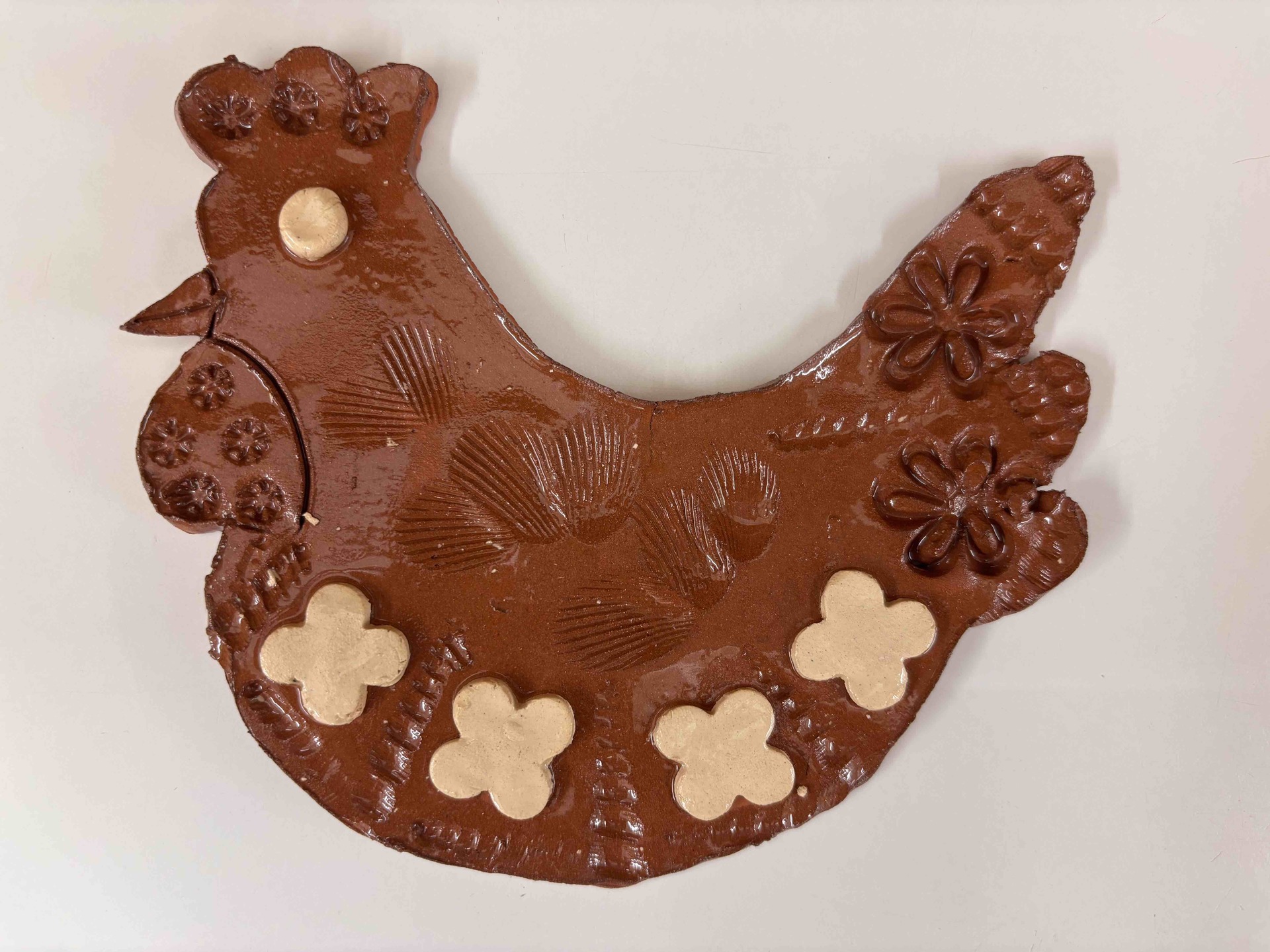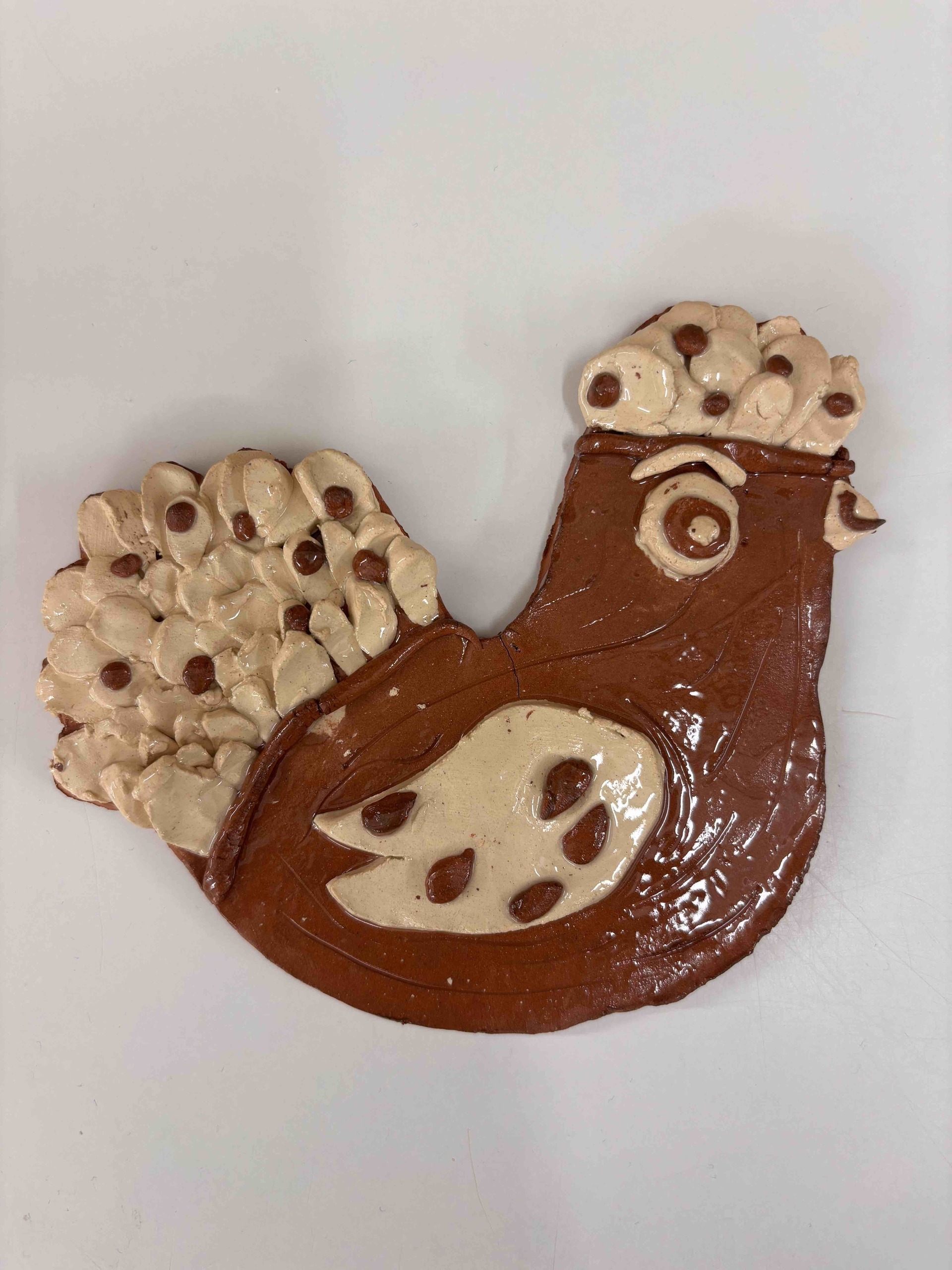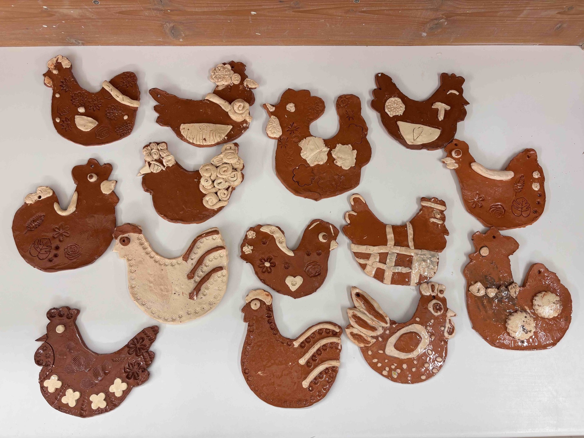 Vytvořili jsme slepičky i kohoutky ze světlé a tmavé hlíny, díky čemuž vznikly krásné kontrasty. Po vypálení jsme je pokryli bezbarvou glazurou, která jim dodala jemný lesk a zvýraznila jejich strukturu.