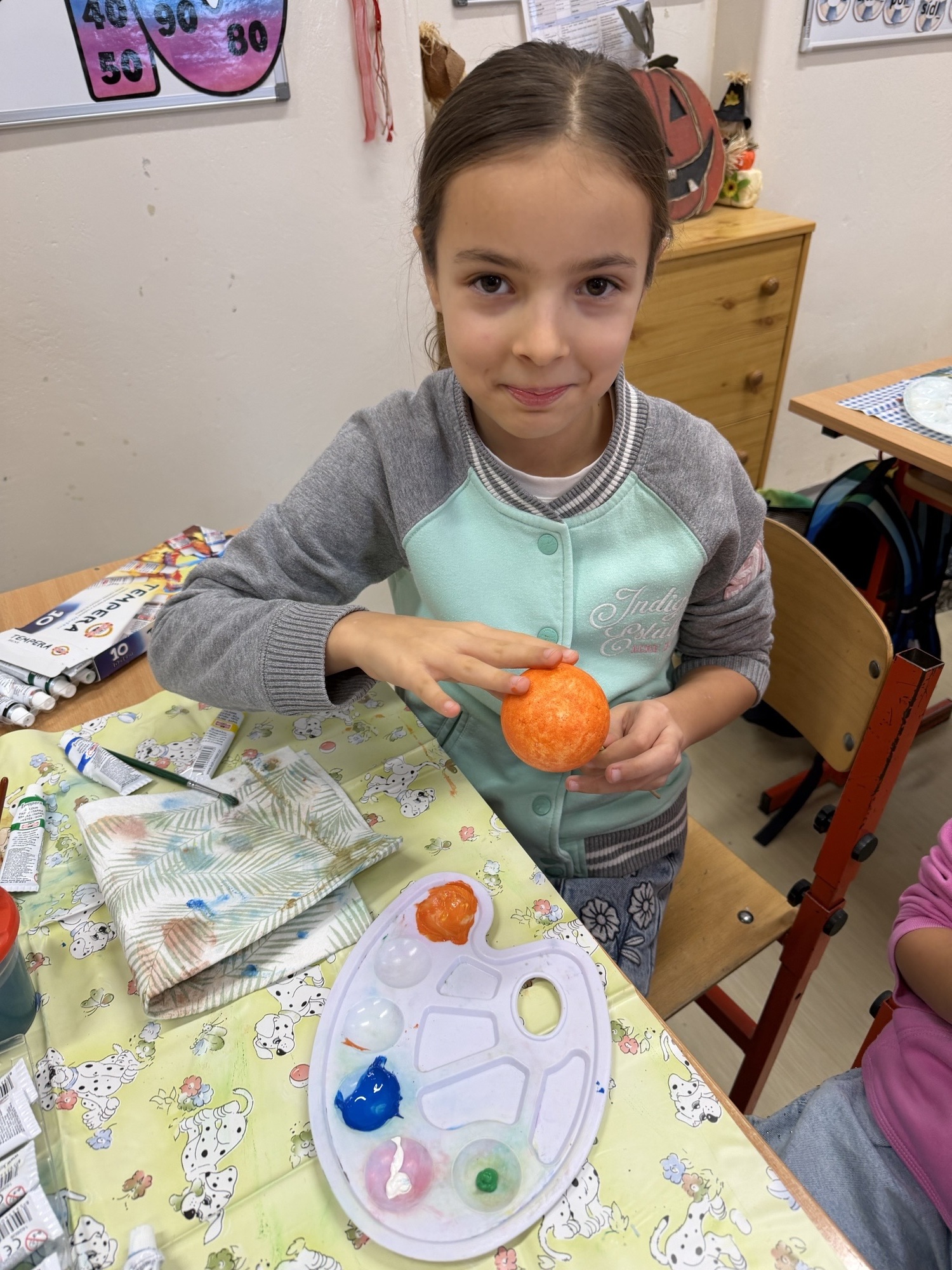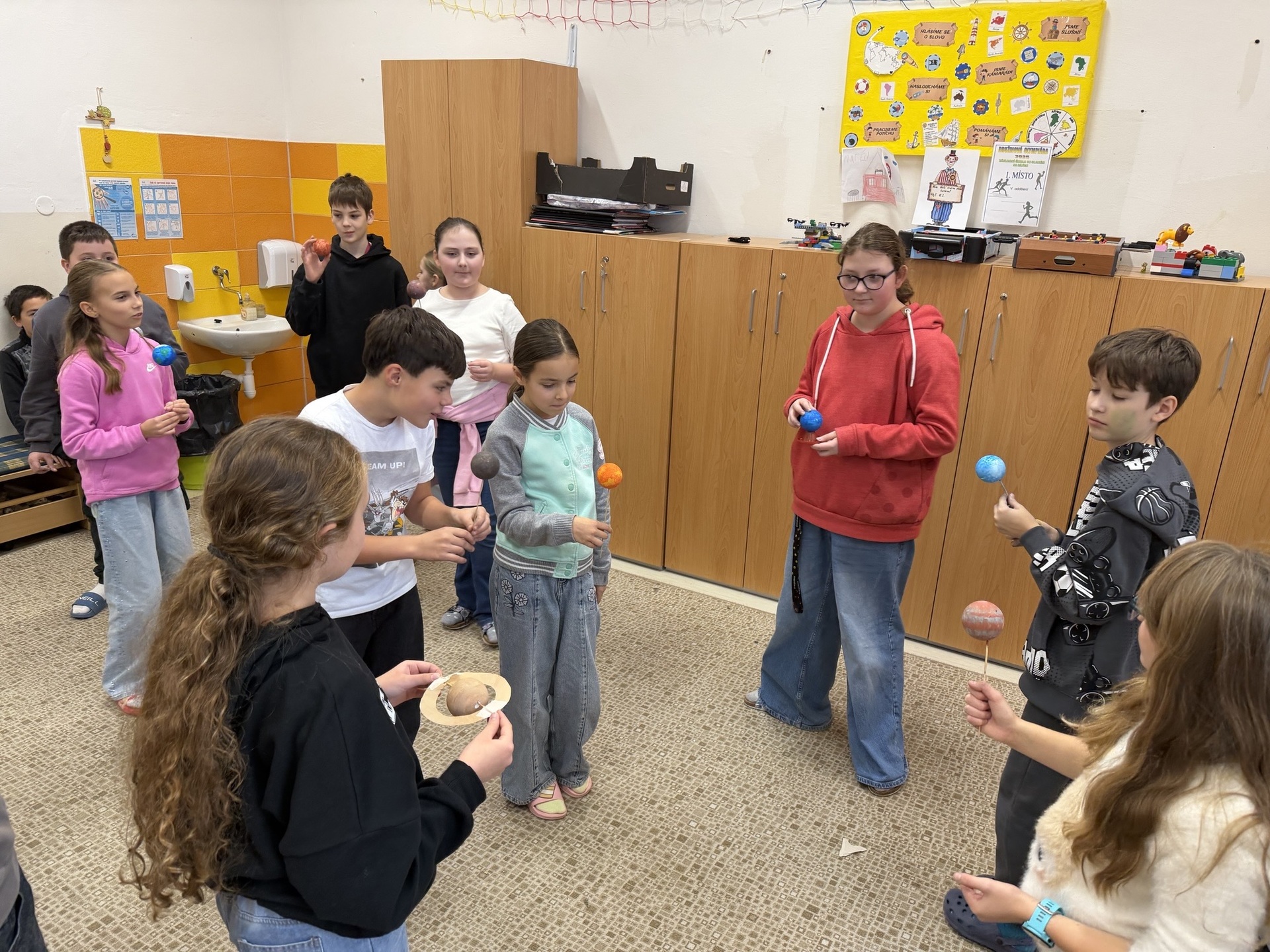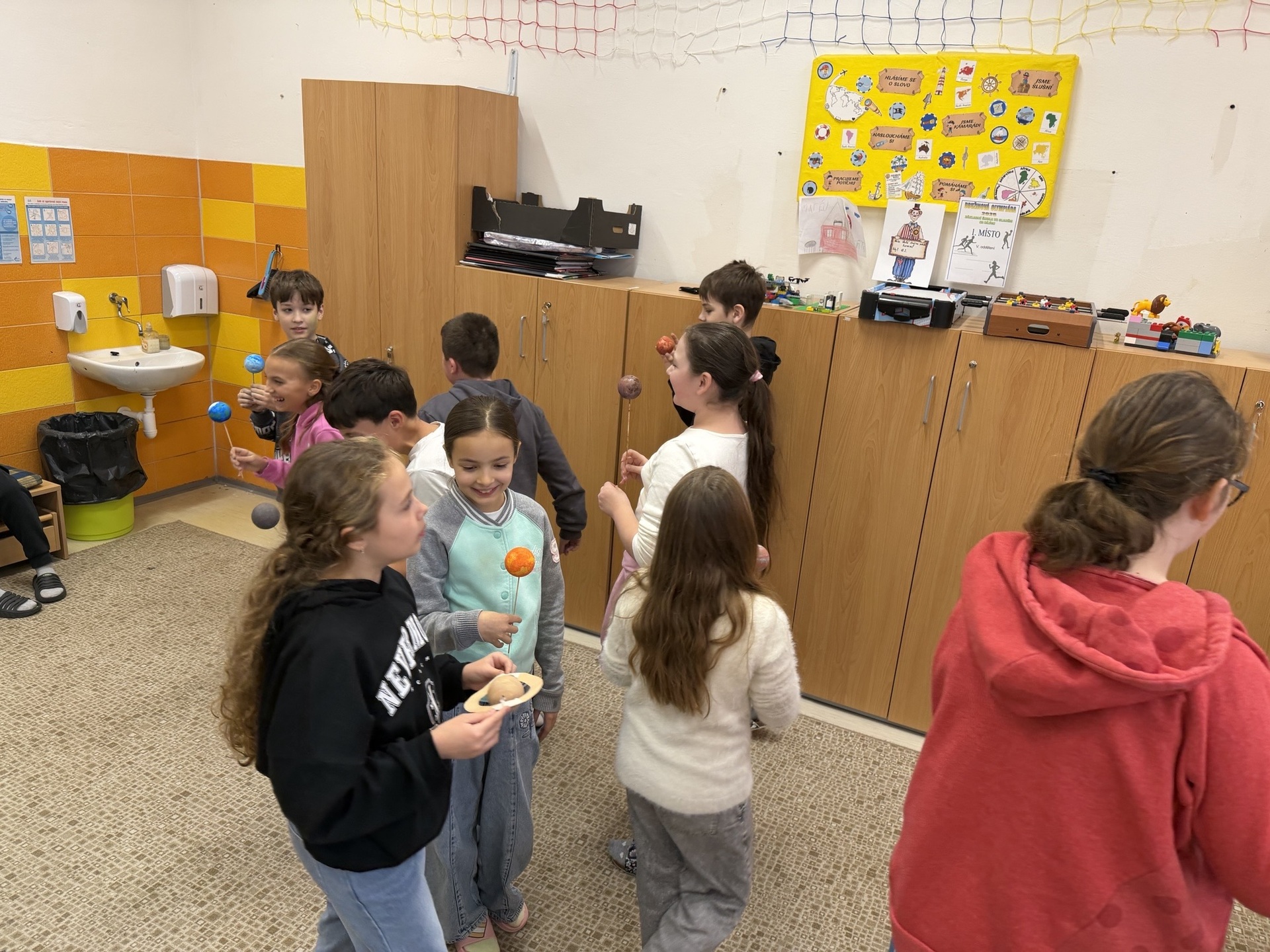 Poté jsme všechny planety spojili a vytvořili naši vlastní sluneční soustavu. Při práci si děti zopakovaly názvy planet, jejich pořadí kolem Slunce a zajímavosti, které o nich víme. Po vytvoření všech planet jsme vzali naše planety a obíhali jsme společně kolem Slunce.