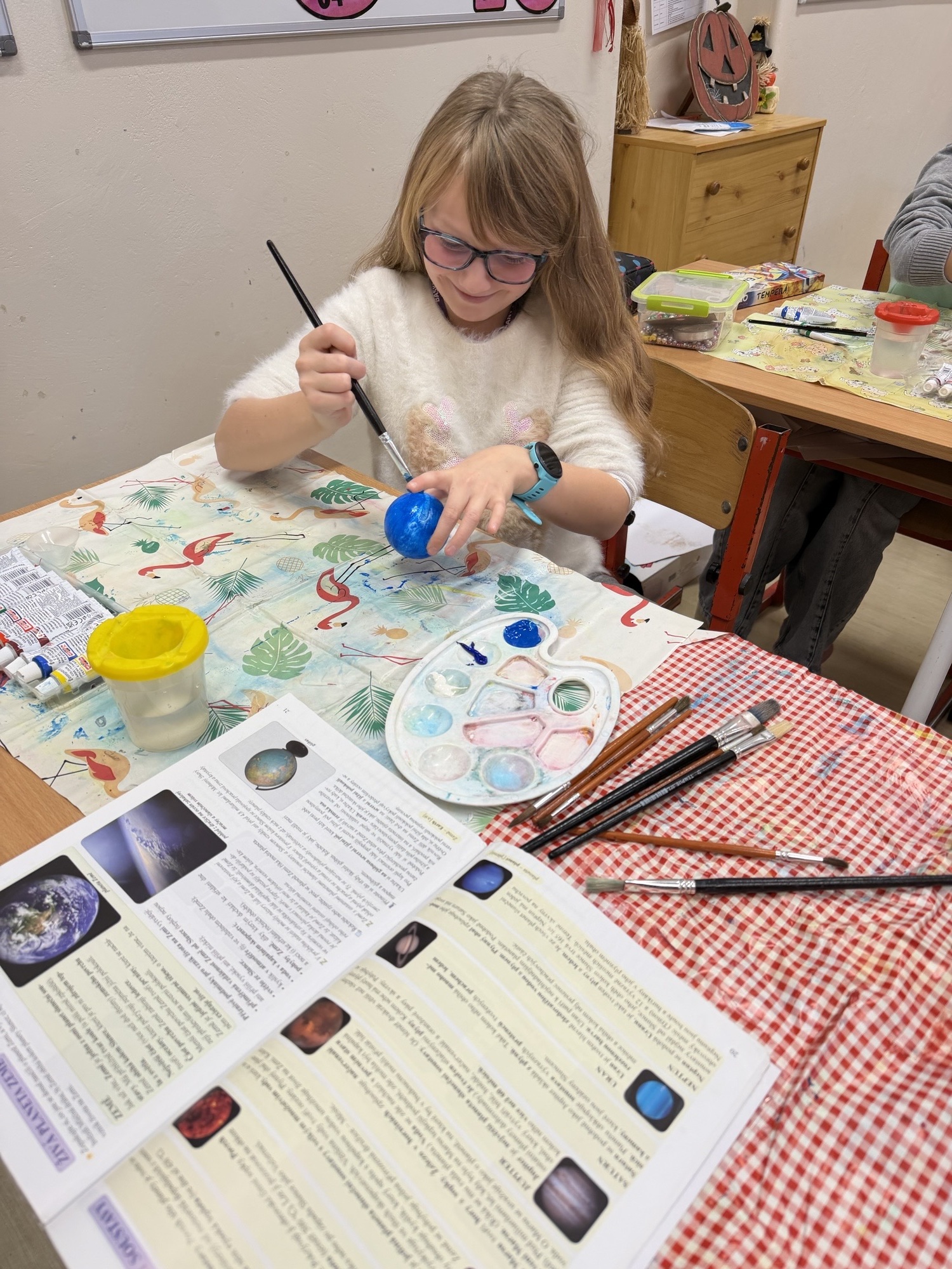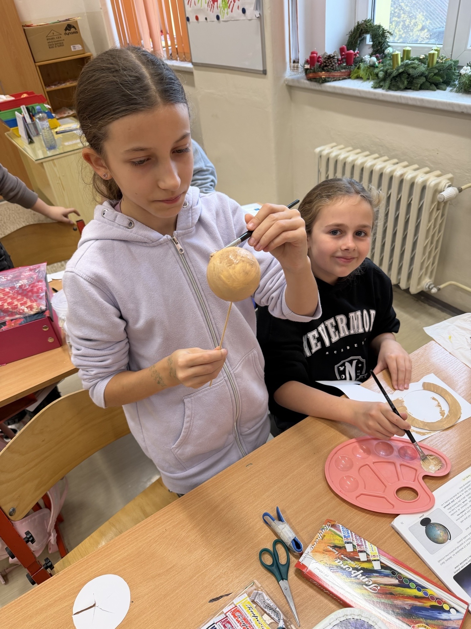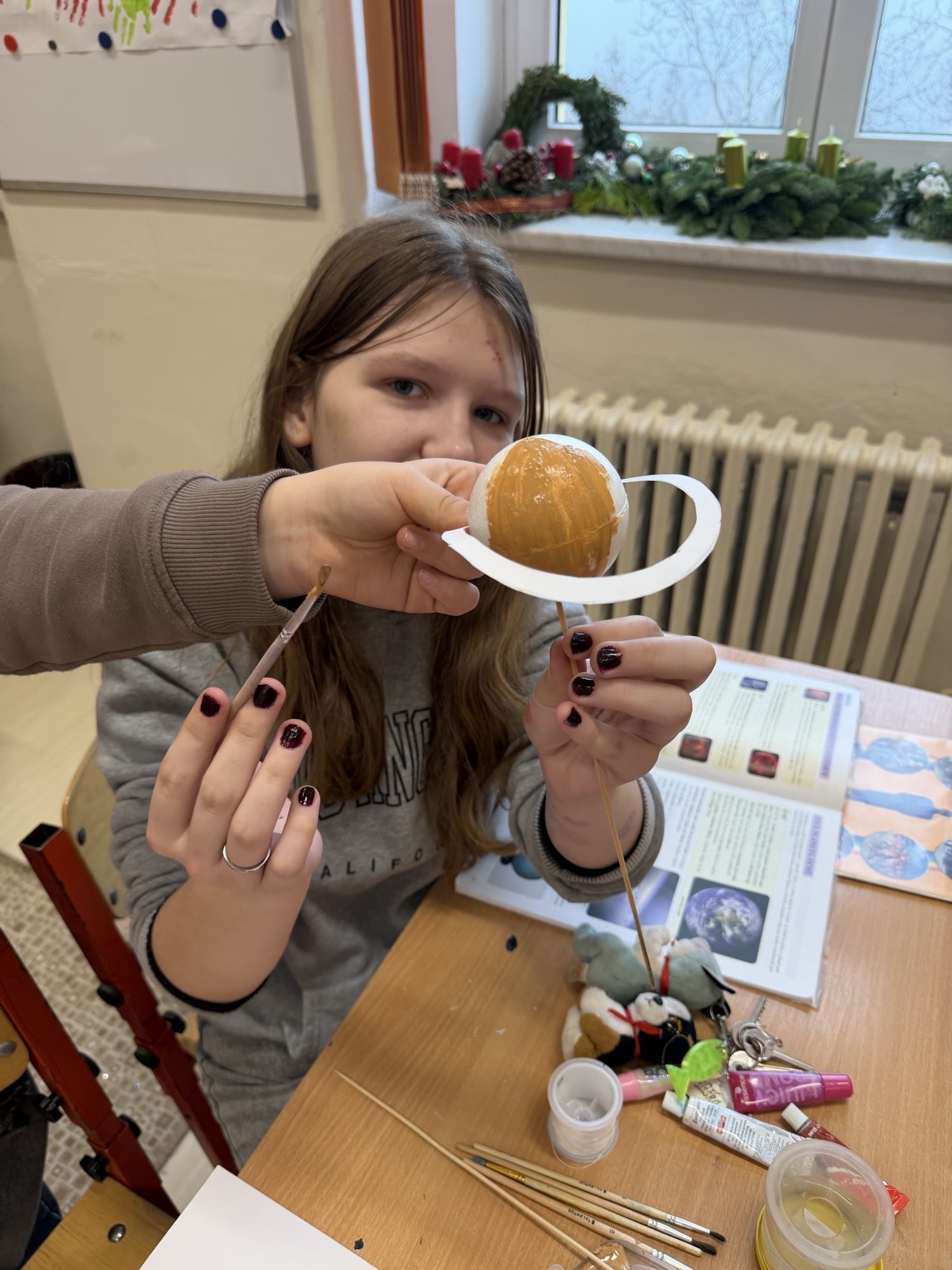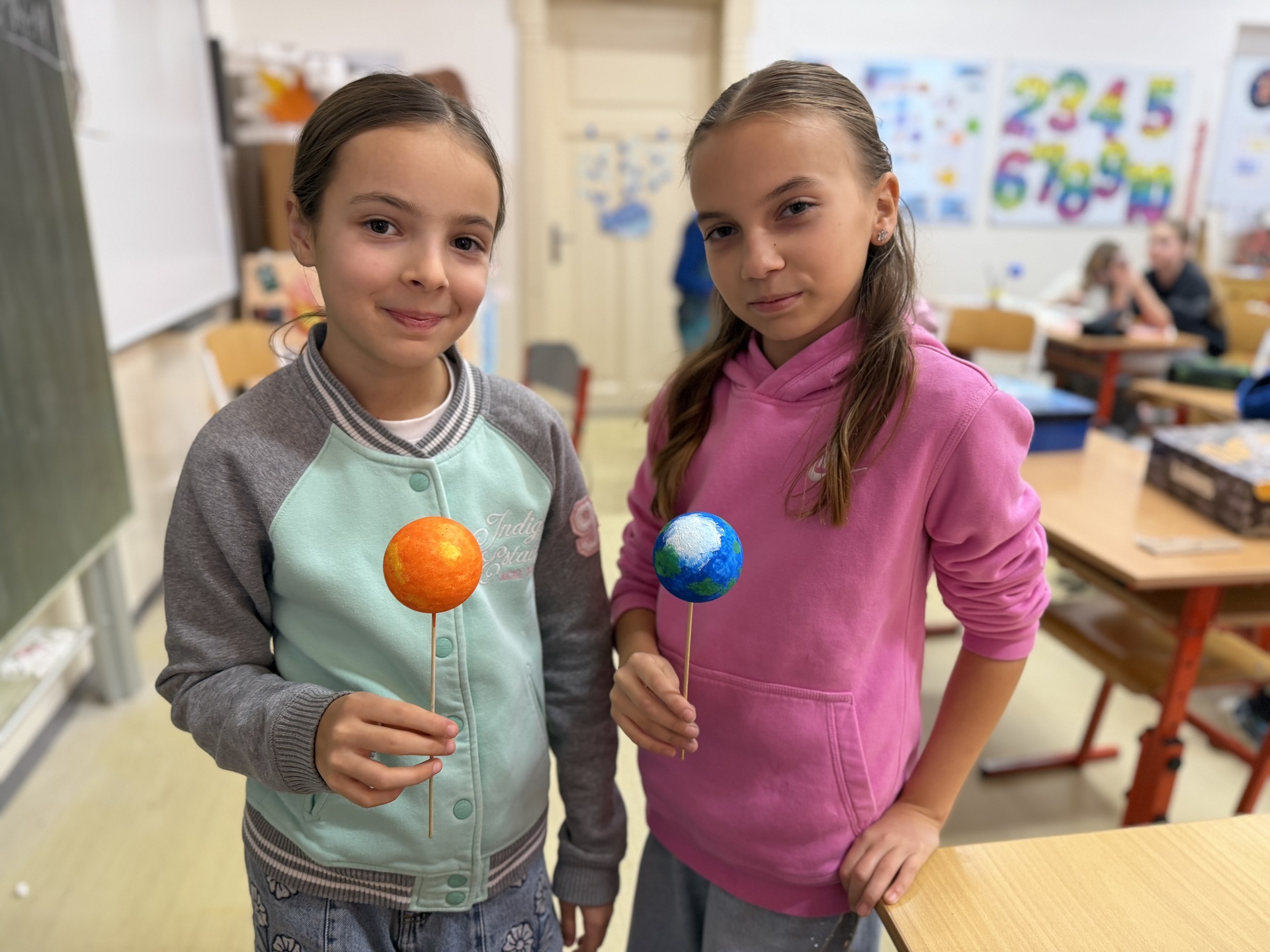 Poté jsme všechny planety spojili a vytvořili naši vlastní sluneční soustavu. Při práci si děti zopakovaly názvy planet, jejich pořadí kolem Slunce a zajímavosti, které o nich víme. Po vytvoření všech planet jsme vzali naše planety a obíhali jsme společně kolem Slunce.