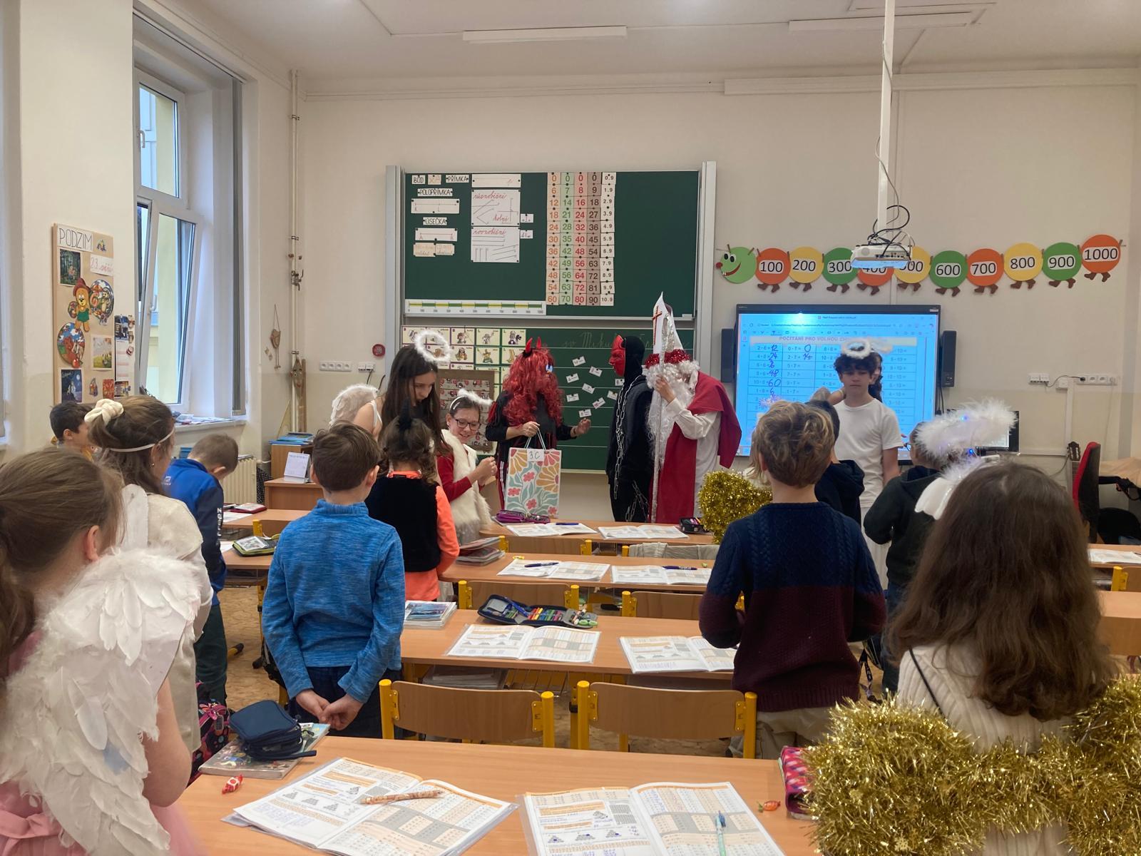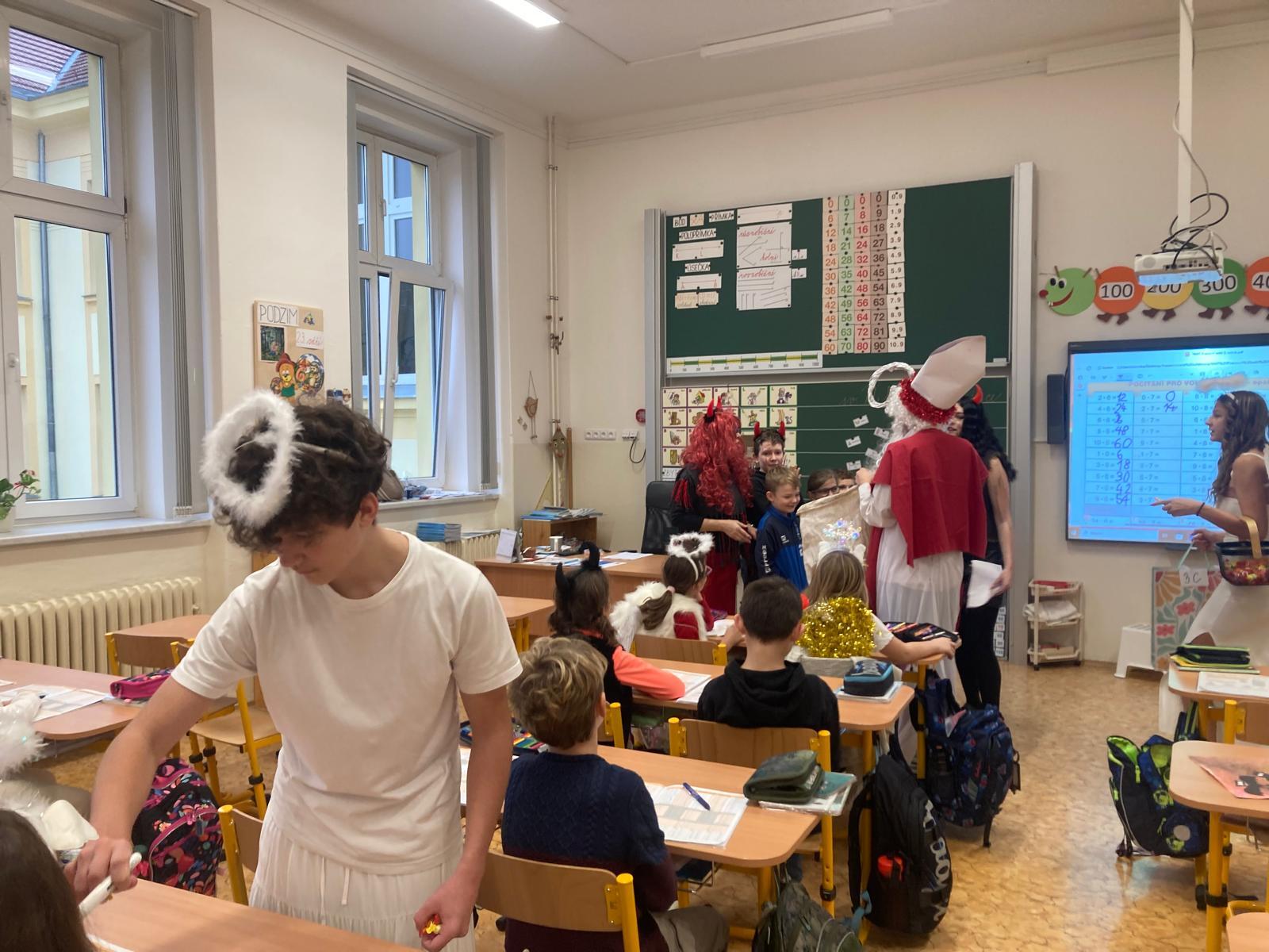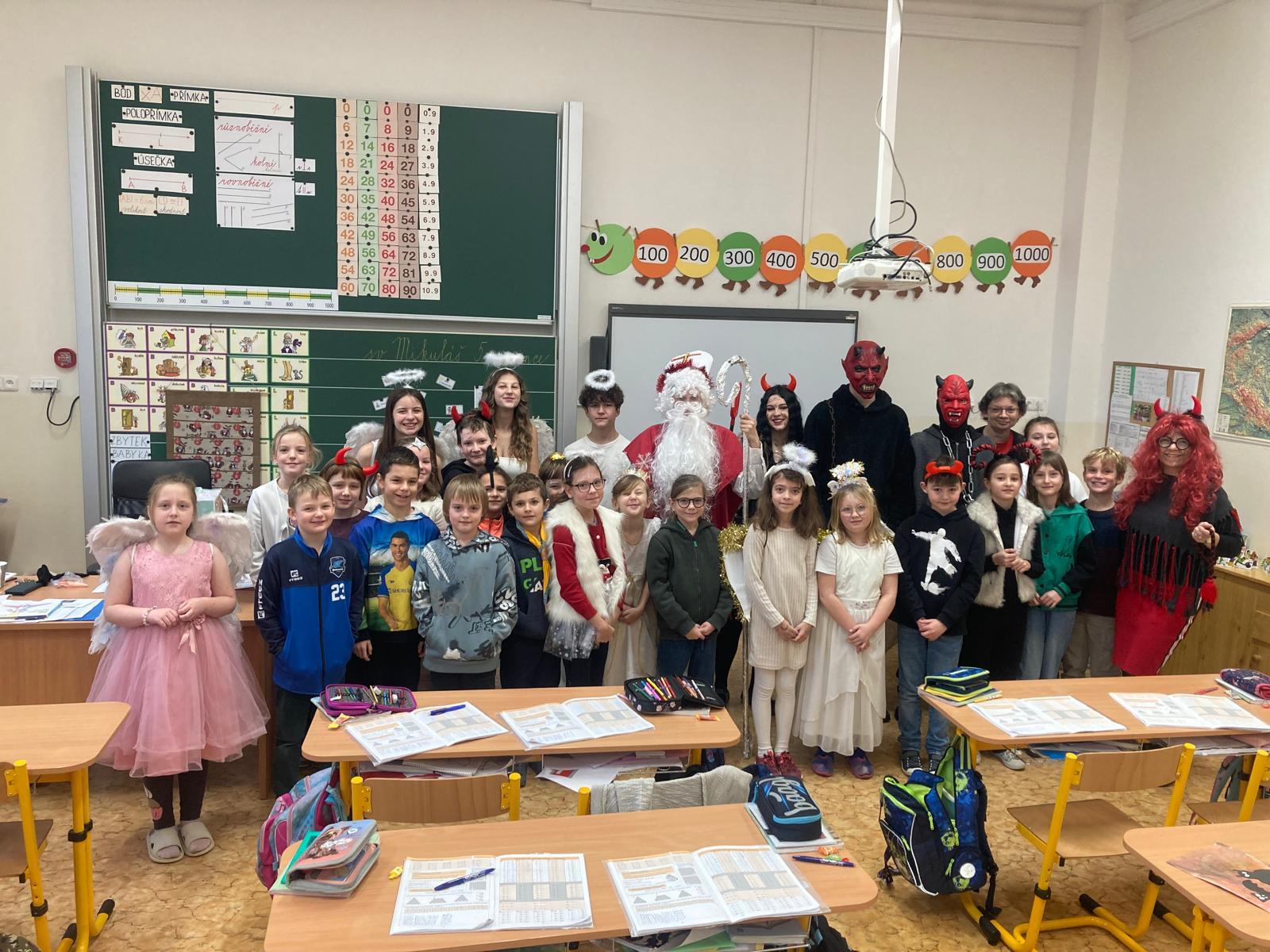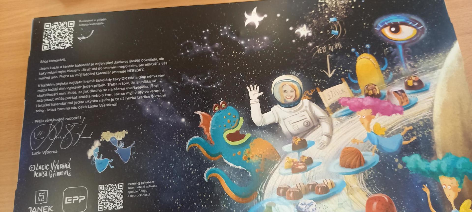 Po Barboře chodí Mikuláš. V pátek 5.12. to ve škole řinčelo řetězy. Andělé v čele s Mikulášem a partou čertů každý rok obcházejí třídy, dávají do pytle „zlobivce“ a těm hodným nadělují sladkosti. Vesmířané ve 3.C dostali krásný Nebeský adventní kalendář. Po otevření okénka s čokoládou na nás vykouklo překvapení - QR kód s odkazem na web s povídáním o vesmíru. Čekání na Ježíška si tedy ve škole každý den zpestříme díky novým informacím o Sluneční soustavě, hvězdách, kometě….. Kalendář připravila známá moderátorka Lucie Výborná.