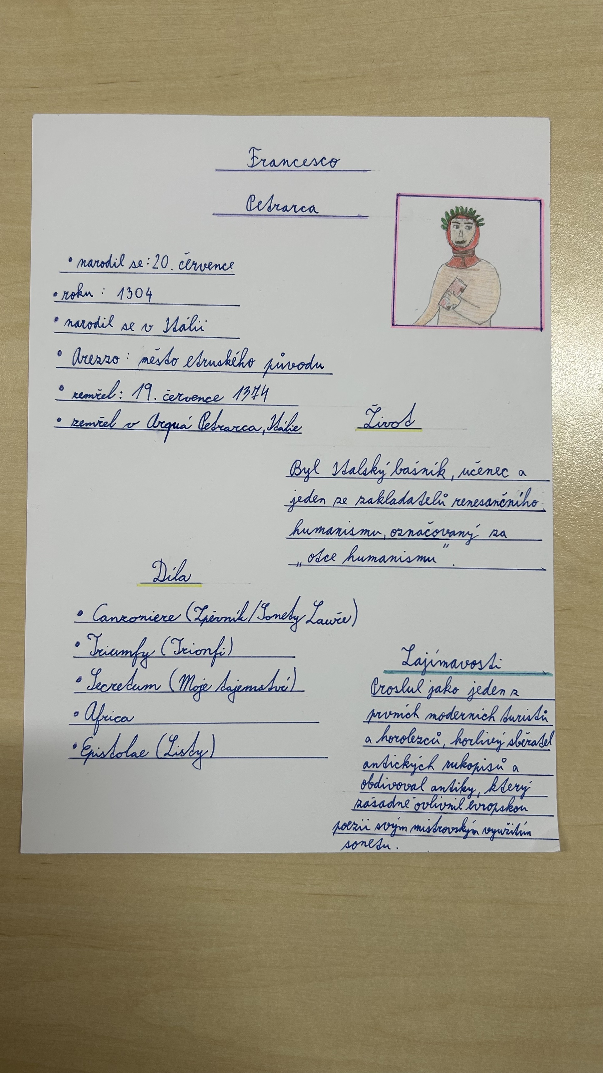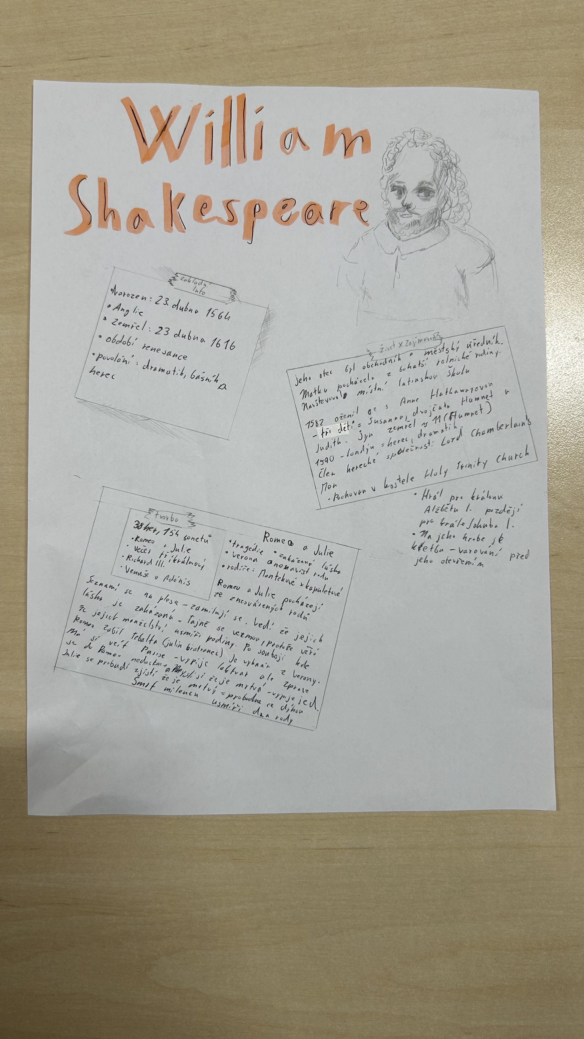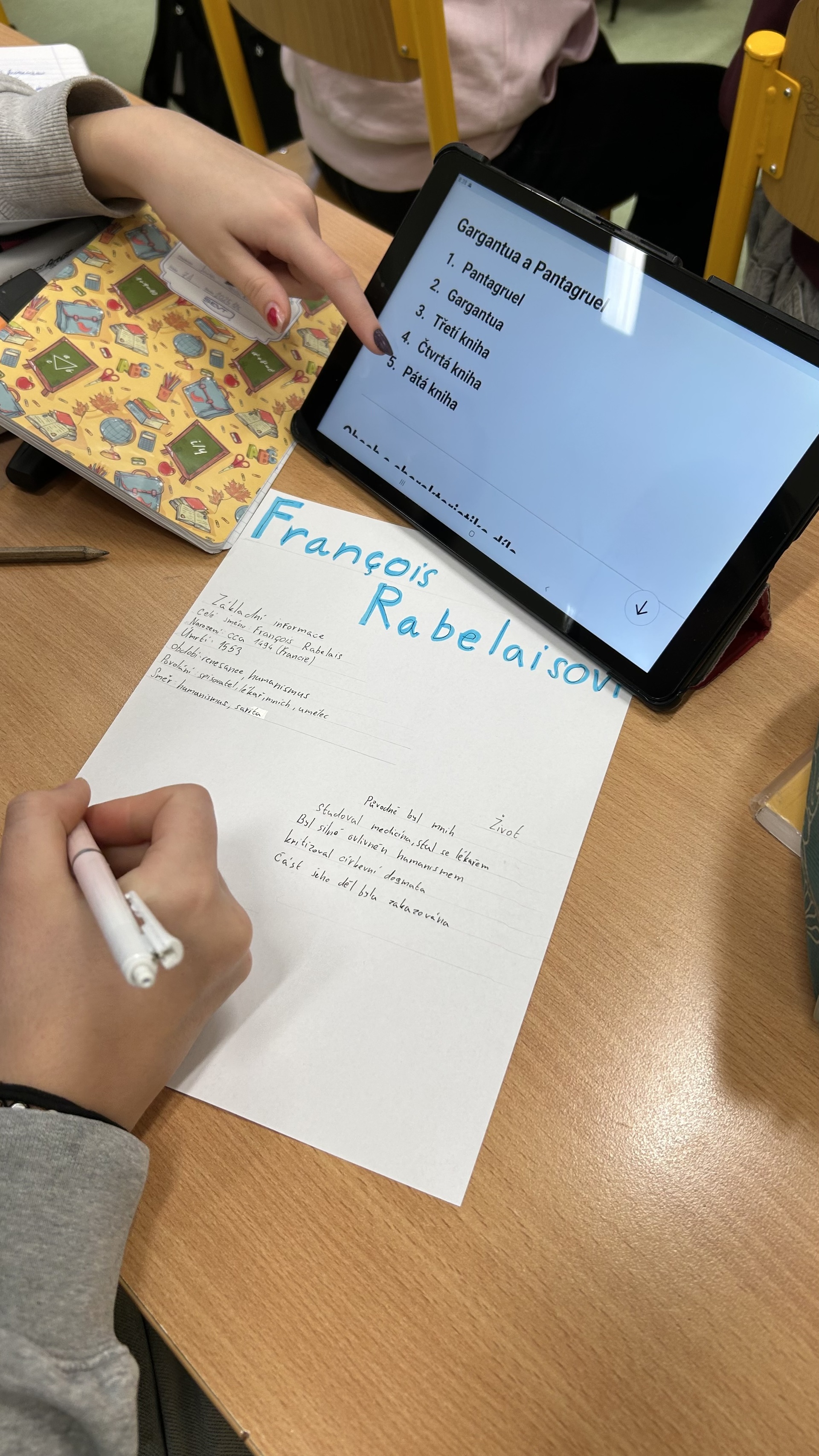 Na závěr tématu měli žáci za úkol ve skupinách zpracovat vybraného autora. Při práci využívali tablety, na nichž vyhledávali informace o životech autorů a jejich nejvýznamnějších dílech. Součástí úkolu bylo také výtvarné zpracování portrétů jednotlivých spisovatelů, se kterým se žáci velmi dobře popasovali a prokázali svou kreativitu.