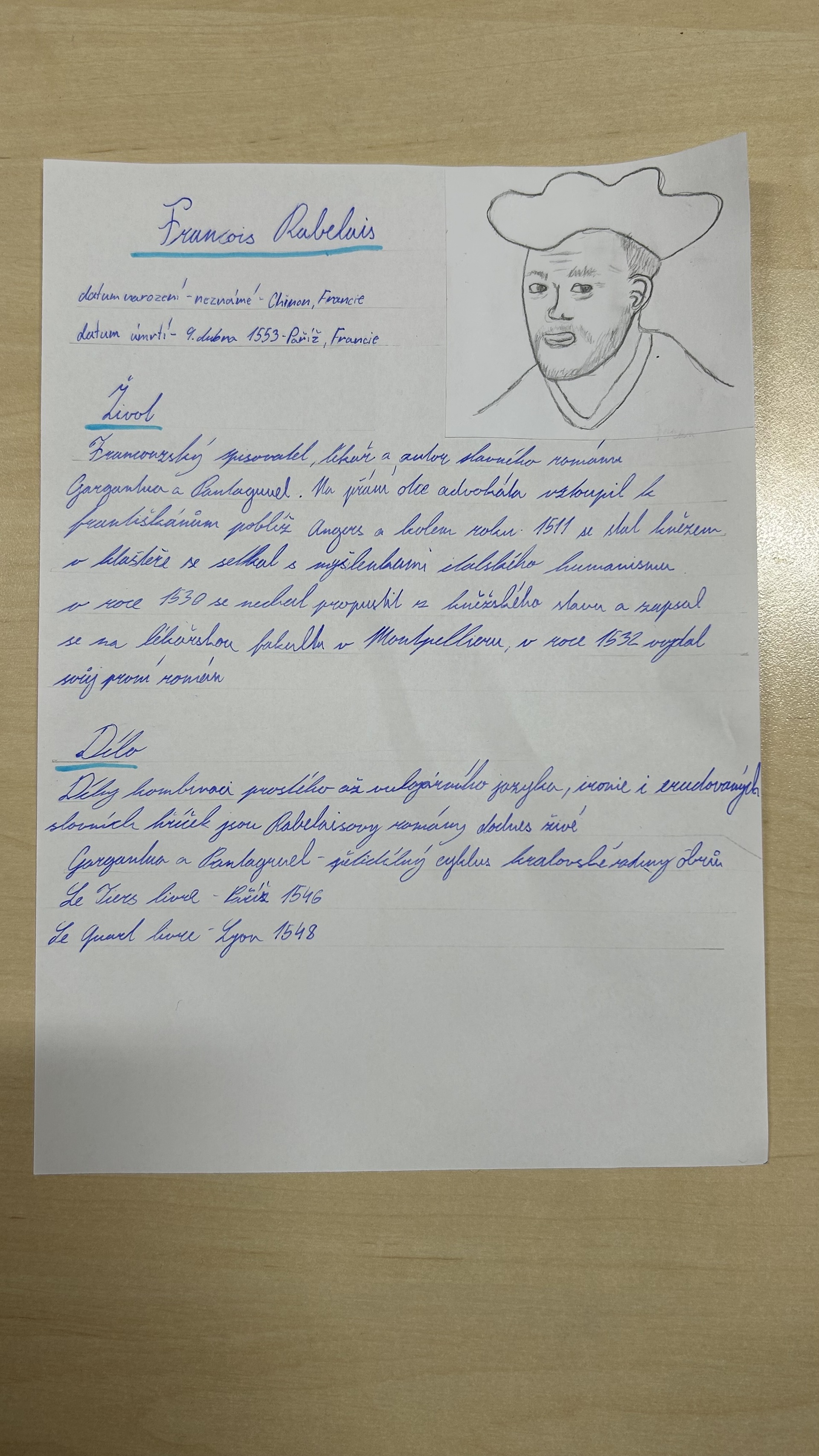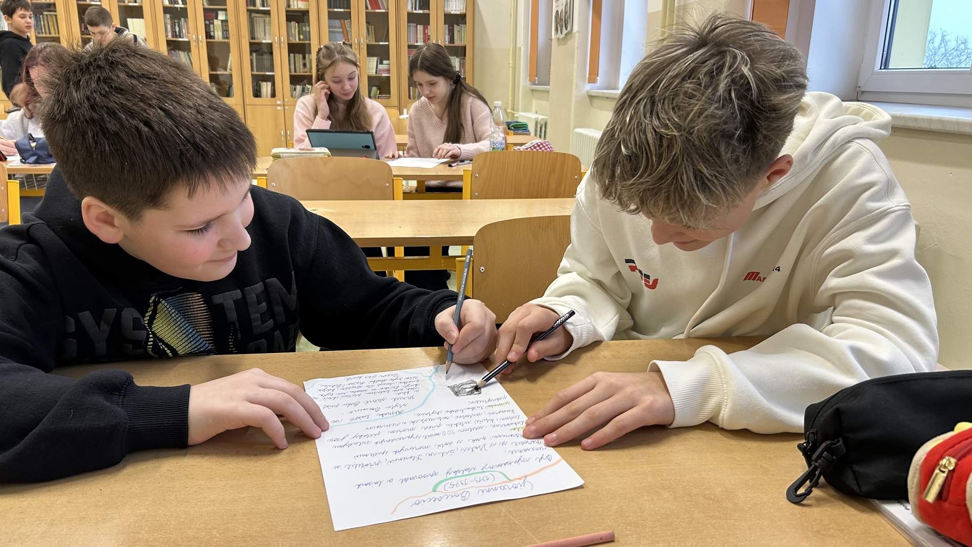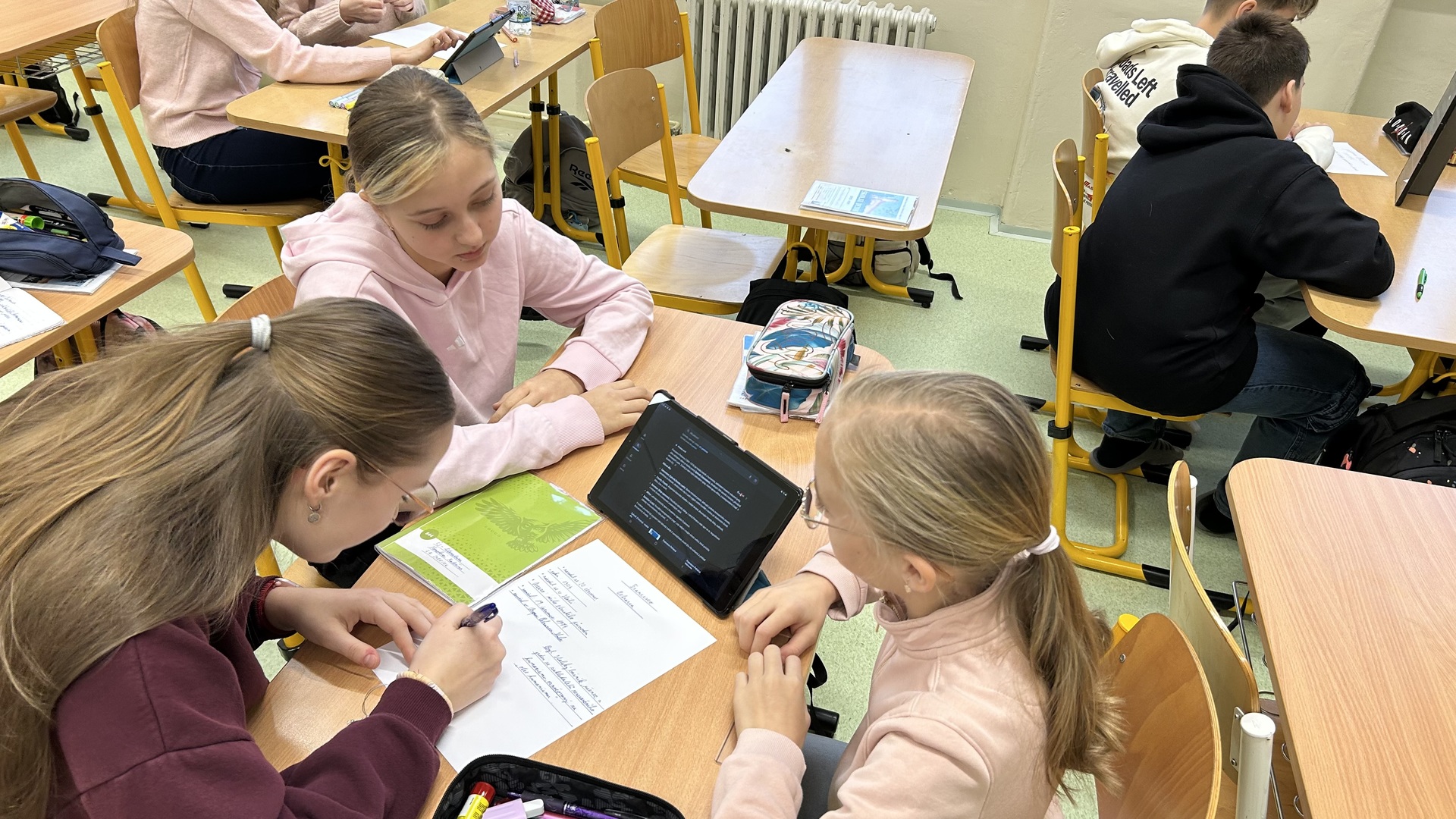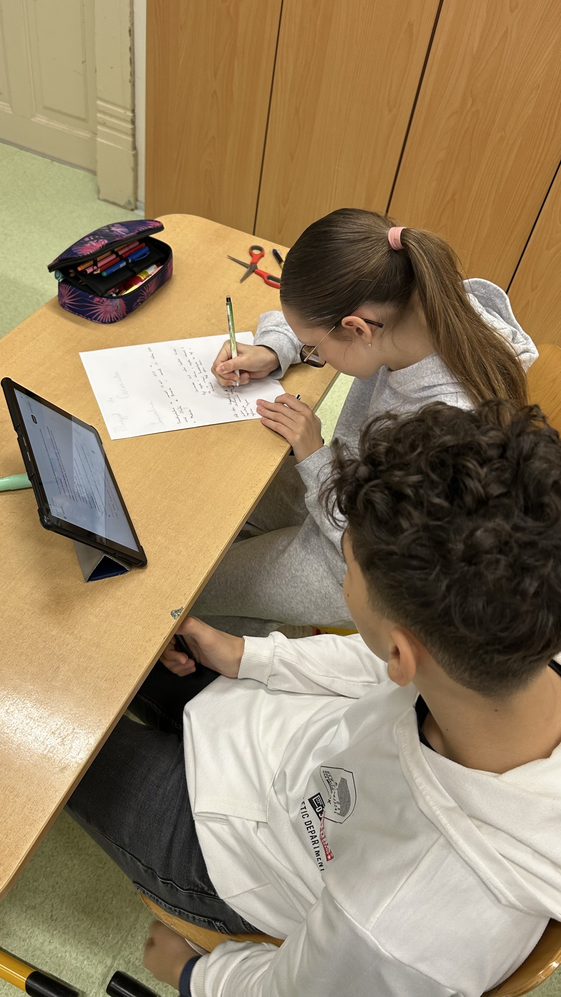 Na závěr tématu měli žáci za úkol ve skupinách zpracovat vybraného autora. Při práci využívali tablety, na nichž vyhledávali informace o životech autorů a jejich nejvýznamnějších dílech. Součástí úkolu bylo také výtvarné zpracování portrétů jednotlivých spisovatelů, se kterým se žáci velmi dobře popasovali a prokázali svou kreativitu.