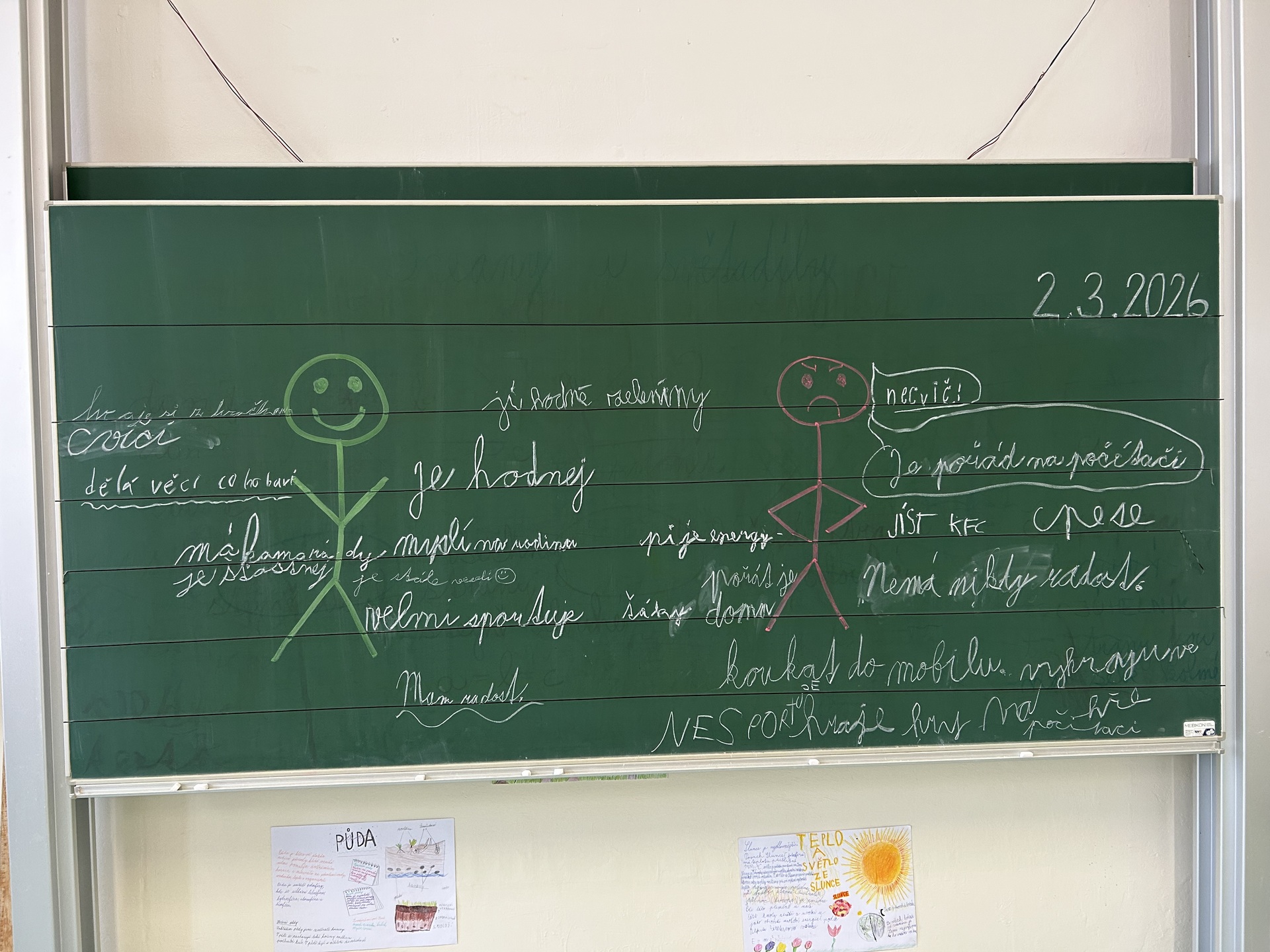 V rámci třídnické hodiny na 1. stupni jsme se věnovali tématu zdravého životního stylu a duševního zdraví. S dětmi jsme si povídali o tom, proč je důležité pravidelně jíst, dostatečně spát, hýbat se a také mluvit o svých pocitech.