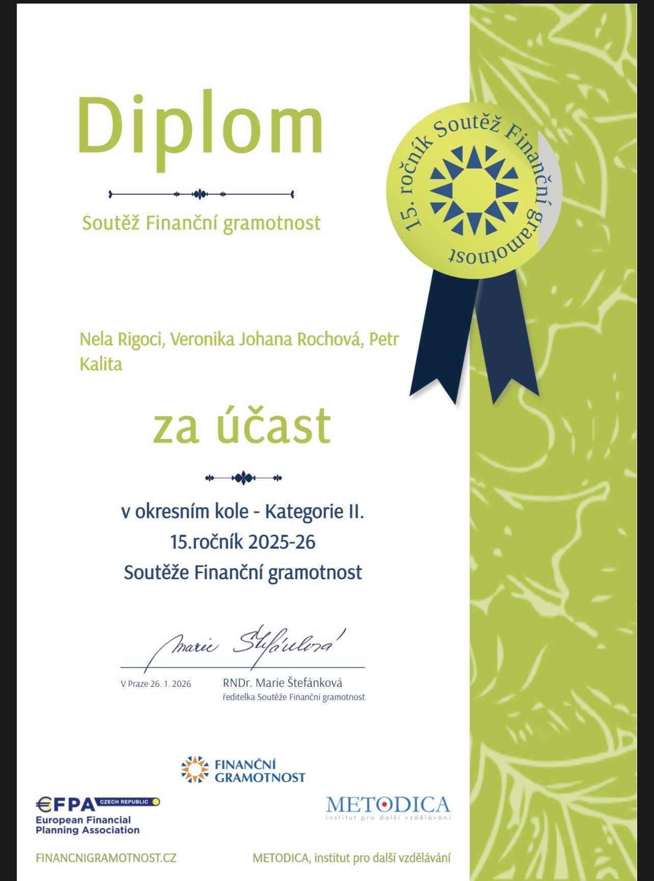 Na postup do dalšího kola jim chyběl opravdu jen malý kousek – od postupových příček je dělilo minimum bodů. Naši žáci dosáhli 29 bodů z maximálních 35, což je velmi pěkný výsledek a důkaz jejich dobré orientace ve světě financí.