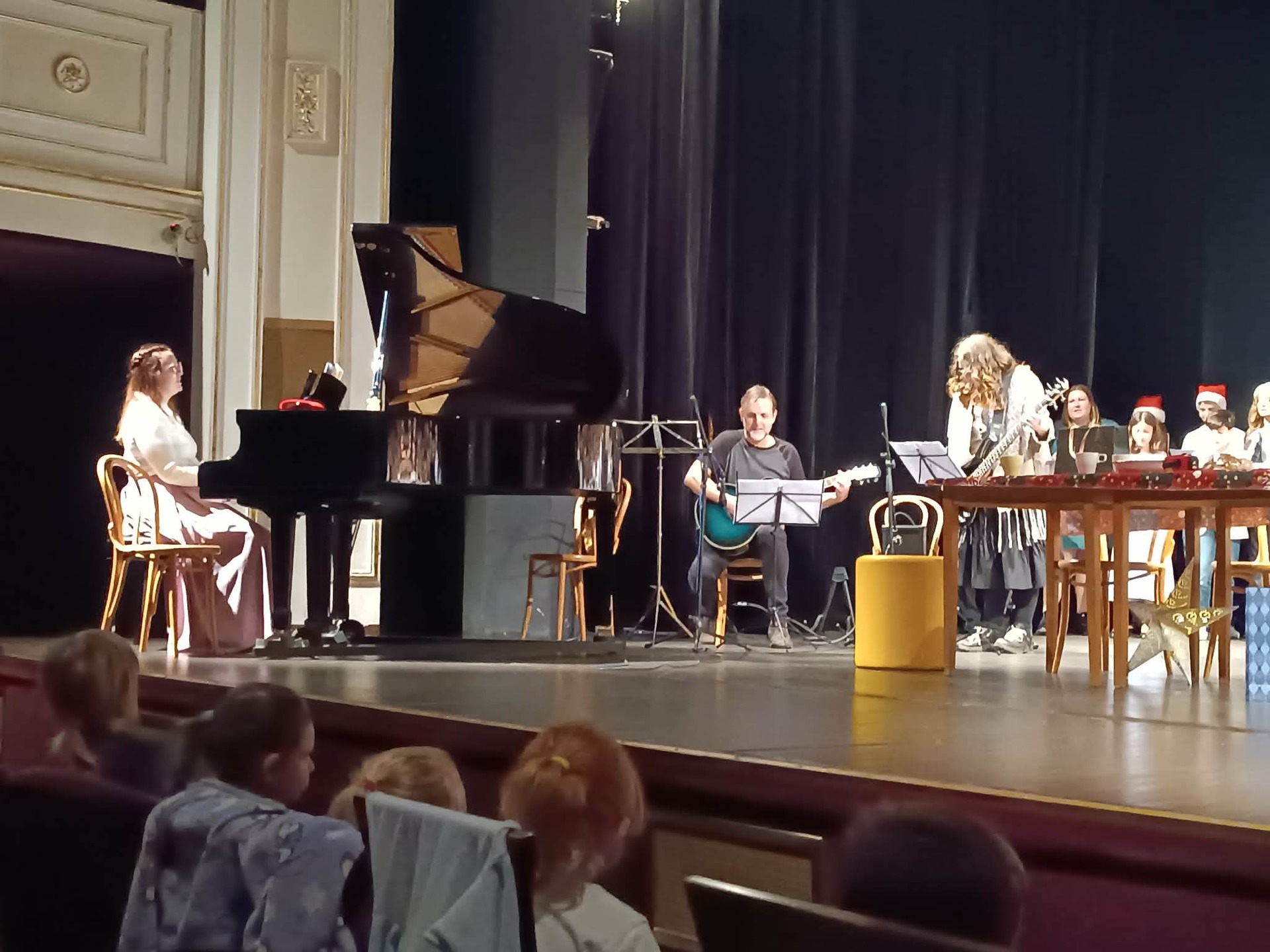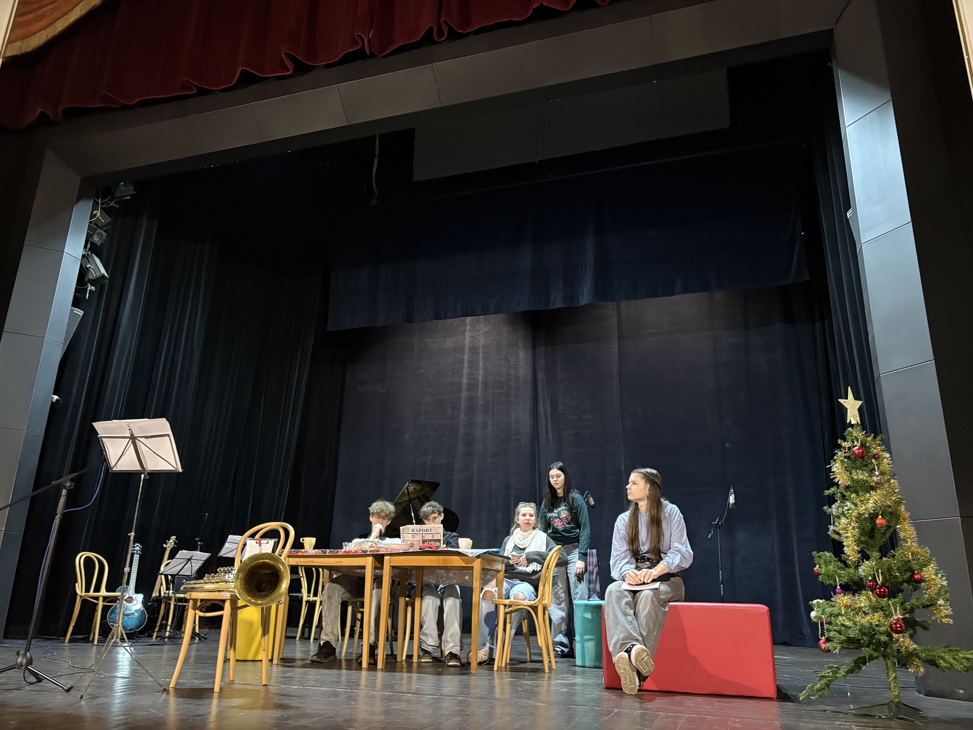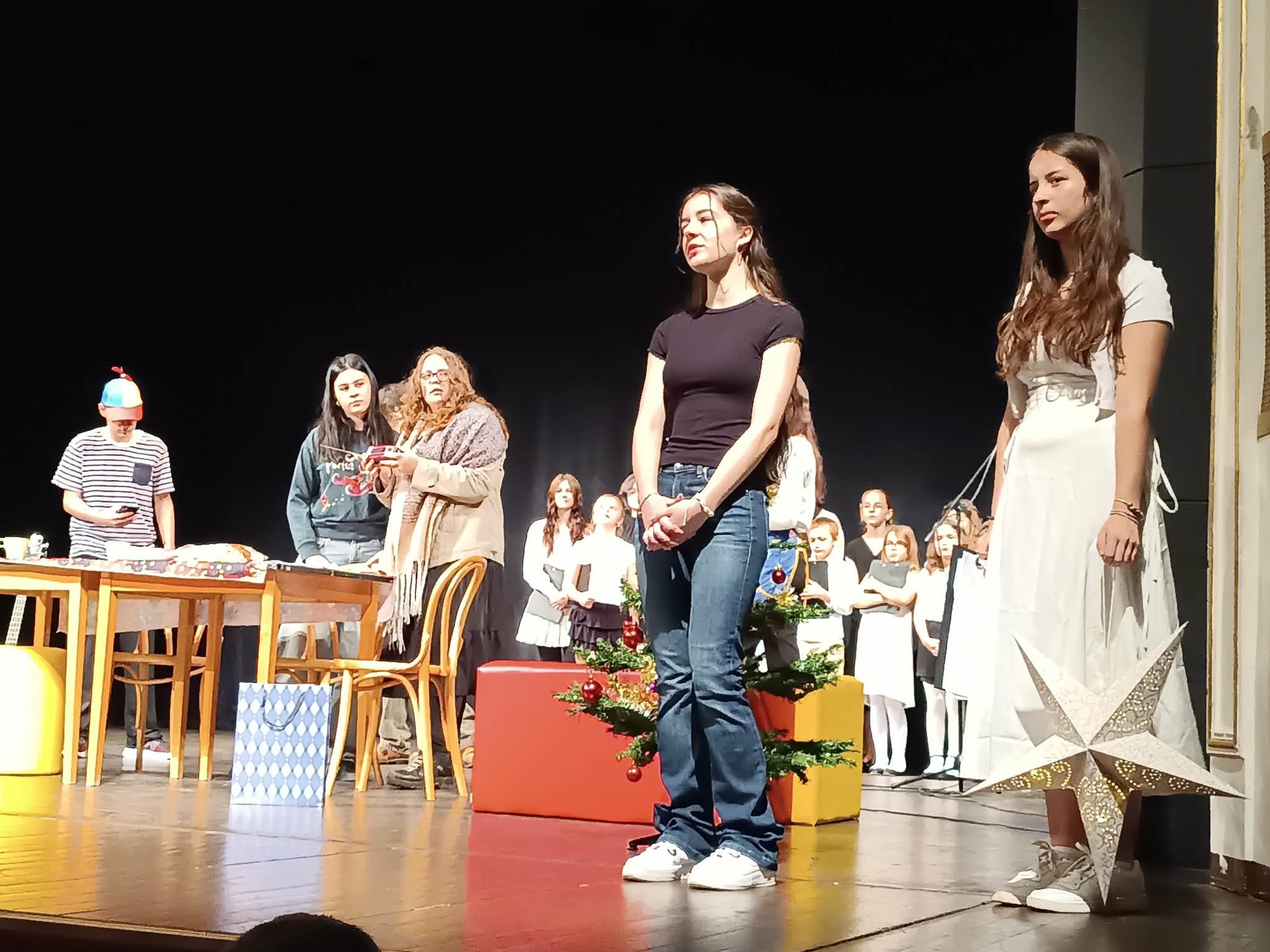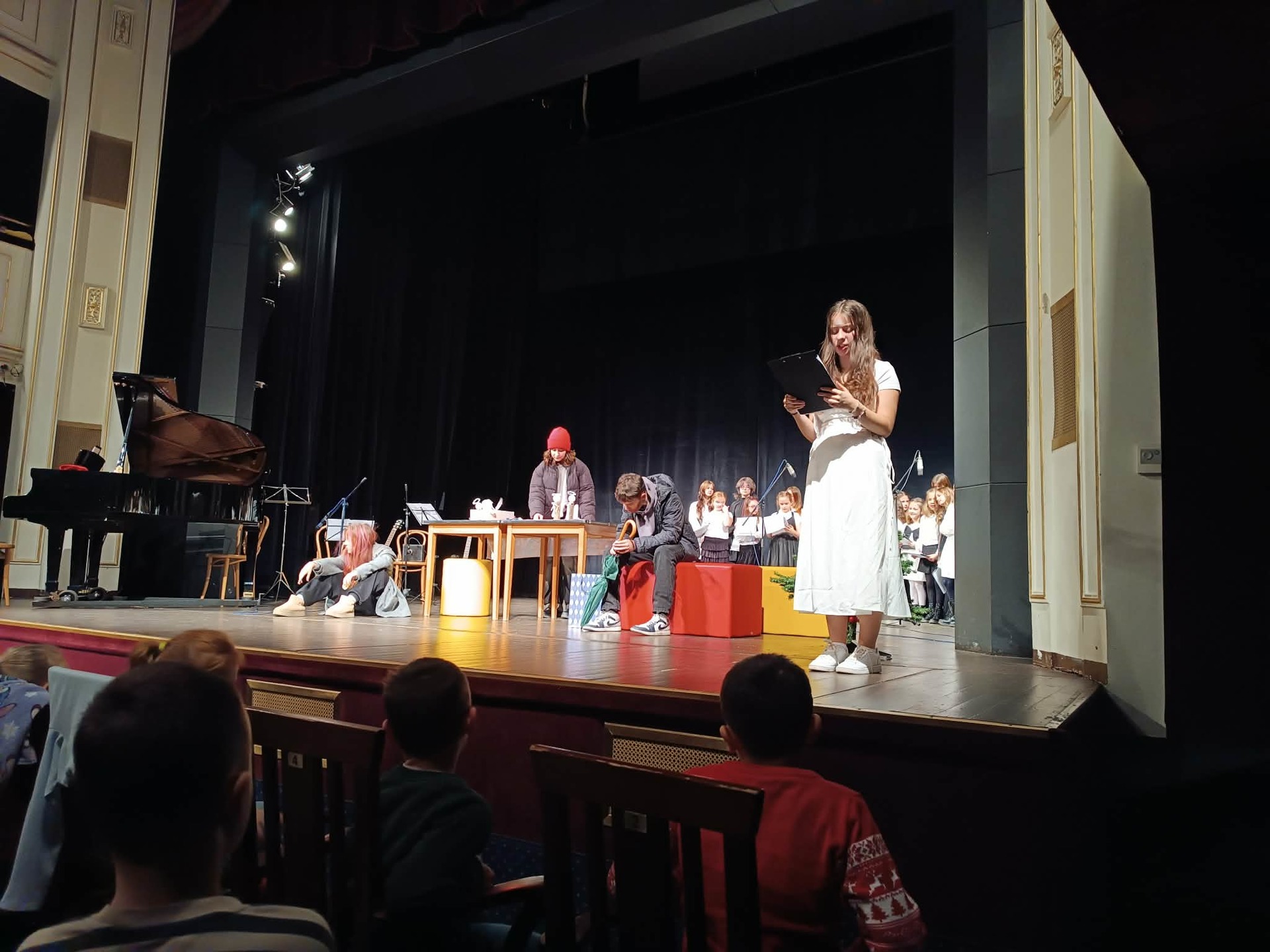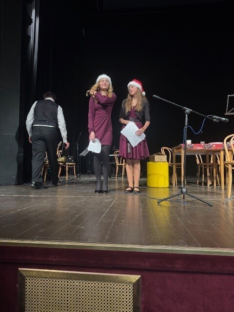 Druhá část koncertu byla věnována divadelnímu představení Vánoce naruby. Příběh s vánoční tematikou zaujal diváky všech věkových kategorií a byl doplněn vystoupením školního pěveckého sboru, který zazpíval několik vánočních písní za doprovodu školní kapely.