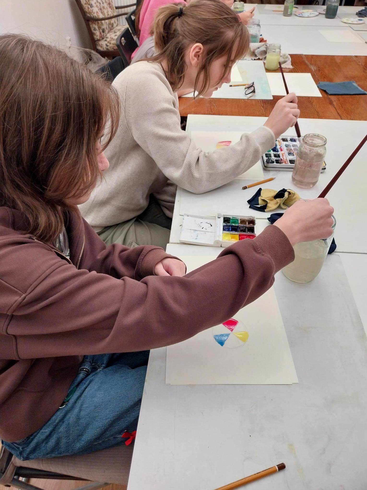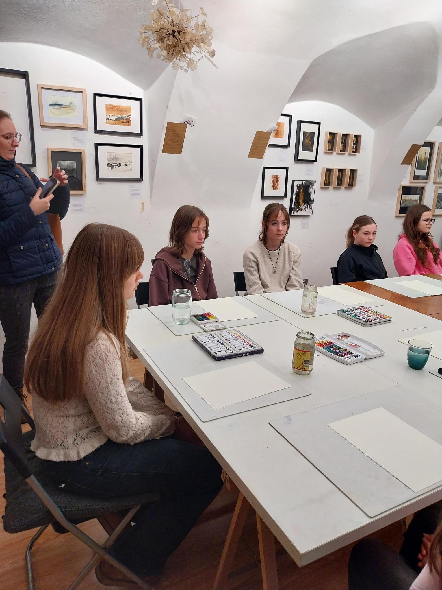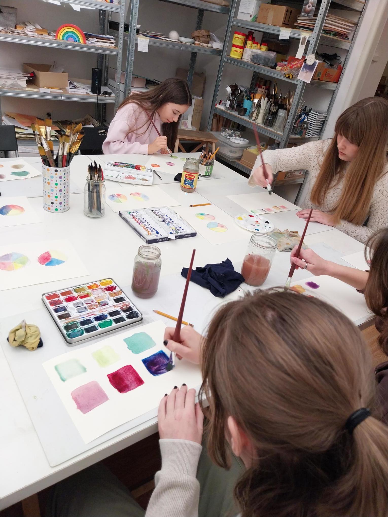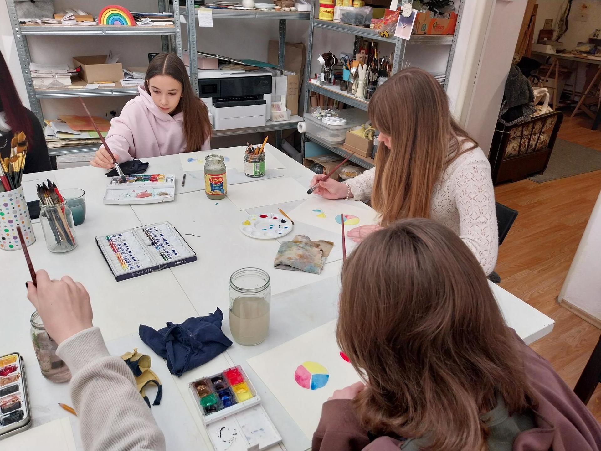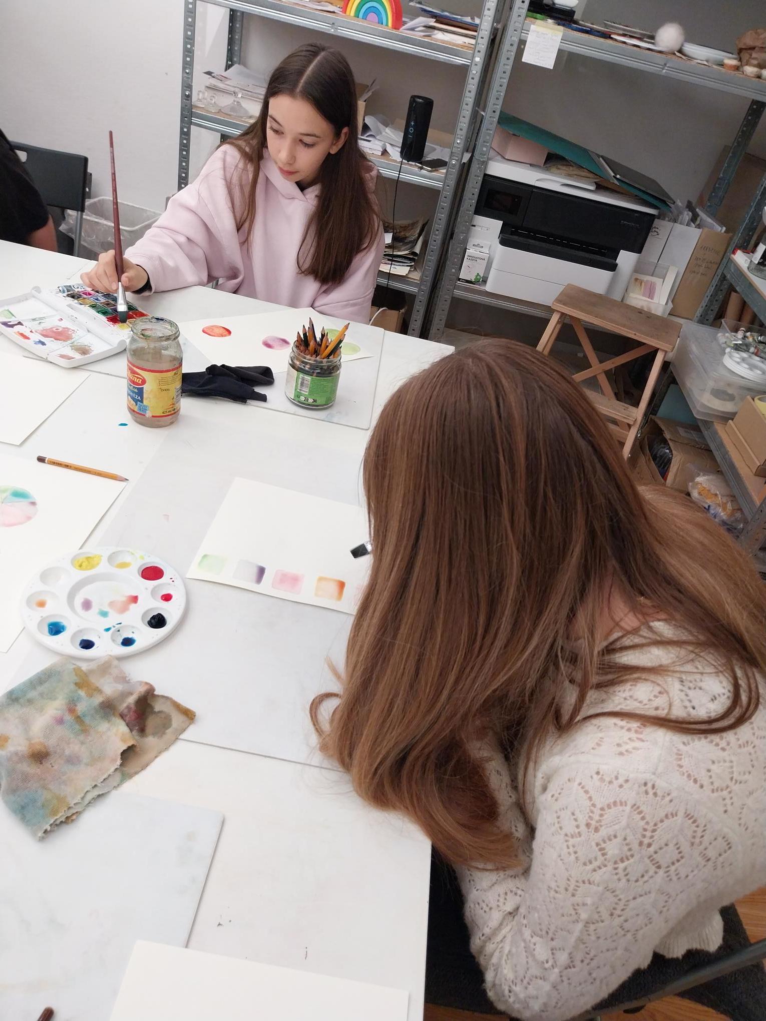 Poté se již žáci pustili do práce. Na začátku pracovali s akvarelem a pro mnohé z nich to byla první zkušenost s těmito barvami. Činnost byla založena na základních a doplňkových barvách.