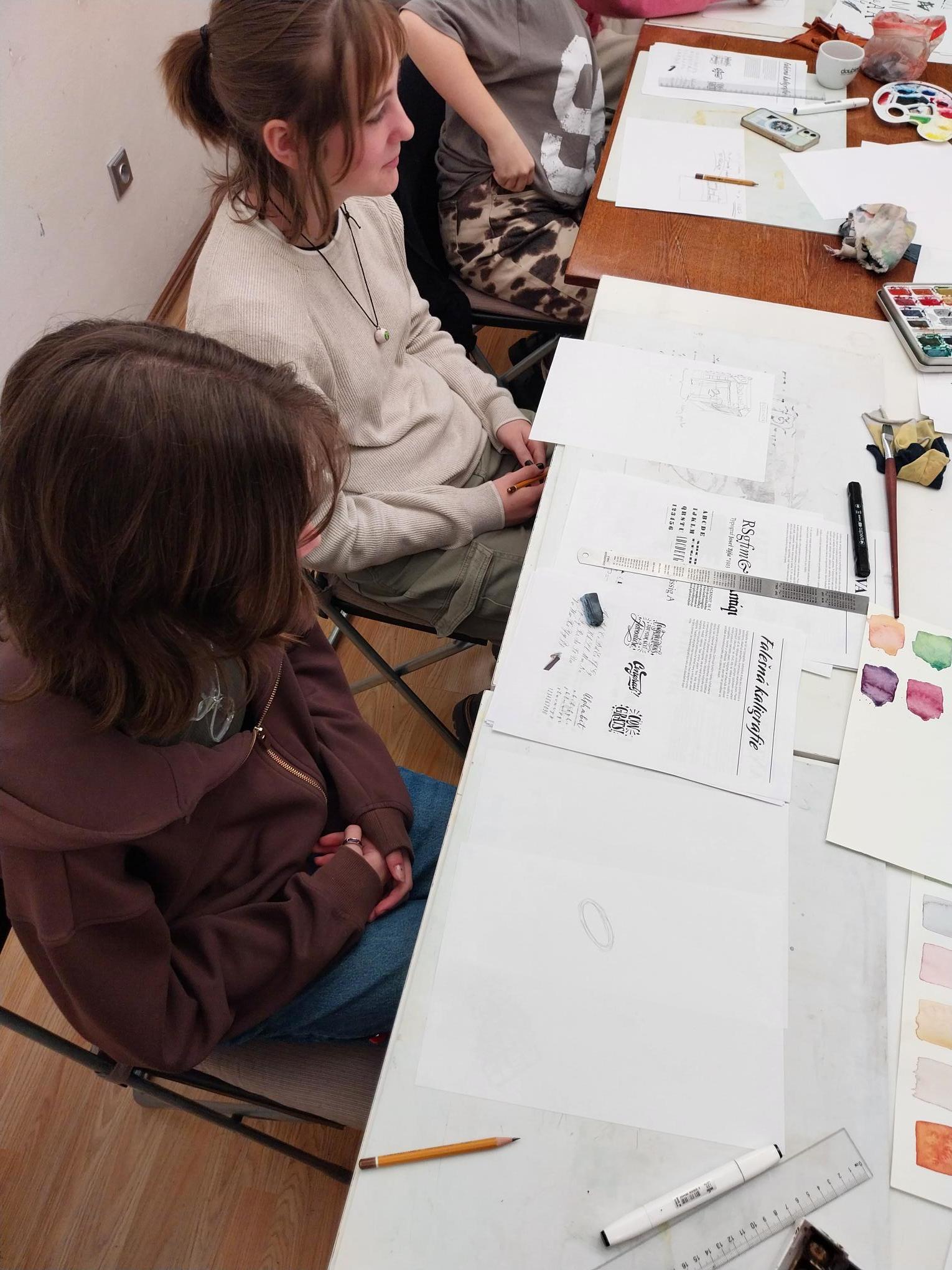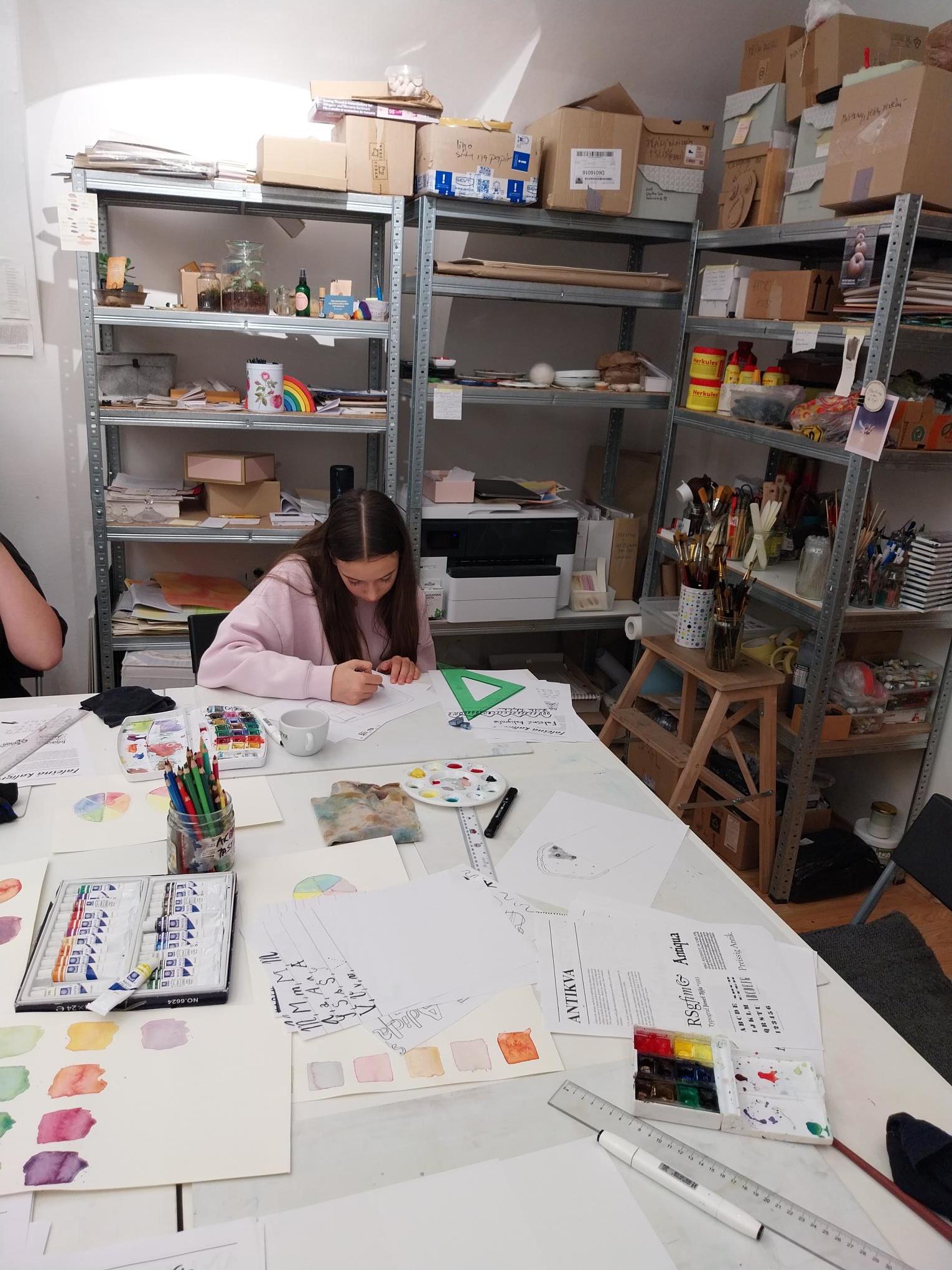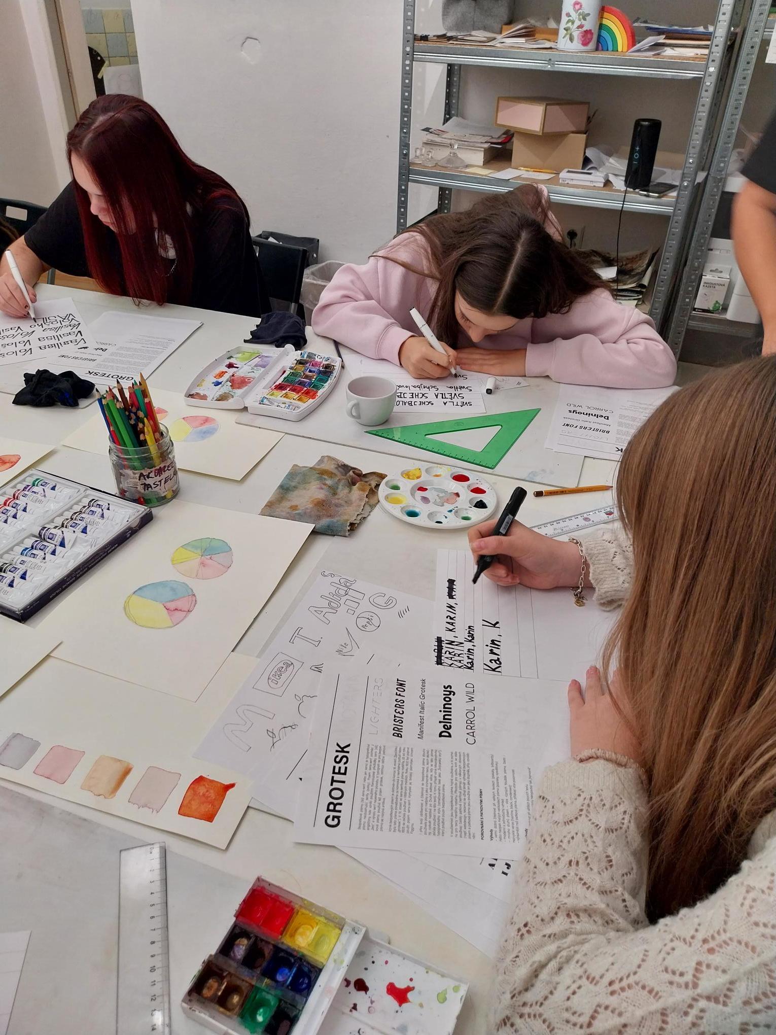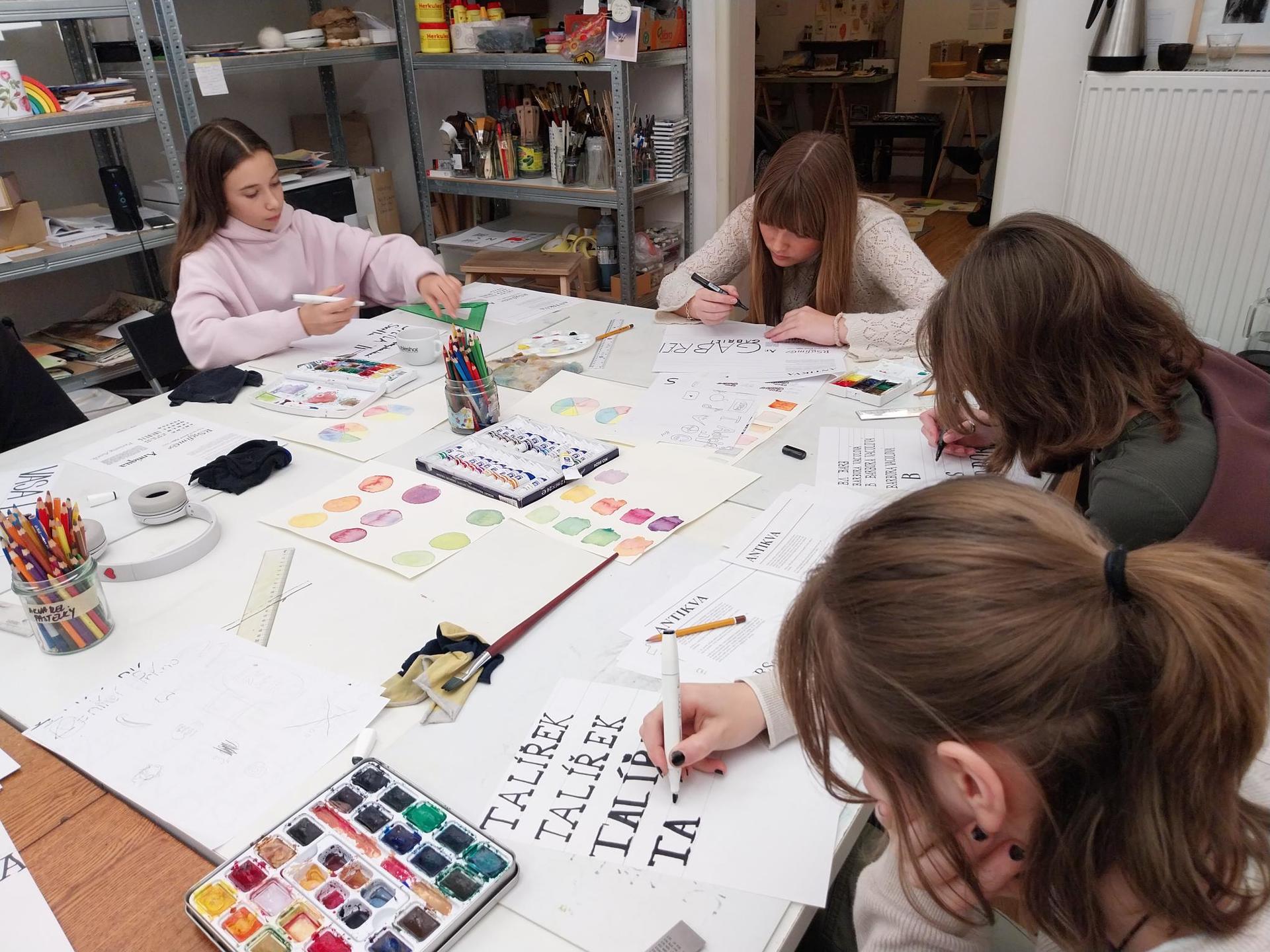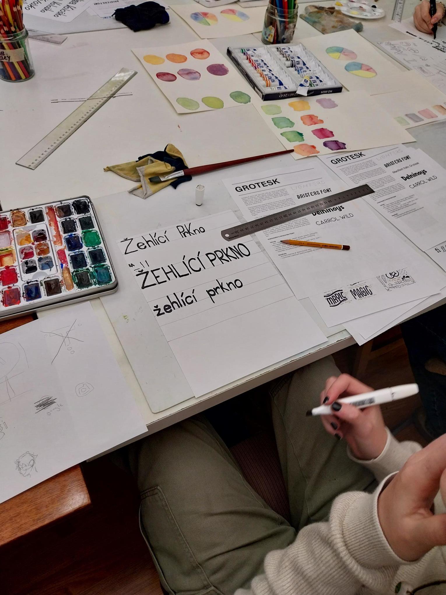 Následovalo povídání o grafickém designu. Žáci se dozvěděli a vyzkoušeli moderní typografii, anatomii písma a falešnou kaligrafii.
