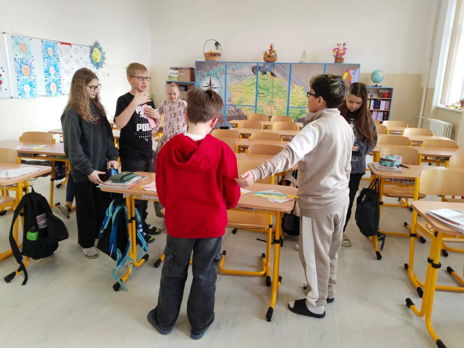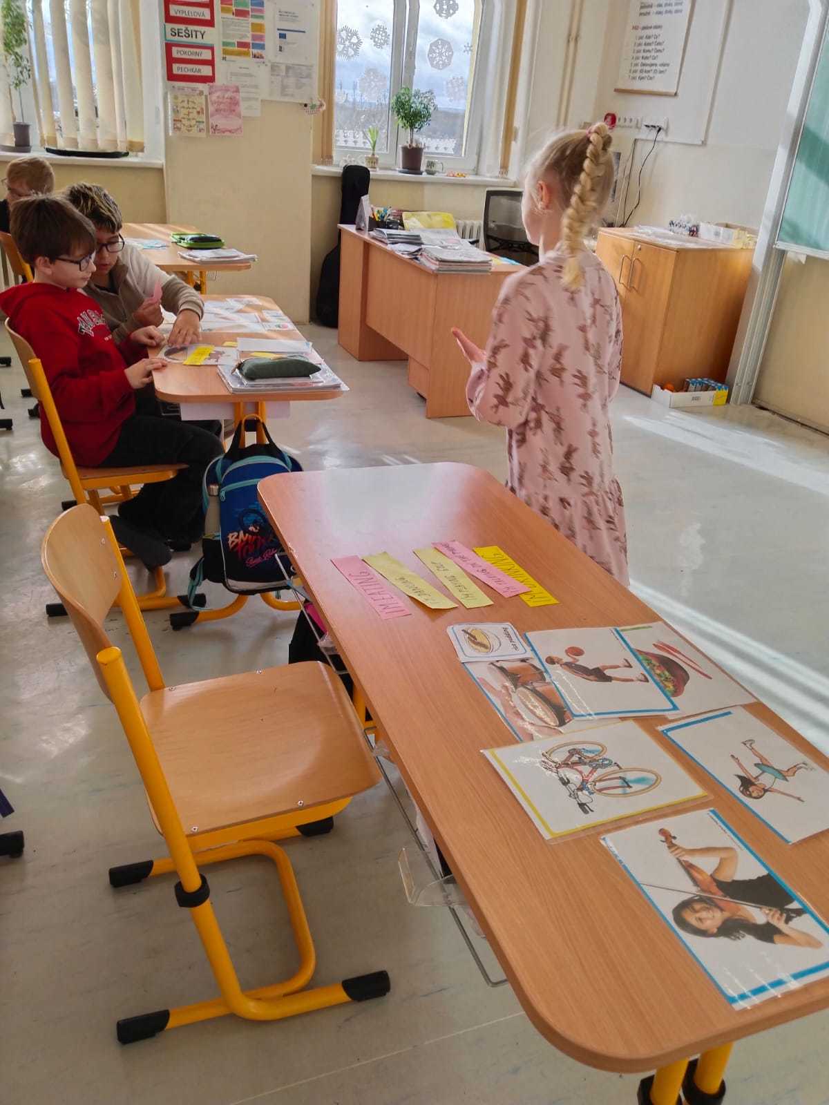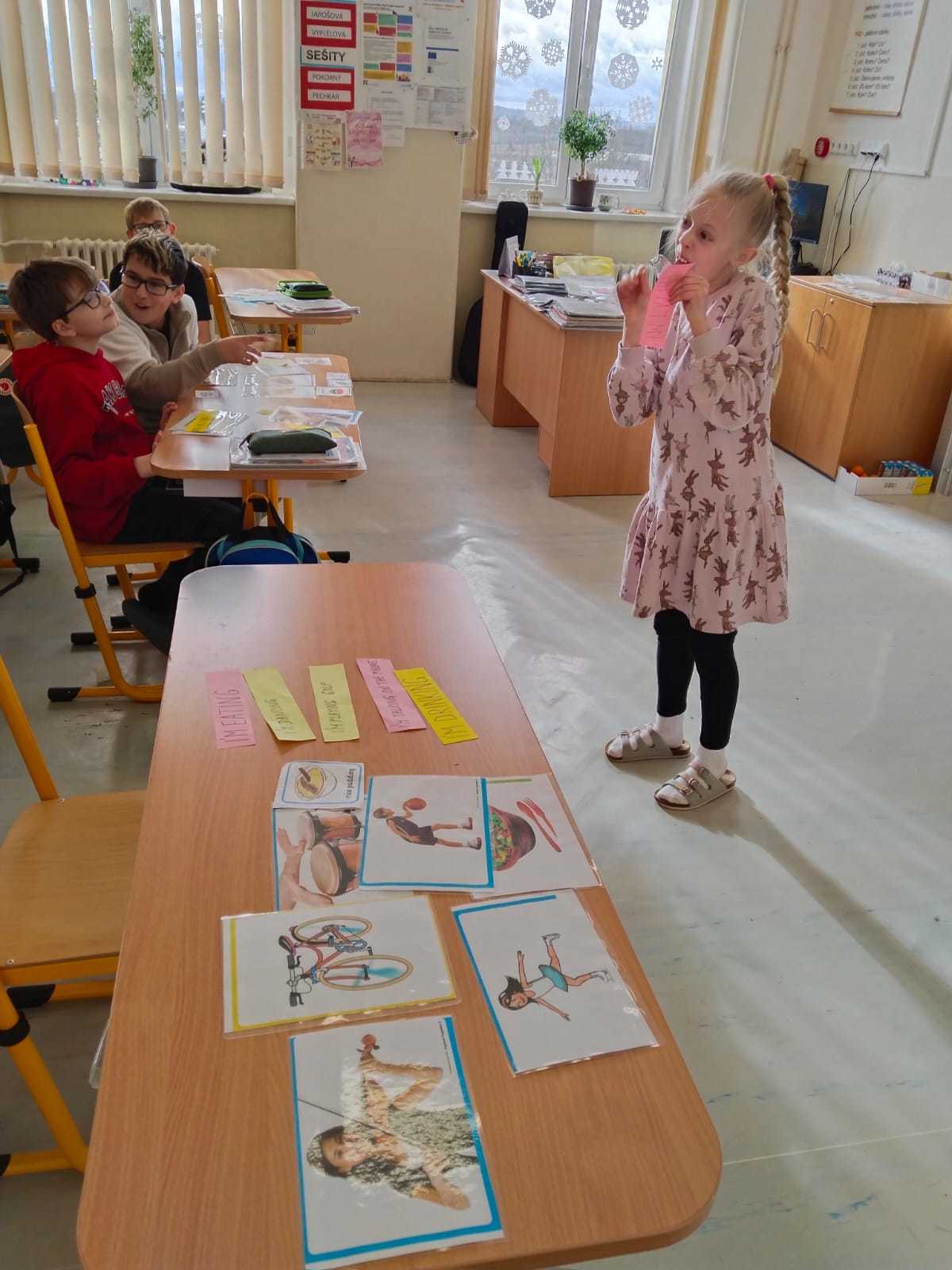 Všichni dostali obrázky aktivit ze slovní zásoby „Food and Drink“, „Doing Sports“ a „Musical Instruments“ společně s barevnými pruhy papíru s anglickými větami v přítomném čase průběhovém. Tento gramatický čas vyjadřuje děj, který se odehrává právě teď, proto měli žáci za úkol pomocí pantomimy, rekvizit i barevných obrázků předvést, jak právě teď řídí auto, jak hrají golf, jak pijí mléko, jak hrají na kytaru, jak jedou nyní na kole apod. a jejich spolužák měl za úkol danou aktivitu rozpoznat. Poté, co ji rozpoznal, musel si u spolužáka za použití otázky: „What are you doing? Are you ….ing?“ ověřit, jestli jeho aktivitu správně určil. Každý žák se chopil této činnosti bez ostychu a užili jsem si společně mnoho legrace. Při hře fungovala skvěle týmová spolupráce, všichni se do svých „rolí“ velmi položili a předvedli opravdový herecký výkon.