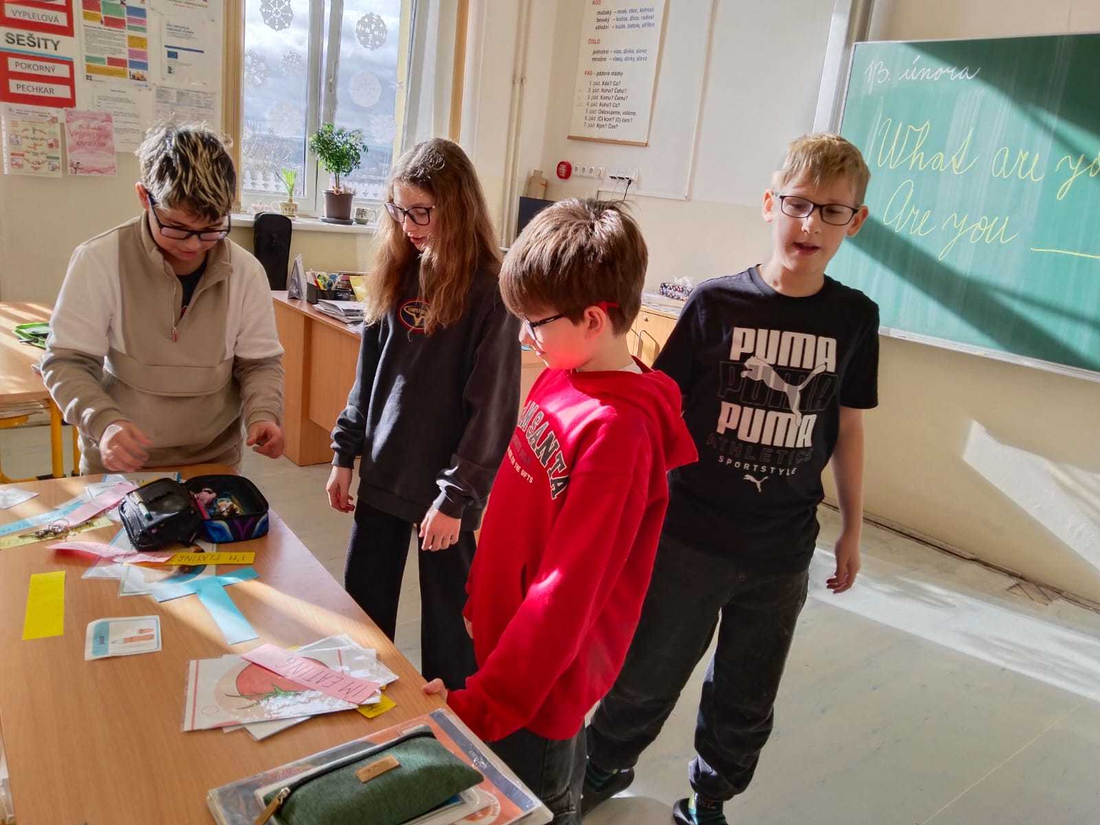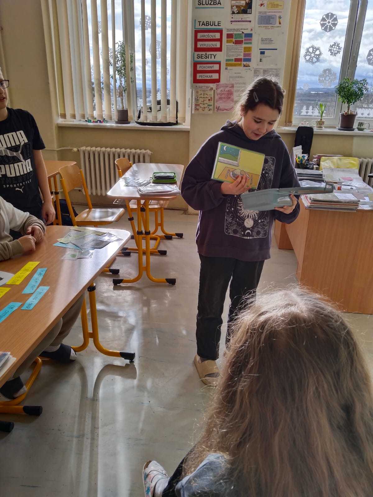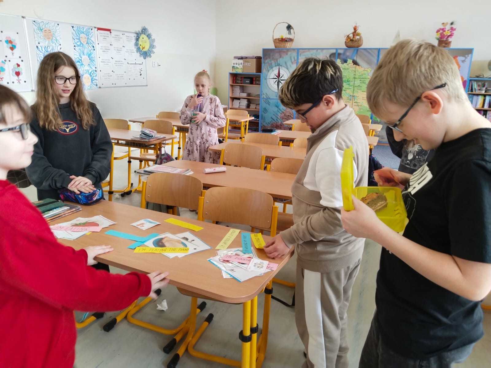 Všichni dostali obrázky aktivit ze slovní zásoby „Food and Drink“, „Doing Sports“ a „Musical Instruments“ společně s barevnými pruhy papíru s anglickými větami v přítomném čase průběhovém. Tento gramatický čas vyjadřuje děj, který se odehrává právě teď, proto měli žáci za úkol pomocí pantomimy, rekvizit i barevných obrázků předvést, jak právě teď řídí auto, jak hrají golf, jak pijí mléko, jak hrají na kytaru, jak jedou nyní na kole apod. a jejich spolužák měl za úkol danou aktivitu rozpoznat. Poté, co ji rozpoznal, musel si u spolužáka za použití otázky: „What are you doing? Are you ….ing?“ ověřit, jestli jeho aktivitu správně určil. Každý žák se chopil této činnosti bez ostychu a užili jsem si společně mnoho legrace. Při hře fungovala skvěle týmová spolupráce, všichni se do svých „rolí“ velmi položili a předvedli opravdový herecký výkon.