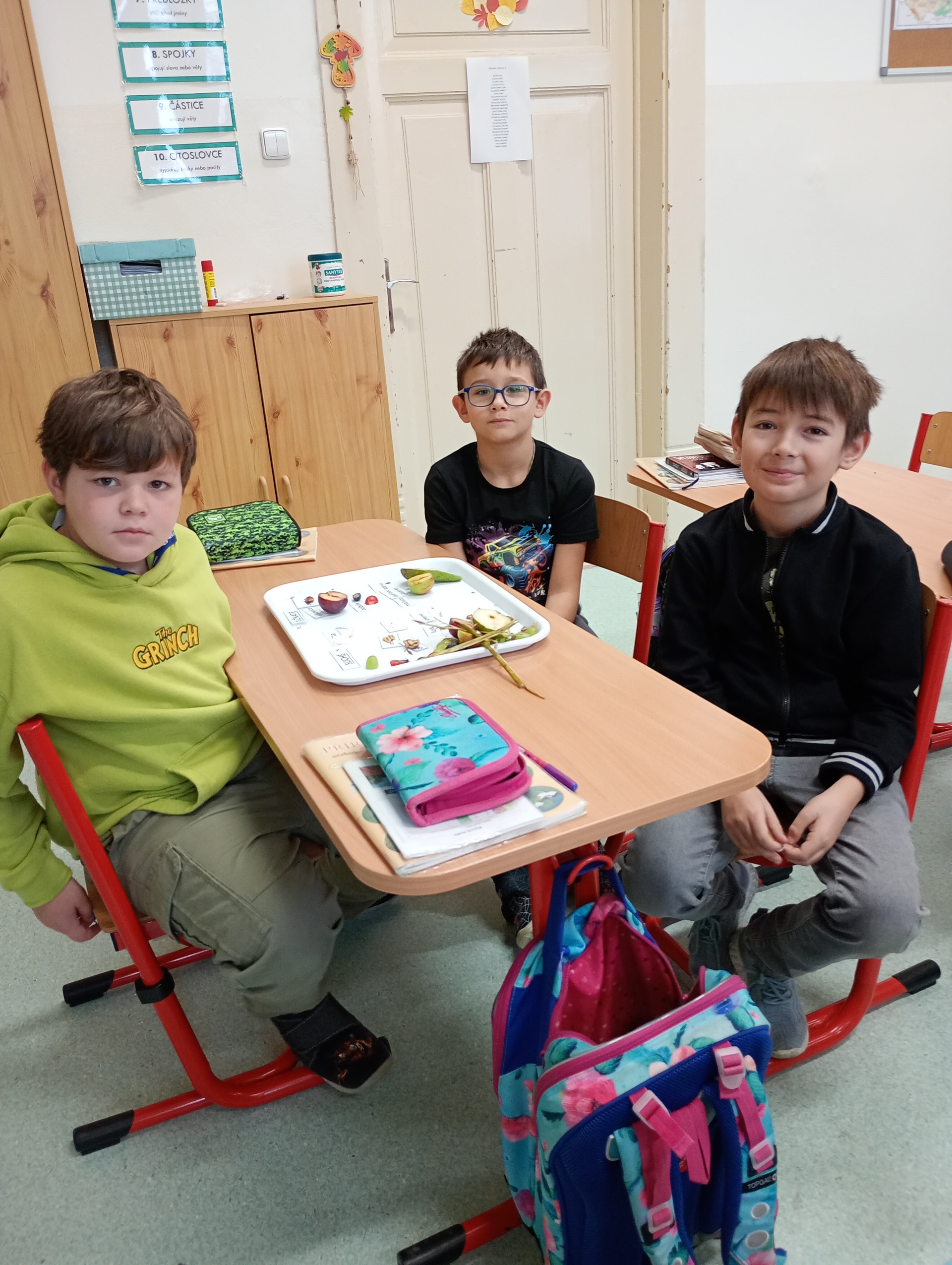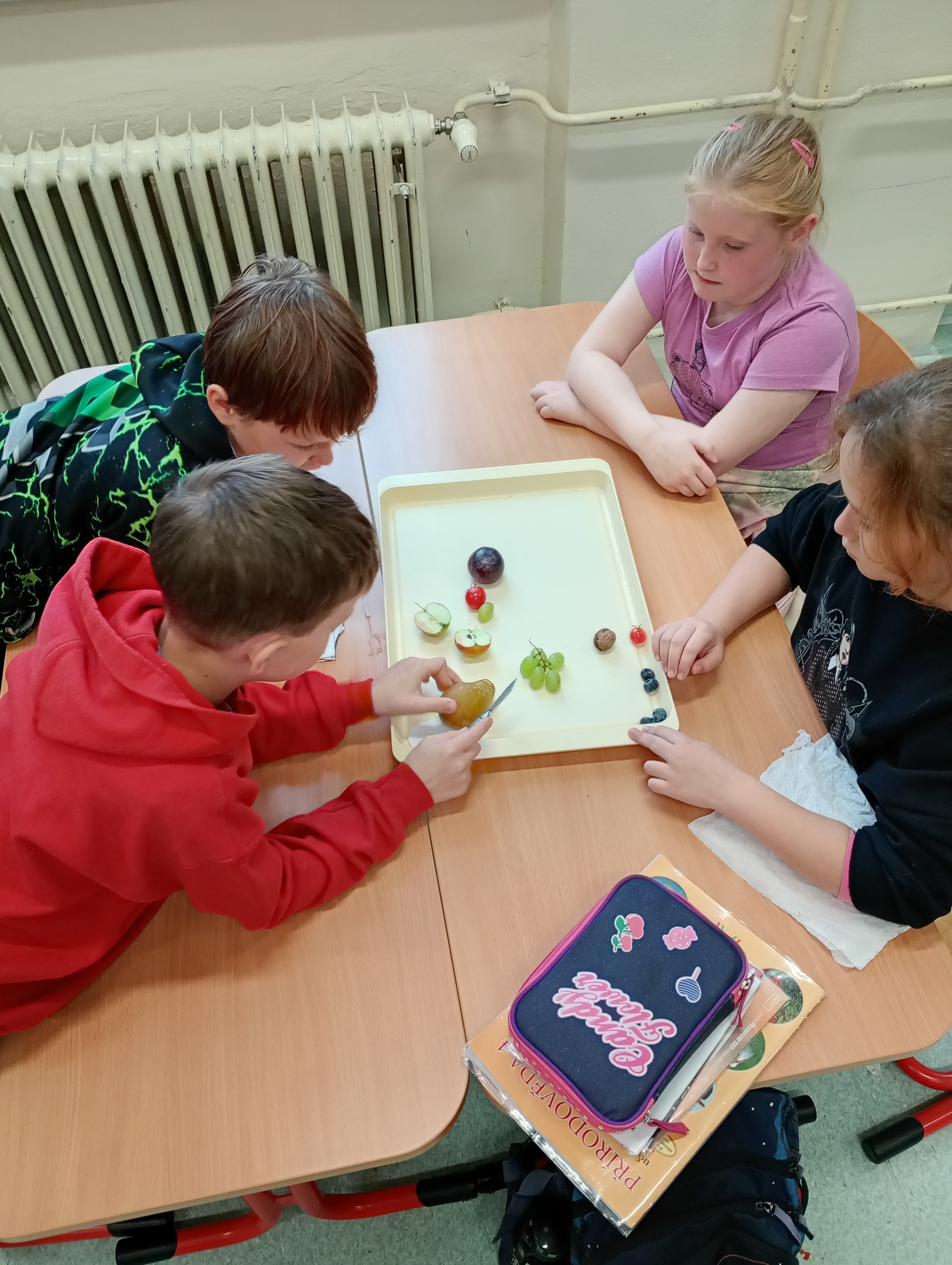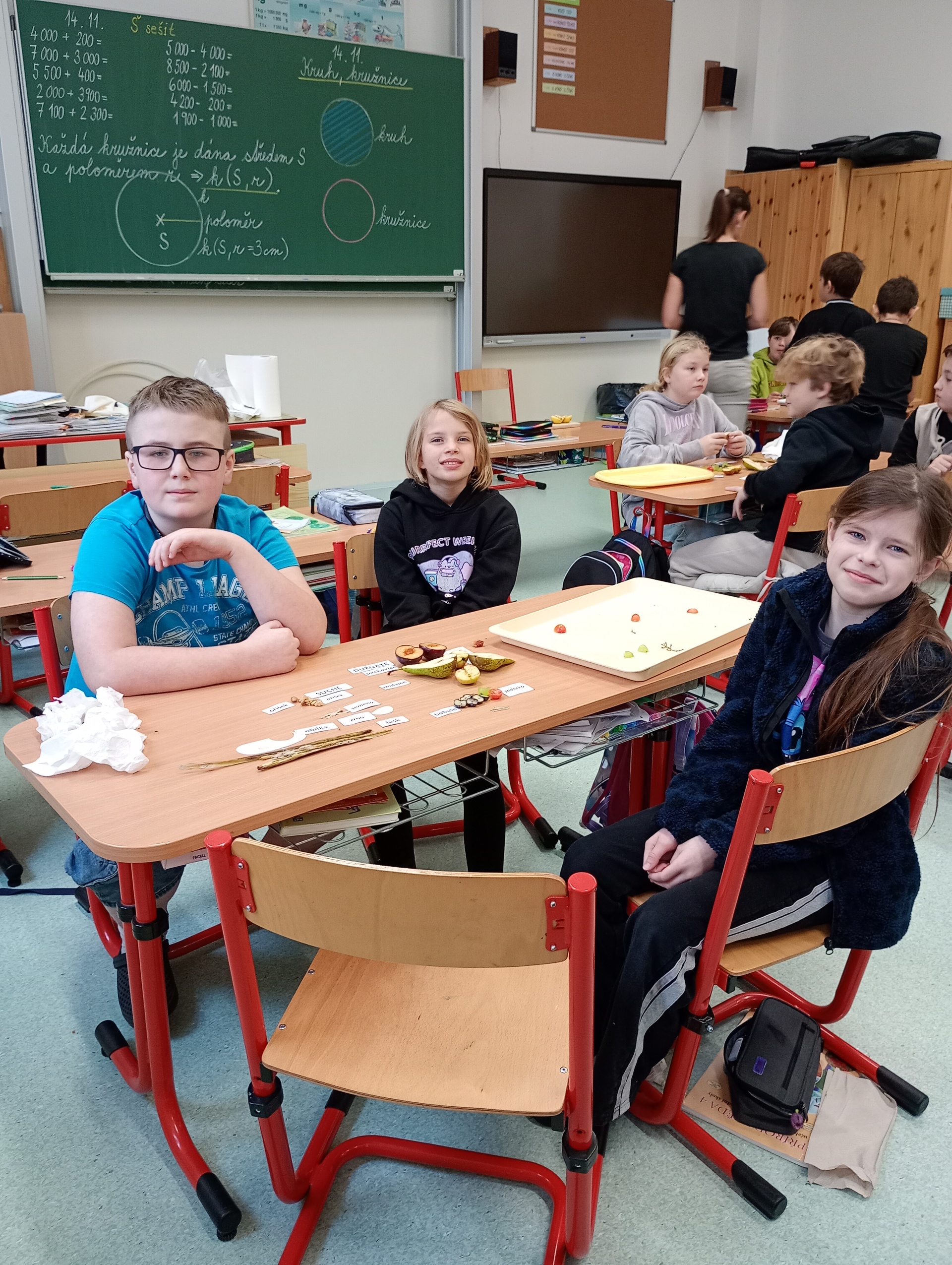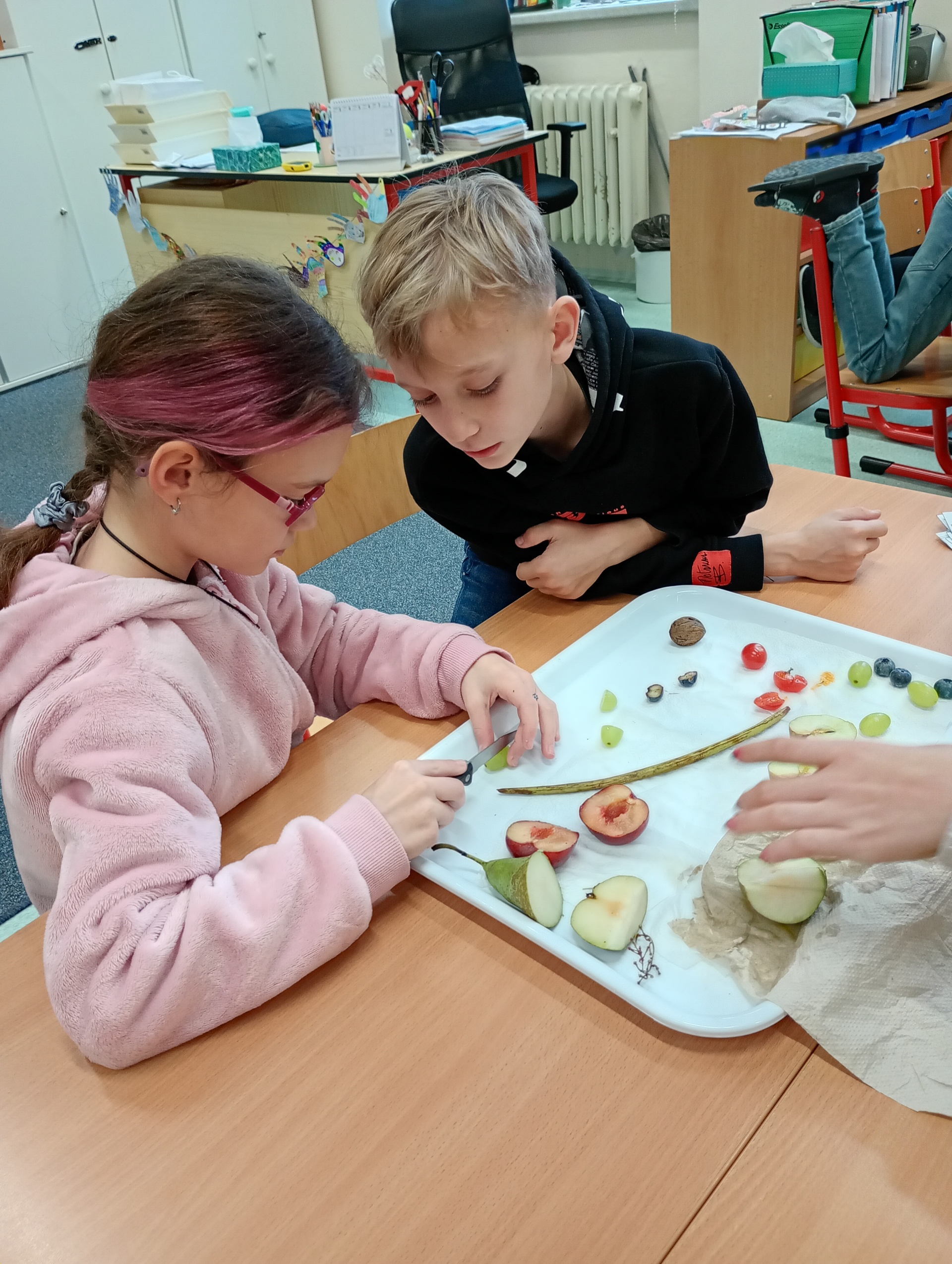 Proto si pro nás paní učitelka připravila různé aktivity, při kterých jsme se snažili zapojit co nejvíce smyslů. V hodině Tělesné výchovy jsme cvičili s ortopedickými podložkami, na kterých jsme zkoušeli různé cviky k posílení kotníků a kolen, ke zpevnění středu našeho těla i příjemnému promasírování nohou. V Matematice jsme si zahráli různé hry k procvičení probíraného učiva a v Přírodovědě jsme probírali typy plodů. Zkoumali jsme, jak ovoce vypadá uvnitř, jakou má chuť, zda obsahuje dužinu nebo je to plod suchý.
