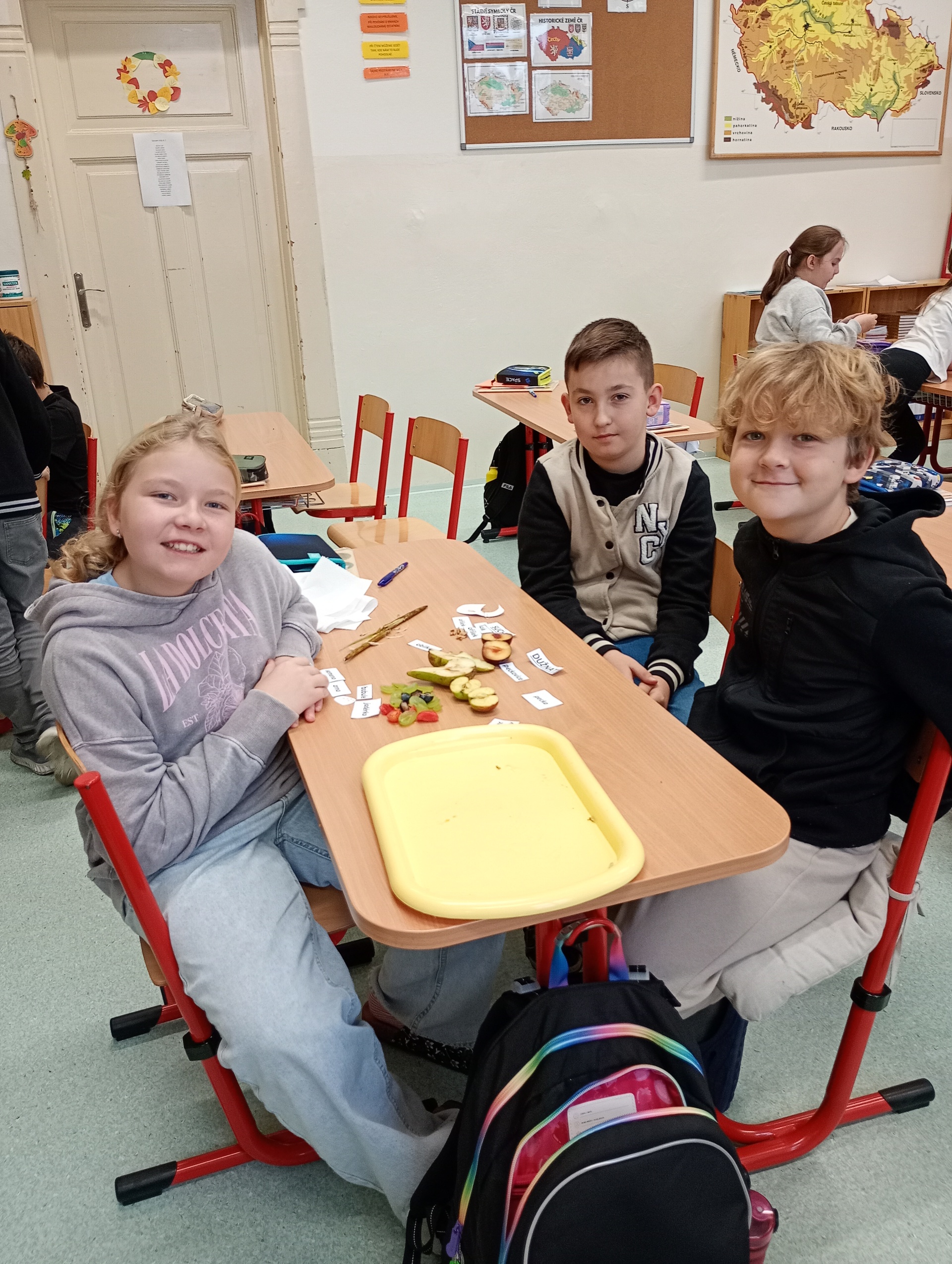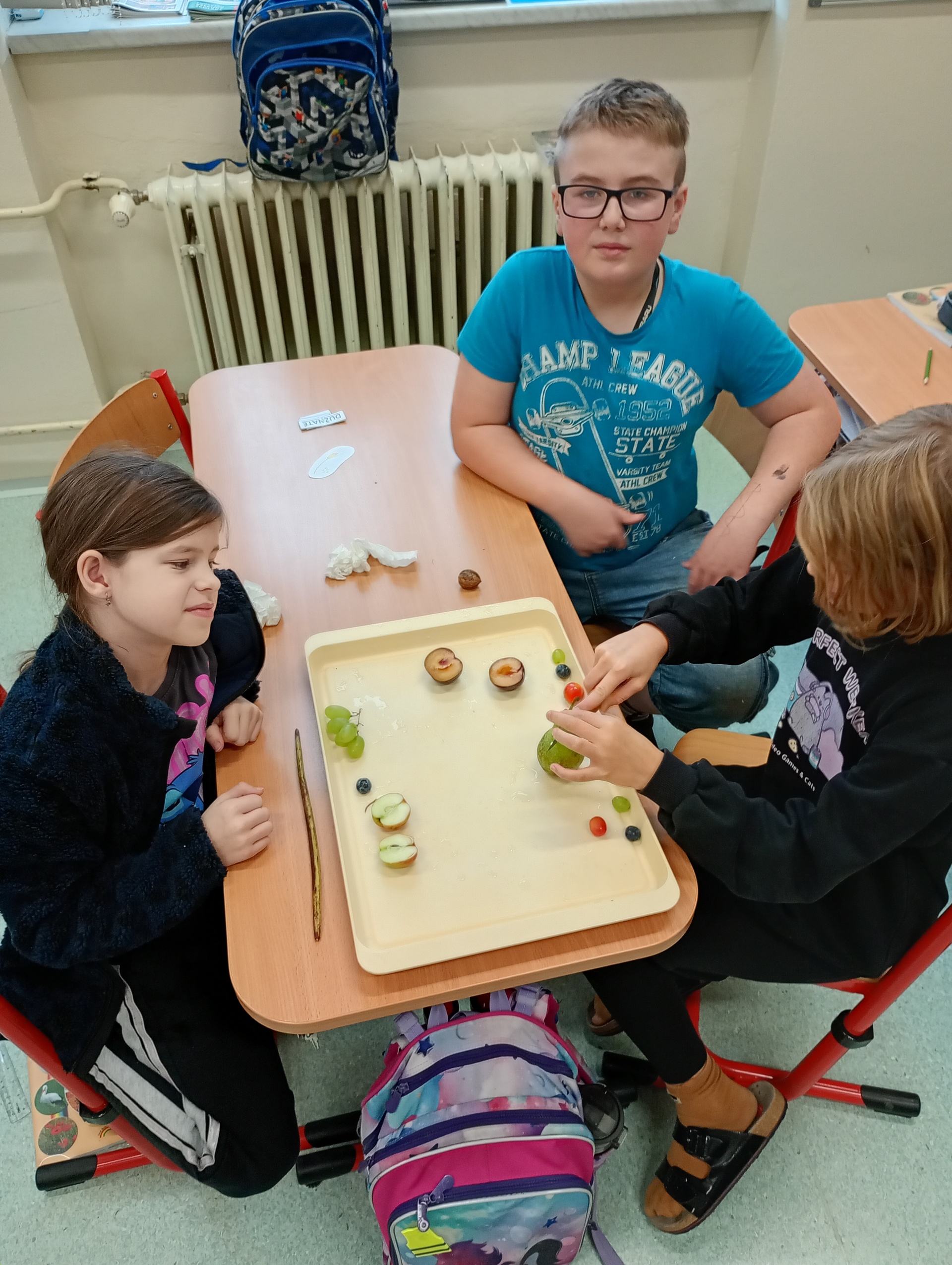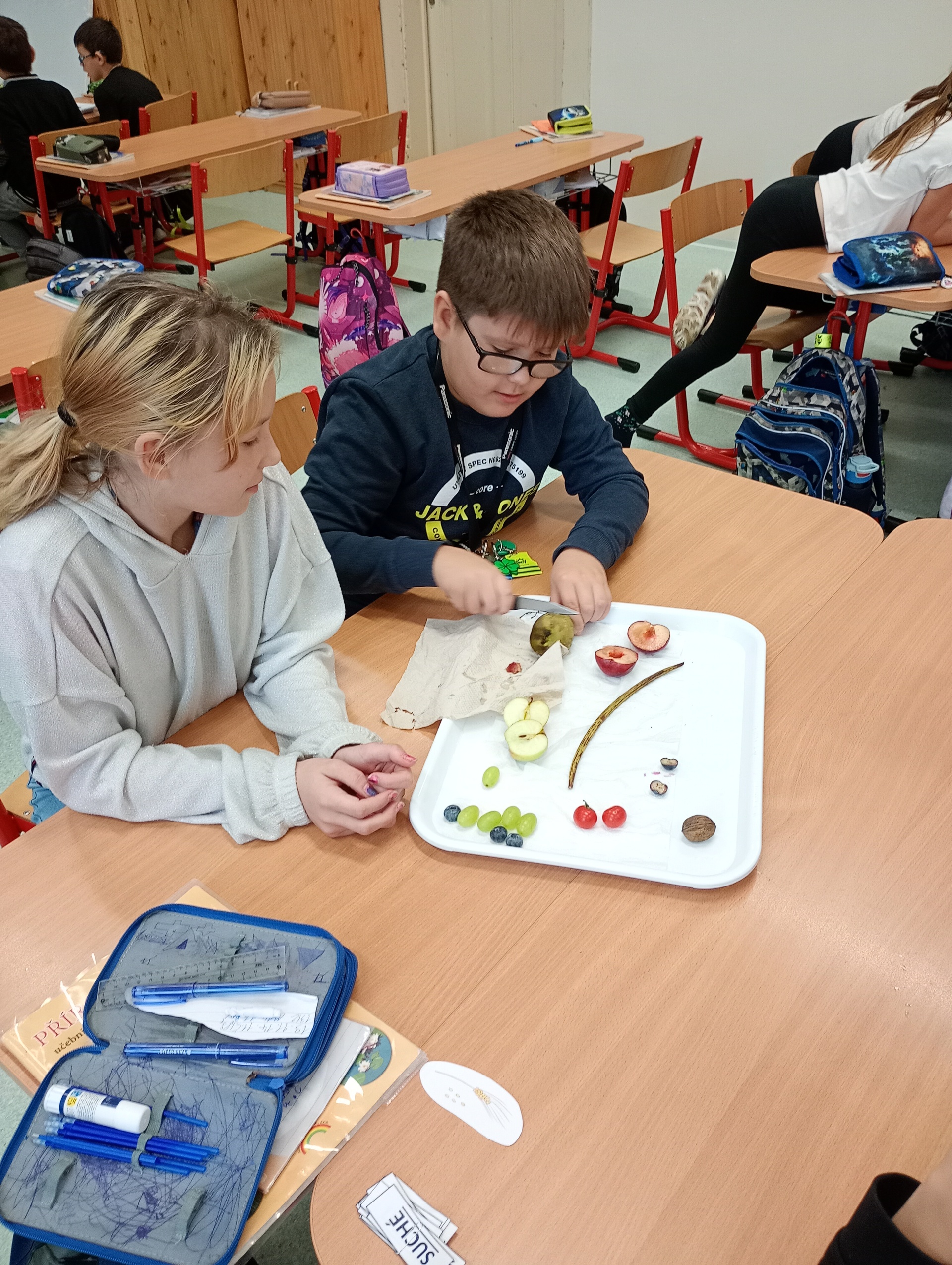 Proto si pro nás paní učitelka připravila různé aktivity, při kterých jsme se snažili zapojit co nejvíce smyslů. V hodině Tělesné výchovy jsme cvičili s ortopedickými podložkami, na kterých jsme zkoušeli různé cviky k posílení kotníků a kolen, ke zpevnění středu našeho těla i příjemnému promasírování nohou. V Matematice jsme si zahráli různé hry k procvičení probíraného učiva a v Přírodovědě jsme probírali typy plodů. Zkoumali jsme, jak ovoce vypadá uvnitř, jakou má chuť, zda obsahuje dužinu nebo je to plod suchý.