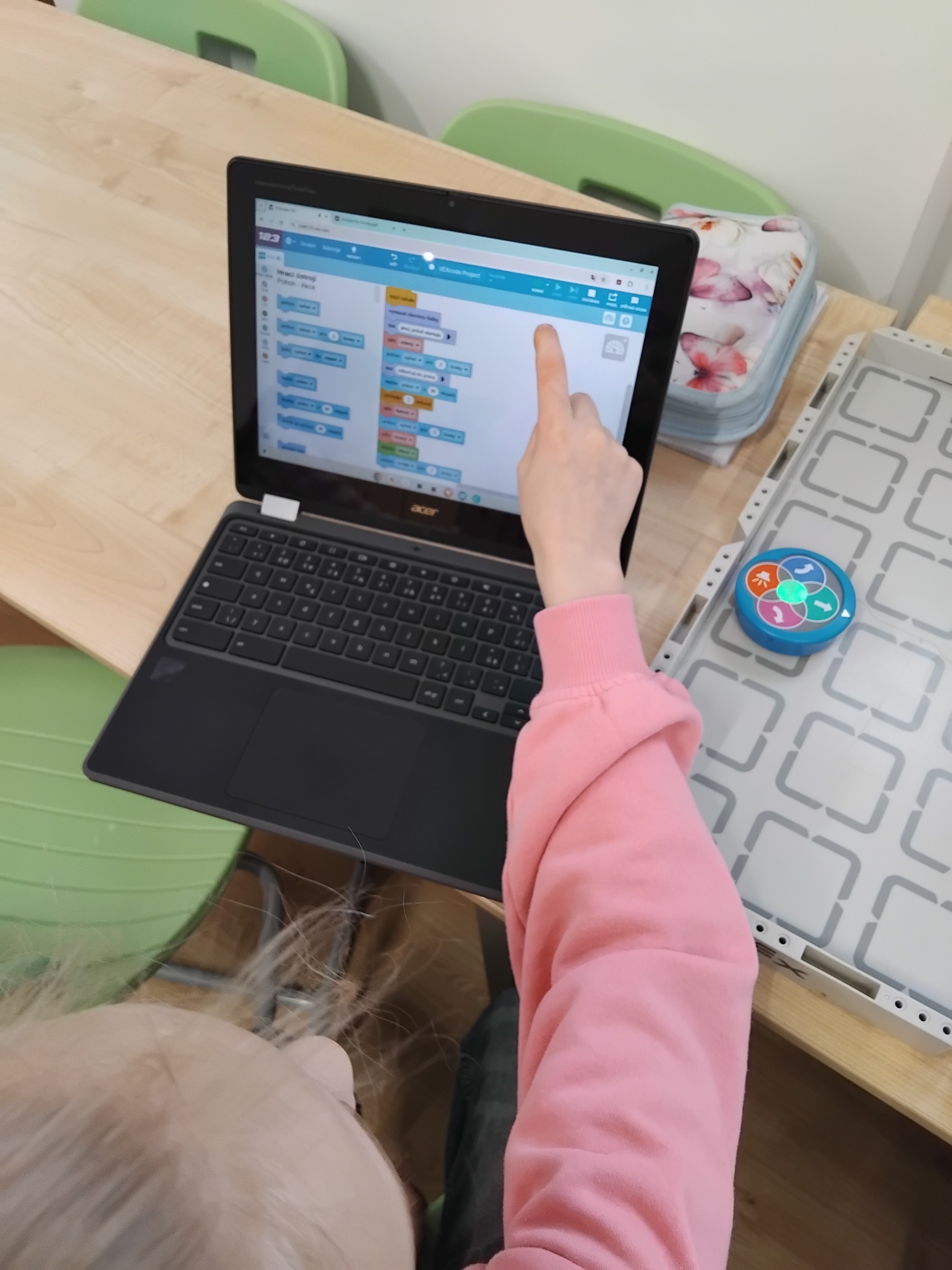 Pracovaly s barevnými bloky příkazů, které do sebe zapadají jako puzzle a krok po kroku sestavovaly sekvence pohybů, zvuků i reakcí robota.